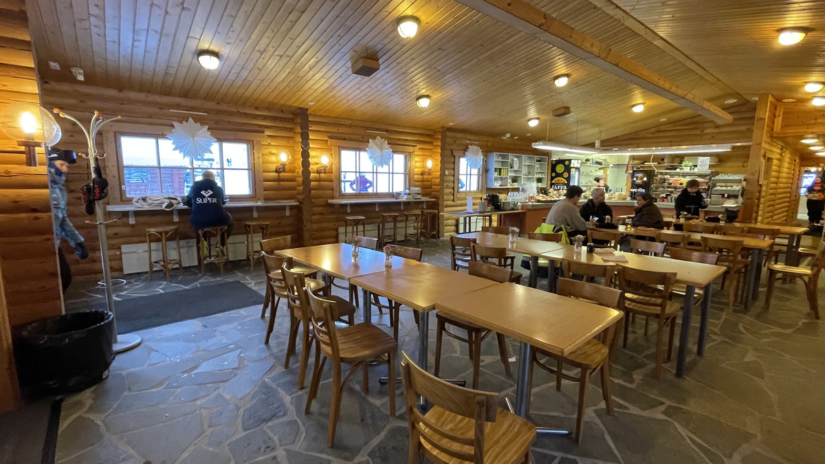 At the bottom they have a cafeteria and a rentals shop. The cafeteria has some snacks plus proper meals from a kitchen. By small ski resort standards it was remarkably spacious and nice. They also sell frozen high-quality meat, interestingly...