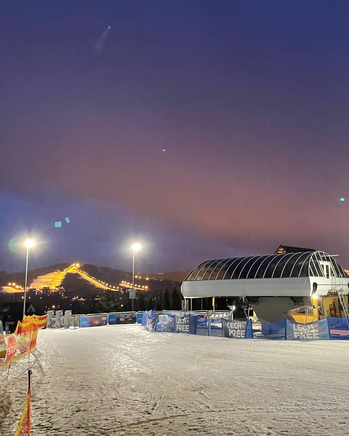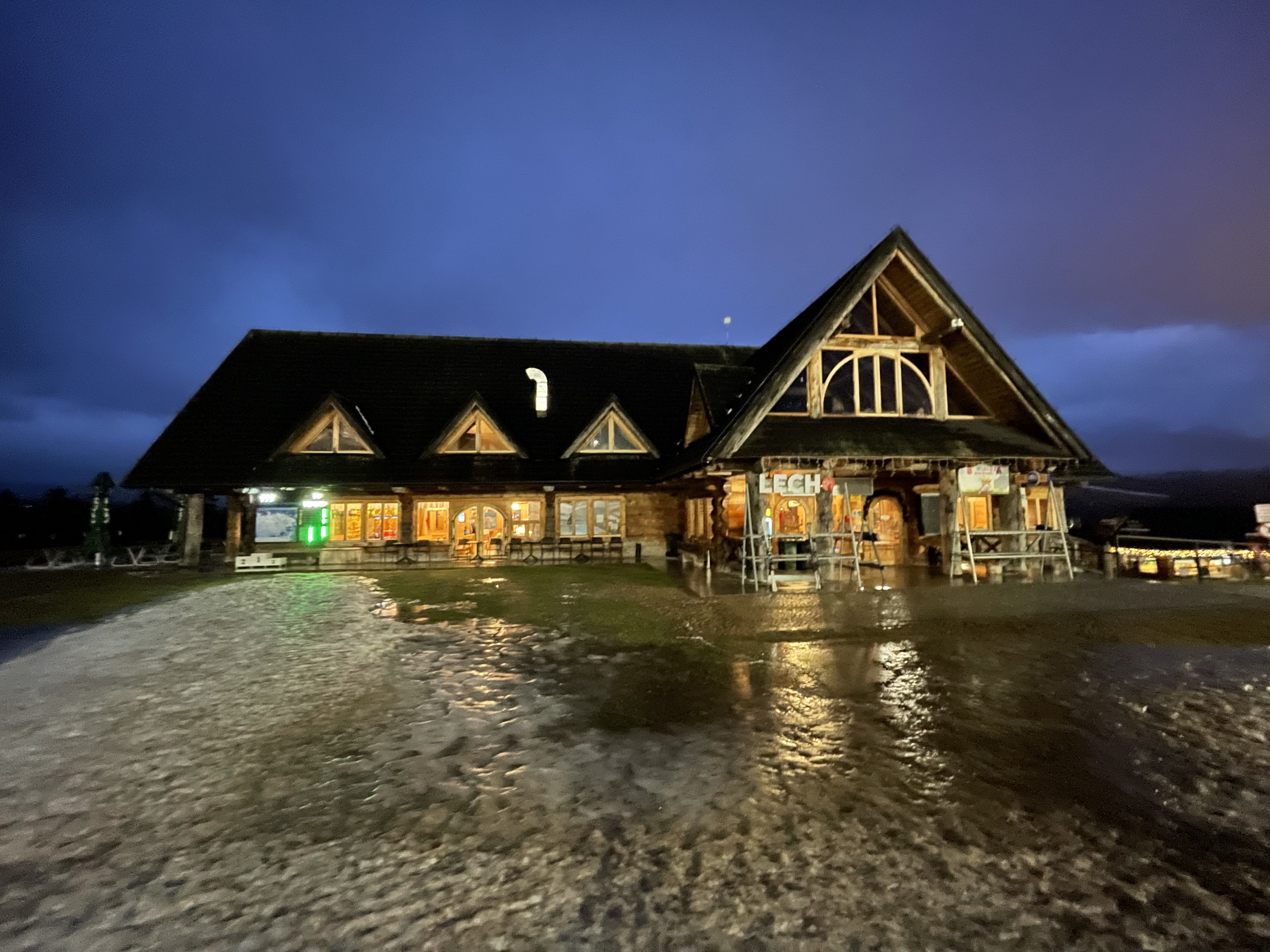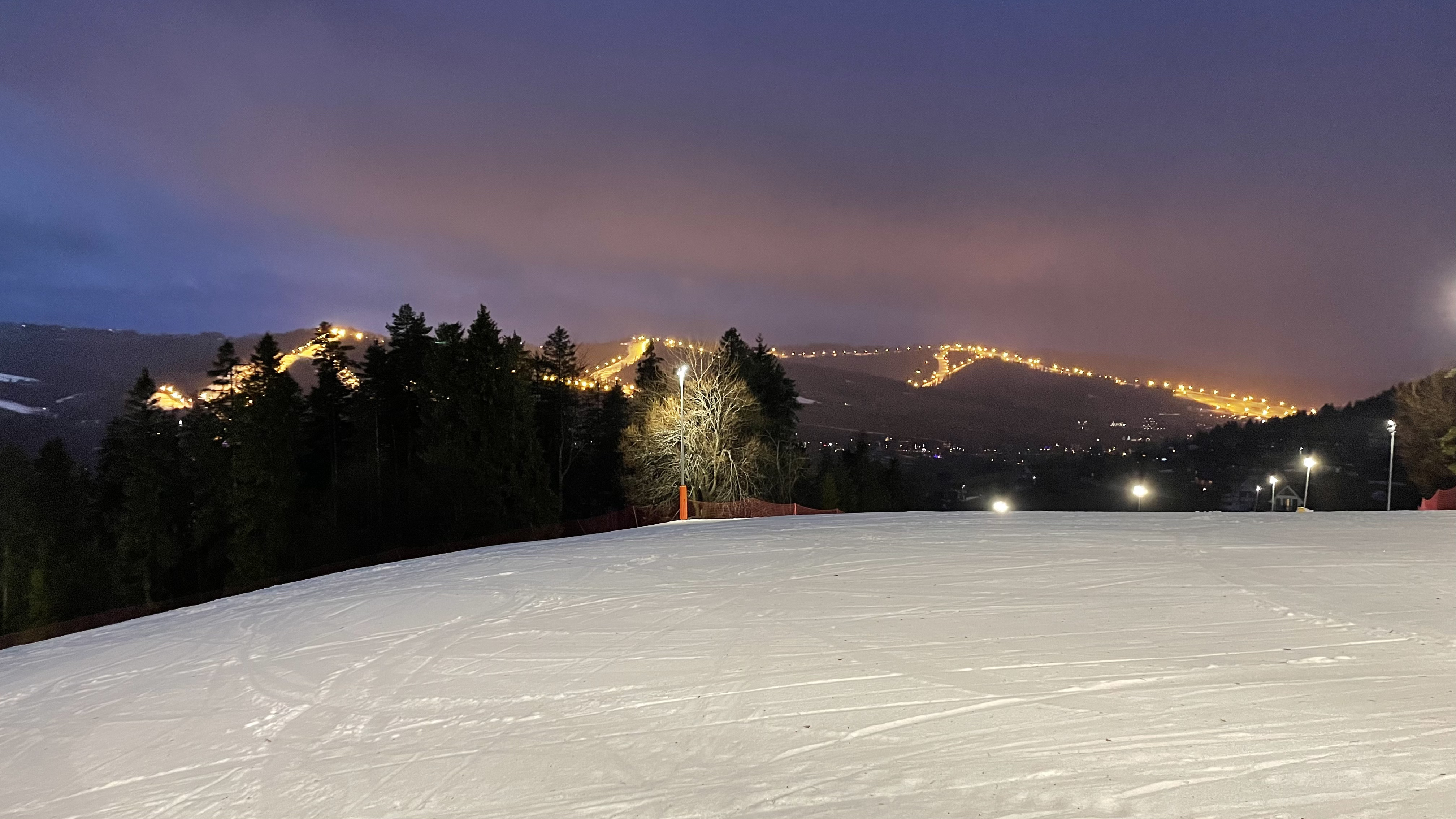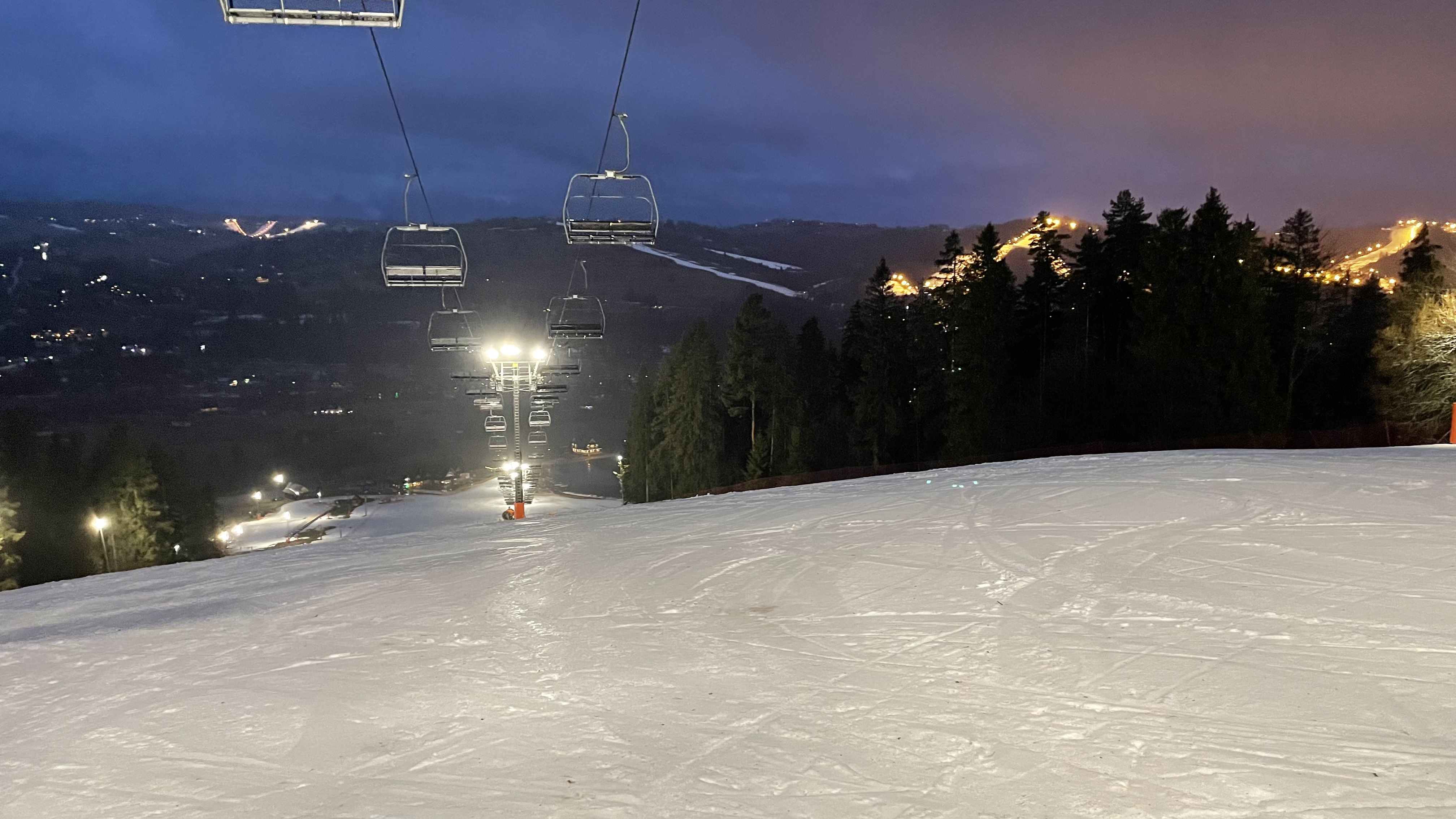 Their official name is Koziniec-Ski Sp. z o.o. Czarna Góra - Stacja Narciarska, but I have no idea what any of that means. But they appeared with their lights and ski lifts on from the wet darkness of miserable drive through rain and sleet as we were nearing Zakopane on our return trip from Slovakia. And I needed to ski properly in Poland. In 2011 I was on a through trip and managed to hike up a closed ski hill. Nice, but now I when had an opportunity to ski on an actual open and lit ski slope, I needed to take it!