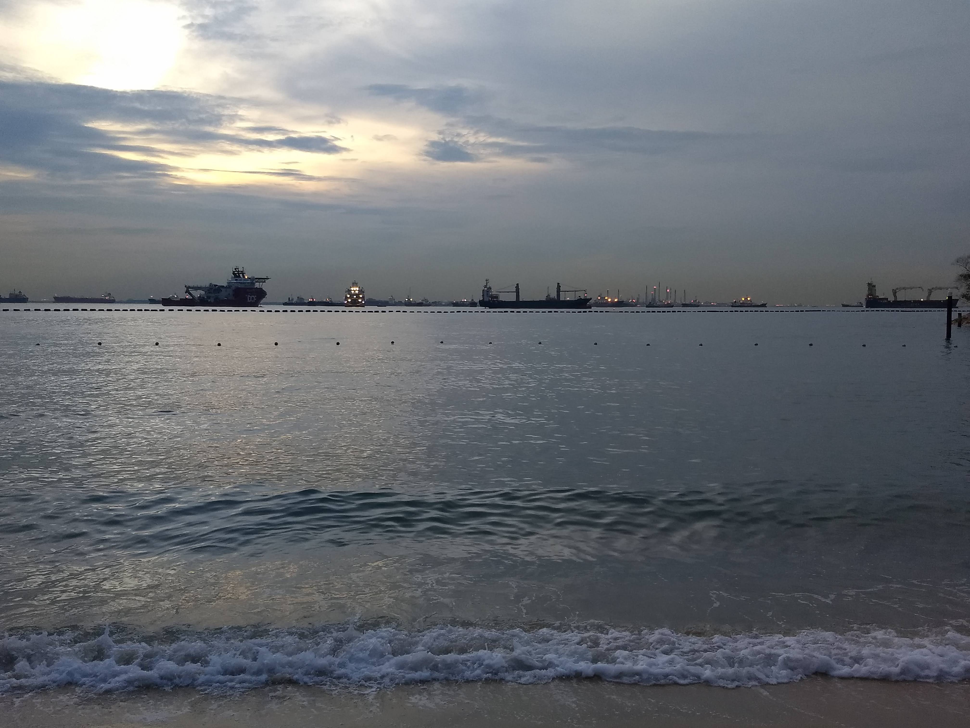 Sentosa can be reached by car over the bridge, by train, or by the cable car. Roundtrip tickets on the cable car are 25 local dollars. There's a number of hotel and public beaches on Sentosa, with fun views to the massive shipping traffic to and from Singapore.
