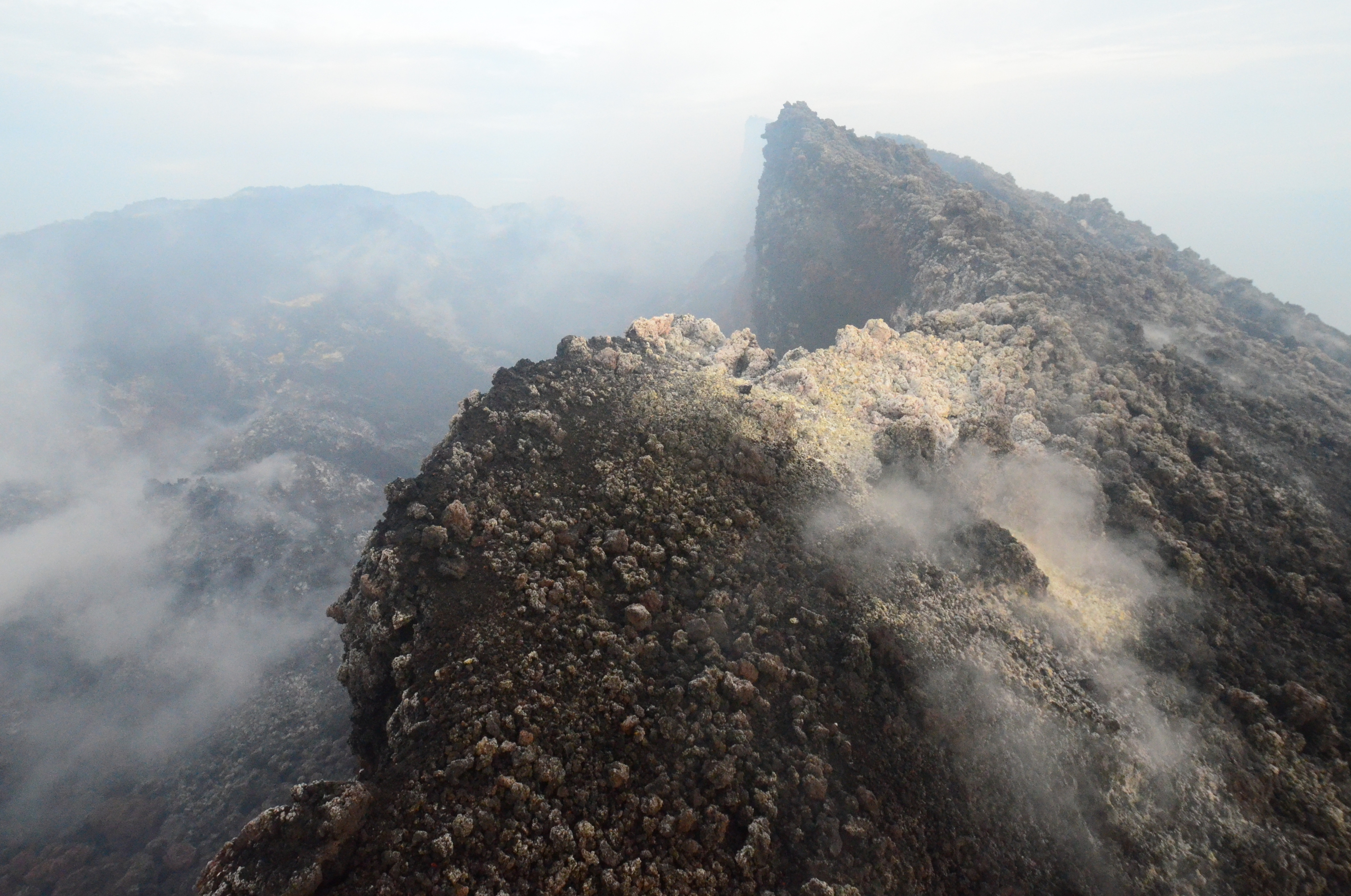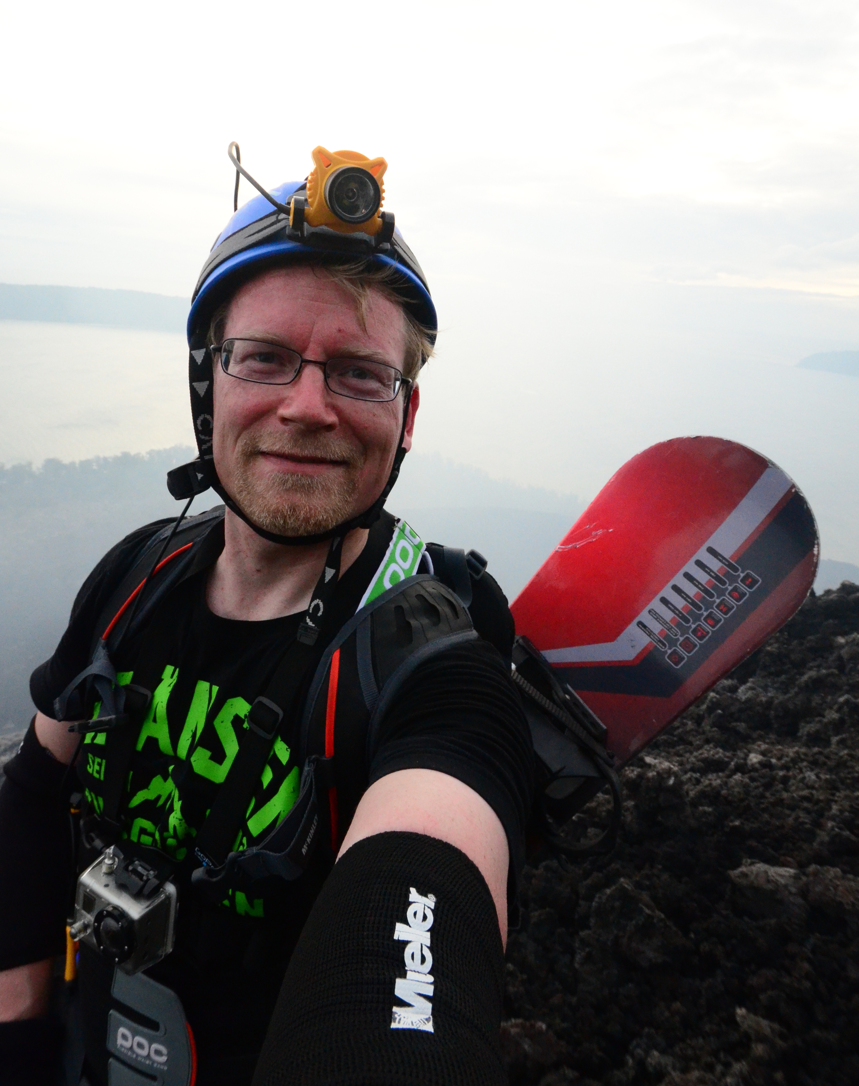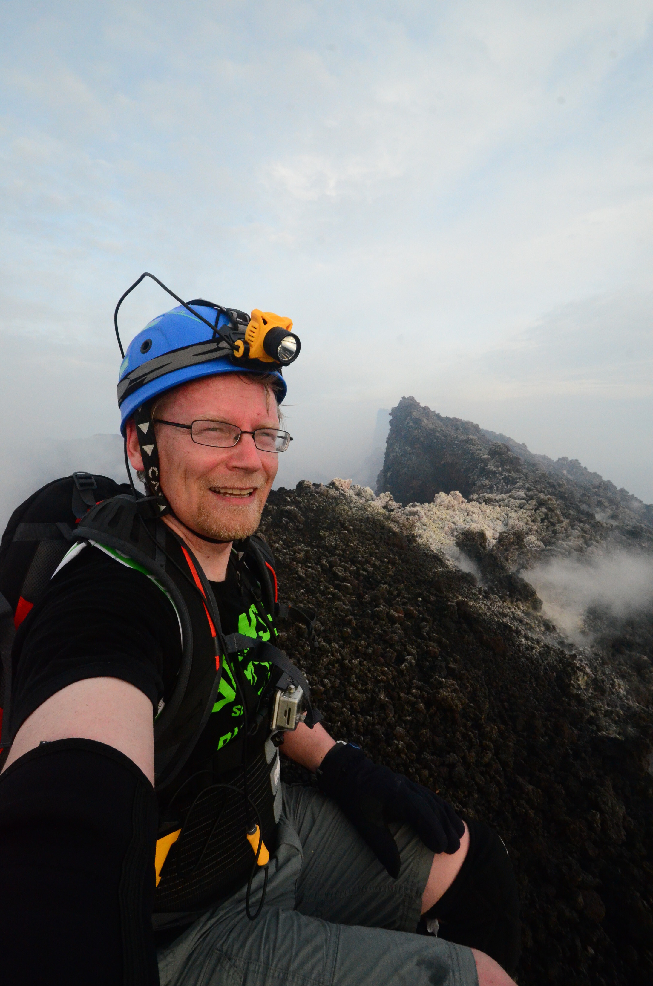 But it is still difficult. My first attempt fails, as I can not make progress, every step up brings me down more. The next day we make a second attempt, starting in the darkness at 4:30am. I choose a different, more rocky route. Now I can make progress, and after an almost hour on the upper face I reach the top at sunrise. The crater wall goes up steeply, and then falls vertically into the crater. The entire mountain looks shaky. And what is more, the fumes coming from the ground and now the crater itself are starting to get to me. I have a breathing mask, but it is time to get out, and fast.