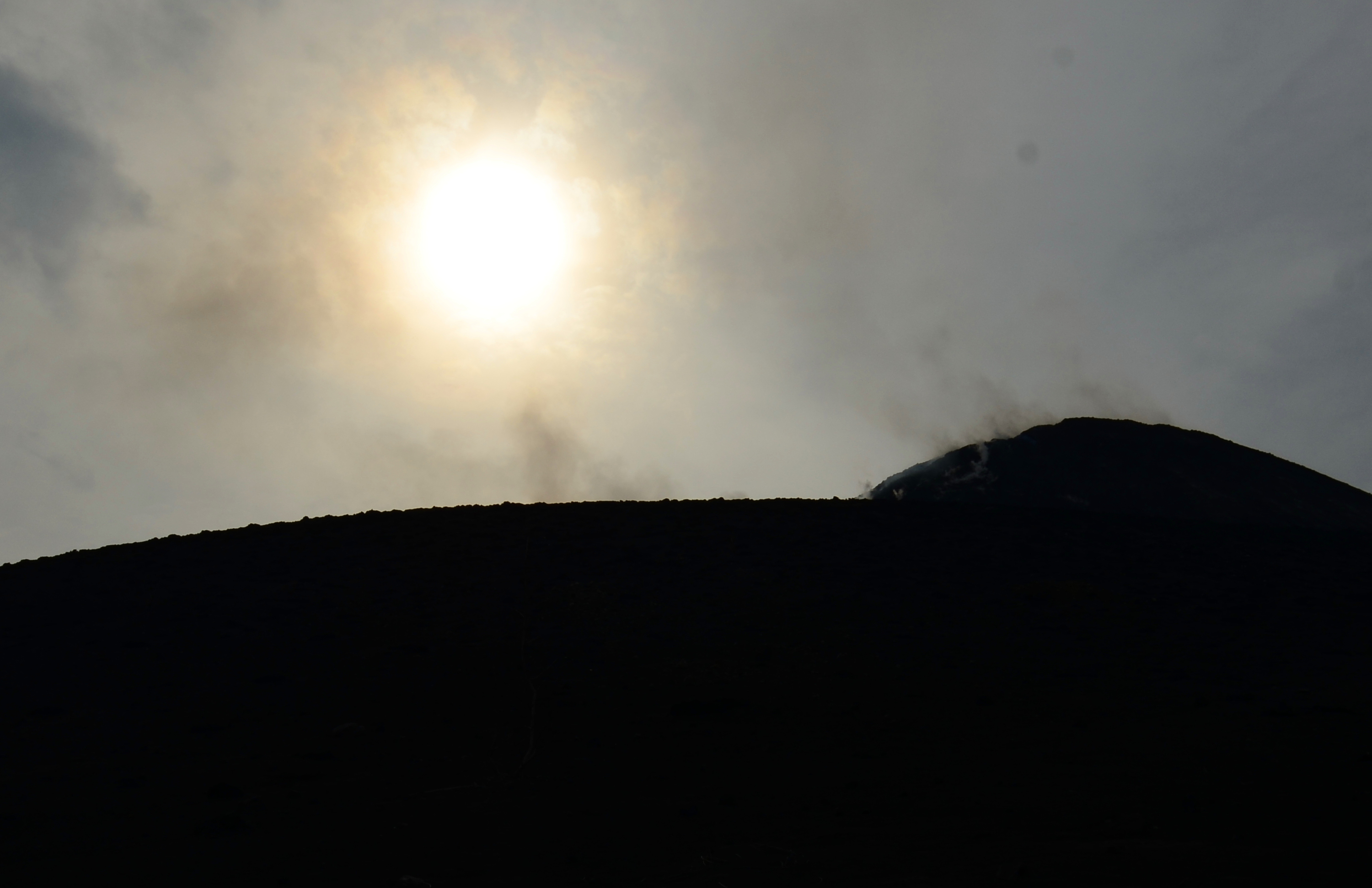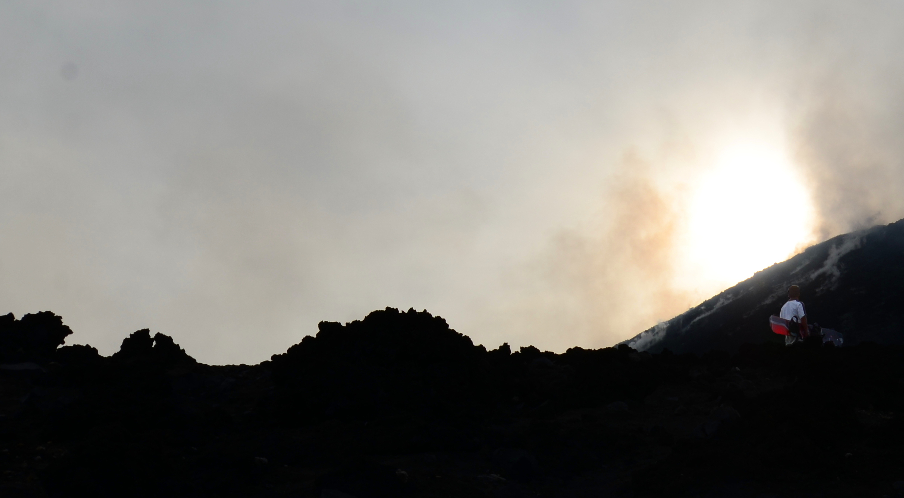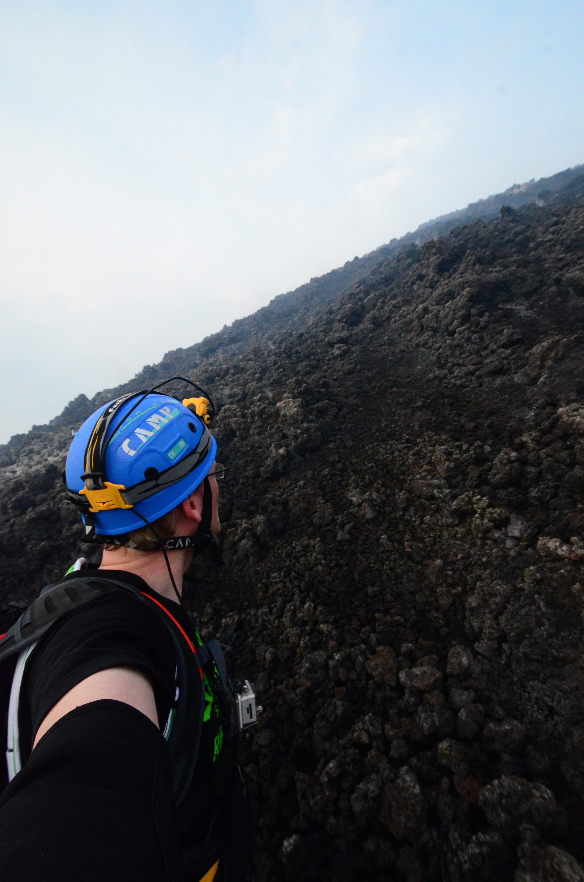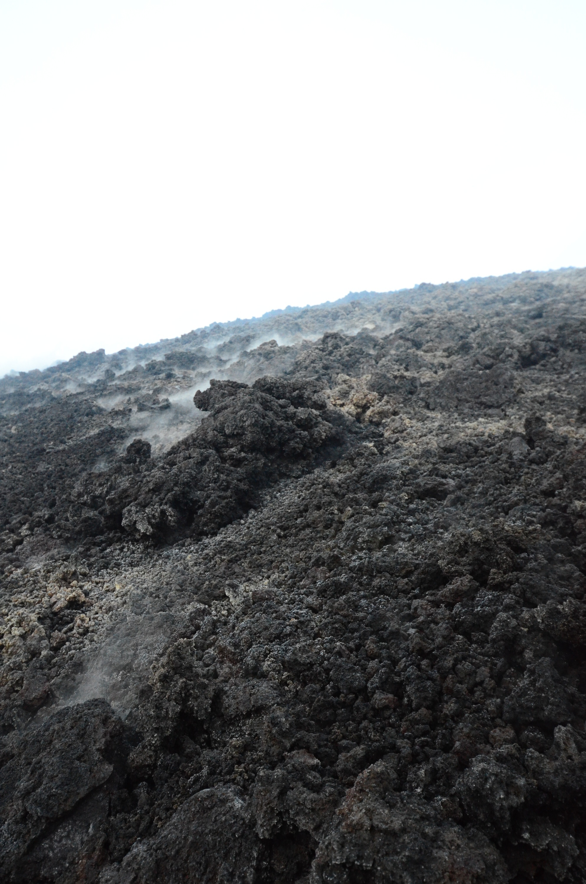 But then the going gets tough. New stones thrown out of the volcano form a thick, loose layer. I'm in danger of causing a rock avalanche on every step. Ordinarily I'd be wary of climbing alone, but now I'm glad that I left my guides to follow my ascent from safe point. I do not want to send stones towards my climbing partners.