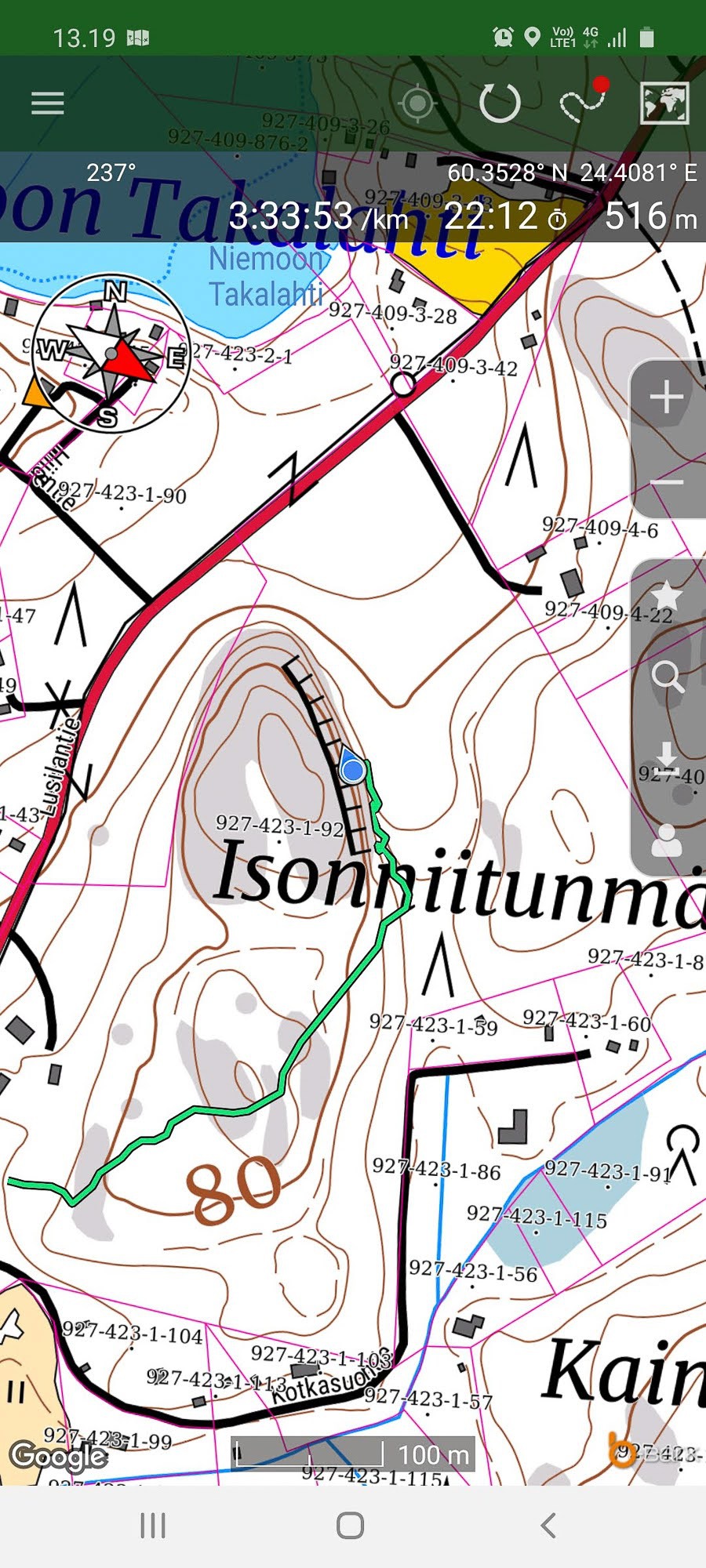 I had taken the shorter, upper route and he took the lower route. The forest here is pretty thick, and it had been rainy, so going through the lower parts of the hill was quite a lot of wet work :-)