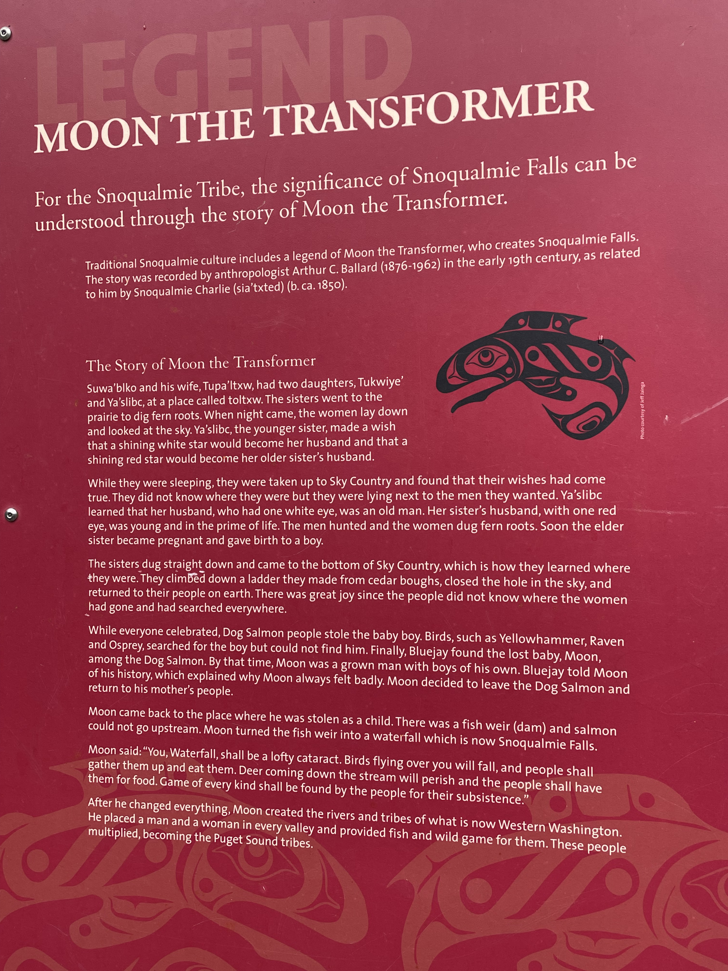 The land was also owned by them (I think), but in 2007 the Muckleshoot tribe purchased the land surrounding the falls, and planned to develop the area with a hotel and homes. Arguments about building on this land that was sacred to the Snoqualmie people ensued. The place is a burial site and the location for their fabled history, "the place where First Woman and First Man were created by Moon the Transformer".