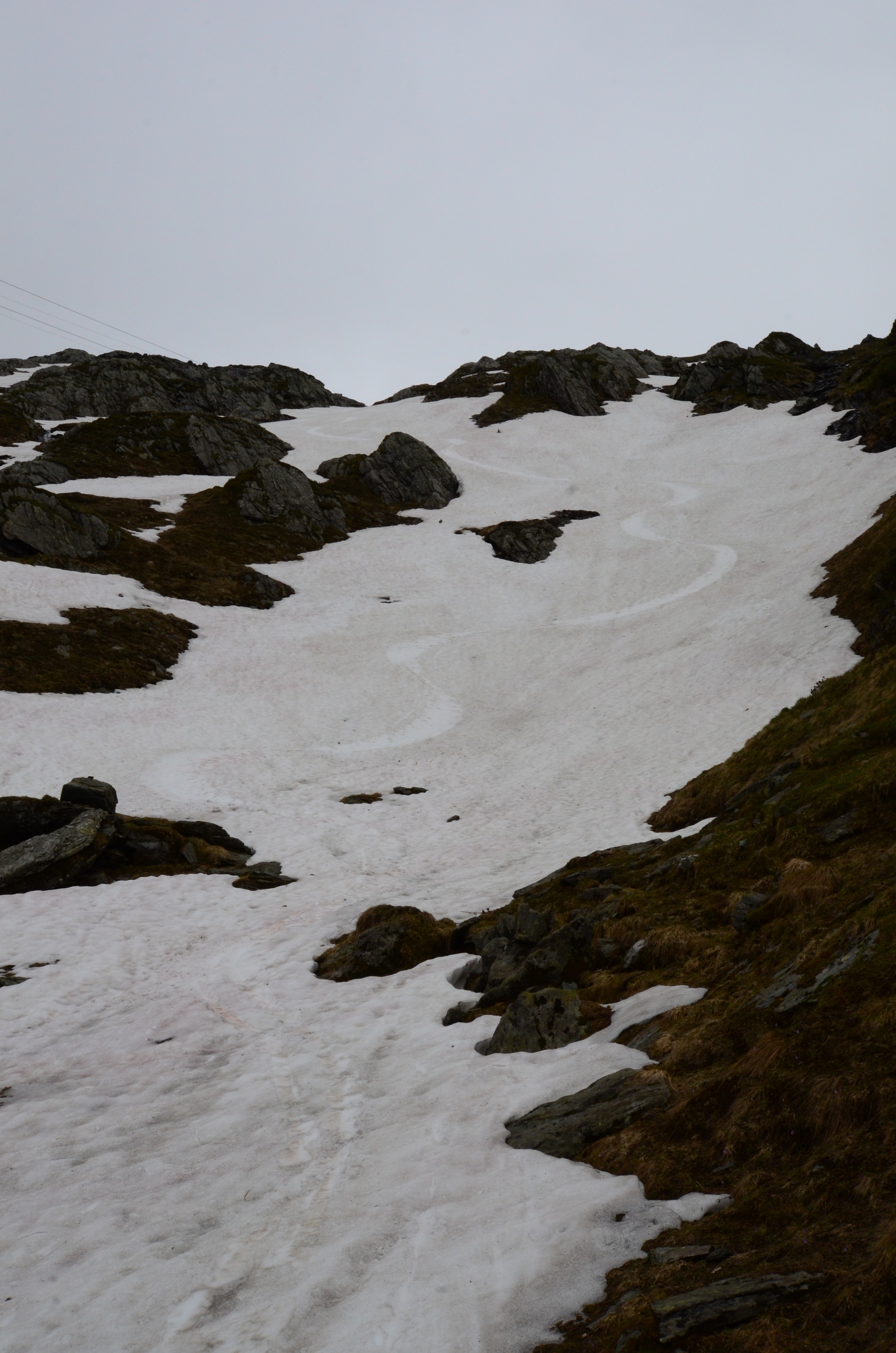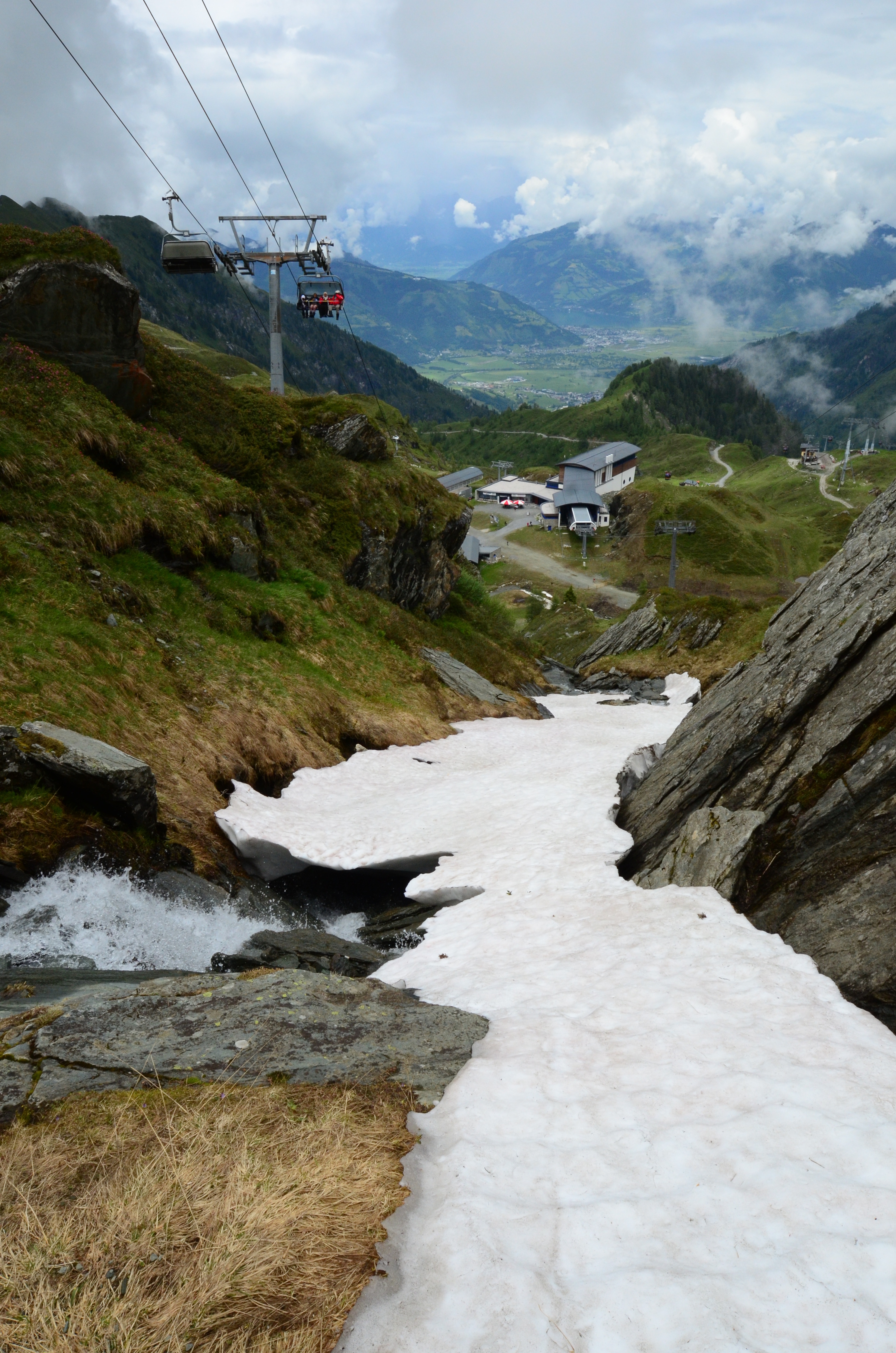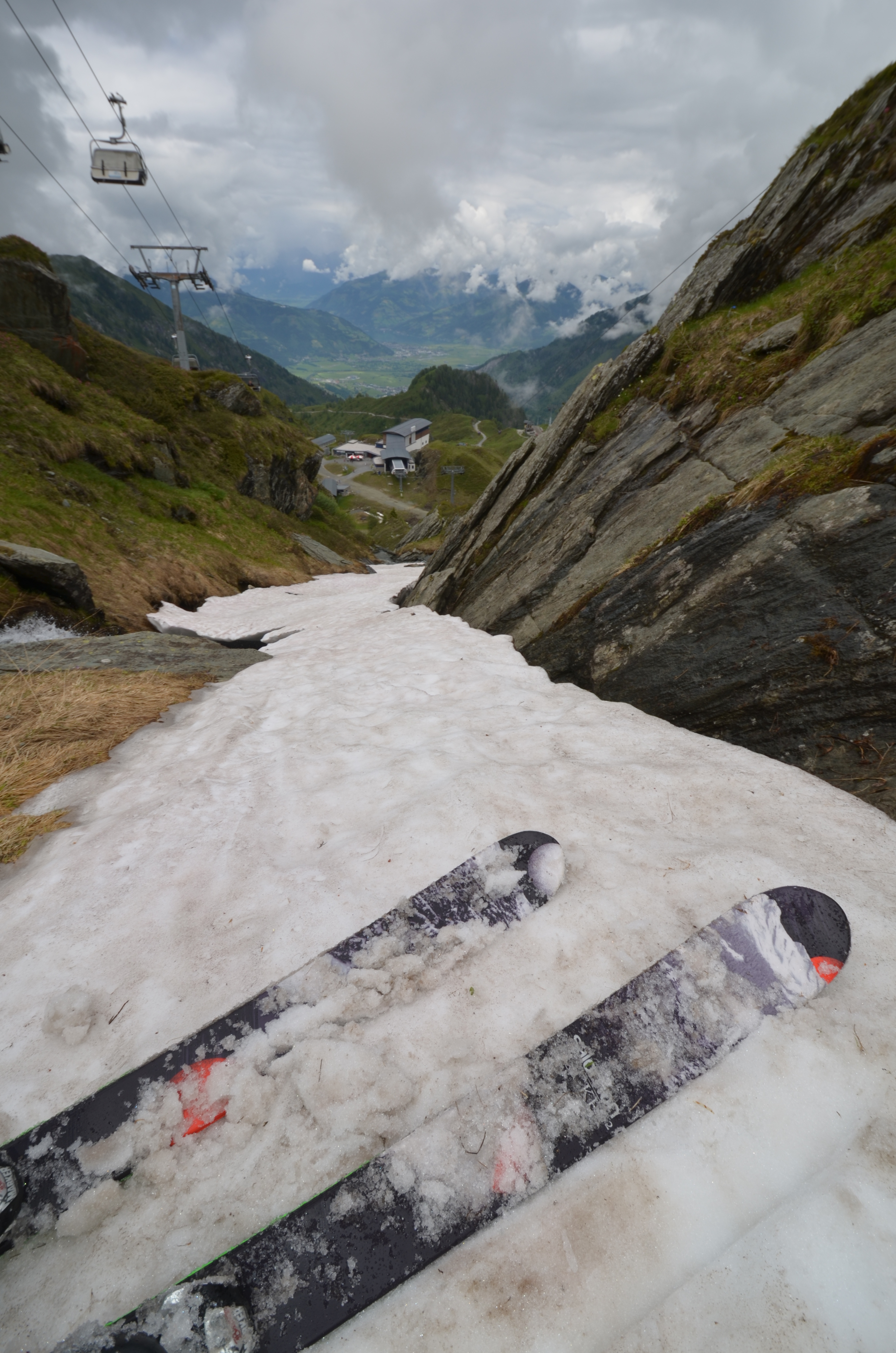 I wanted to ski all the way down to the station at 1976 meters. The only trouble was that there really wasn't much snow left. The ski patrol advised against it. The route looked nasty from the ski lift, and I'd have to walk quite a bit. No matter. There was a stream running through a steep gully that still had some snow left.