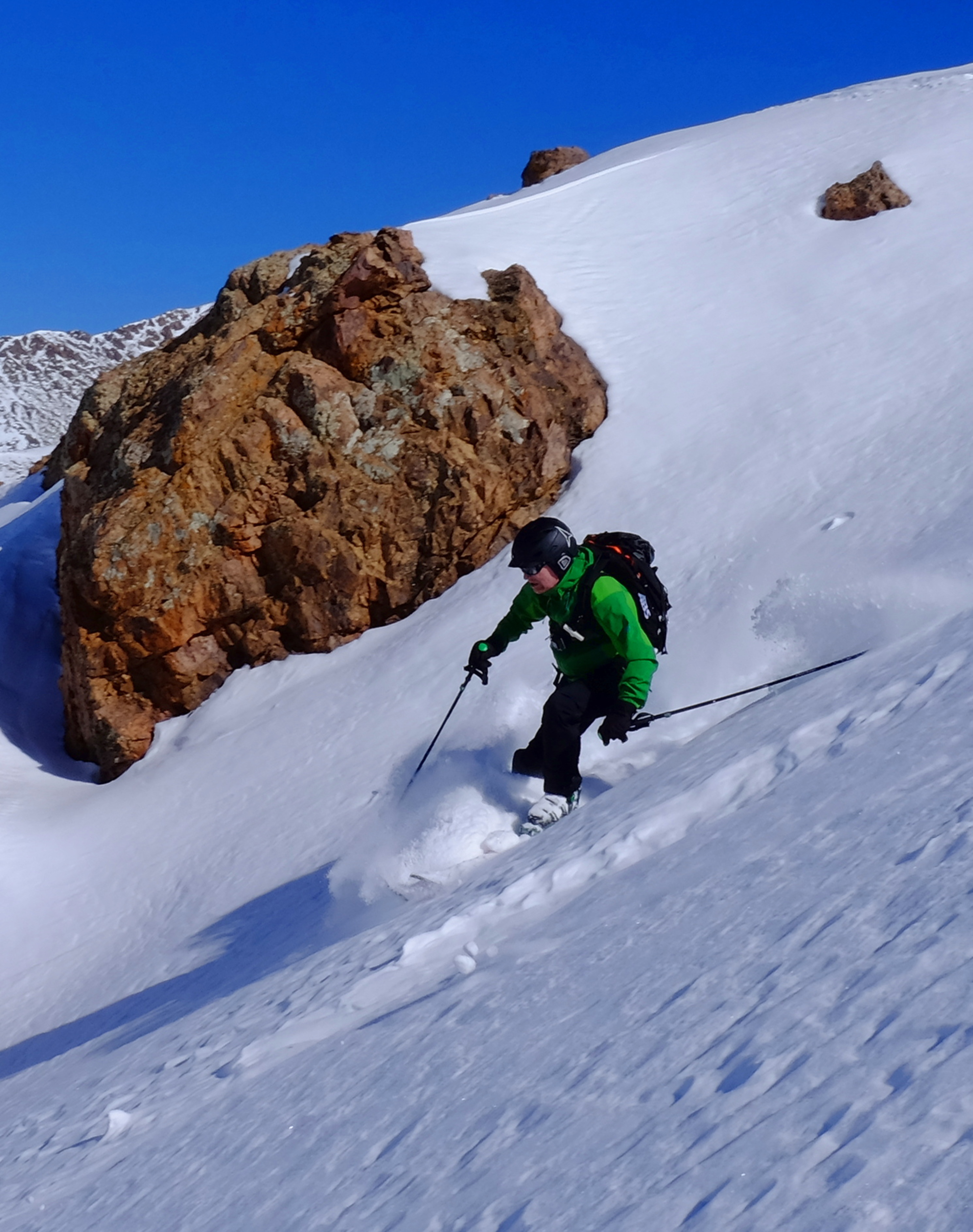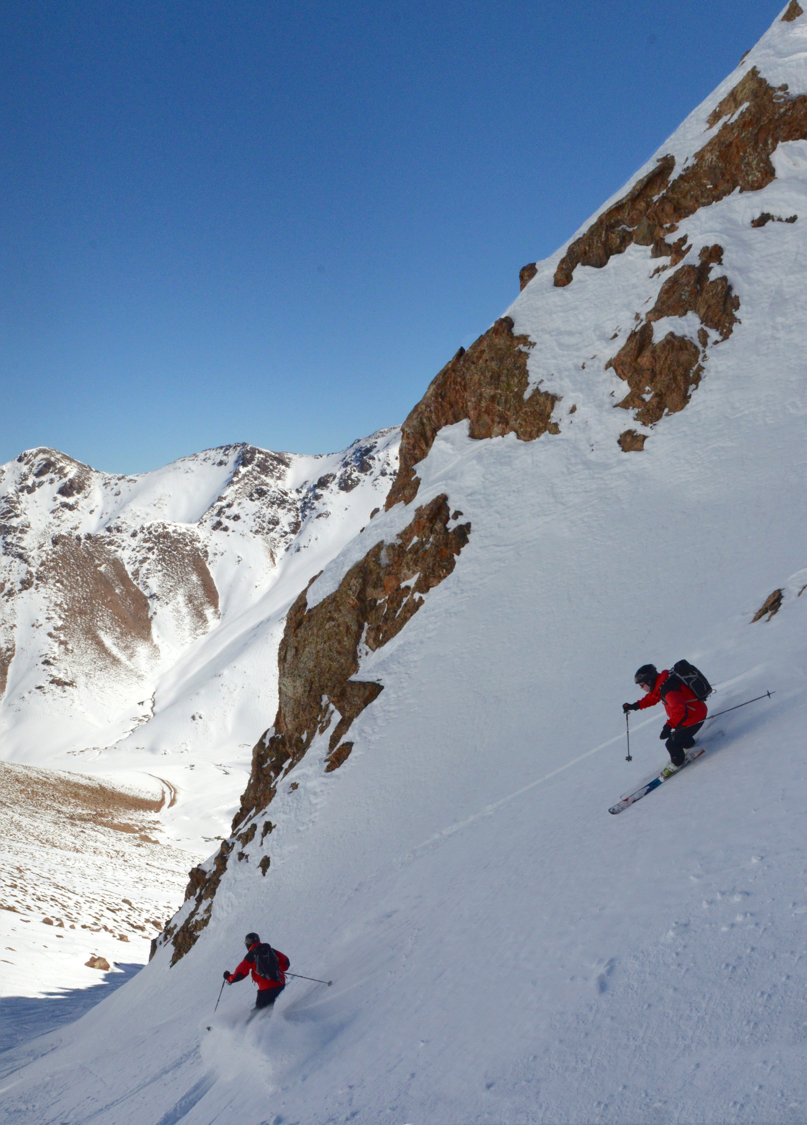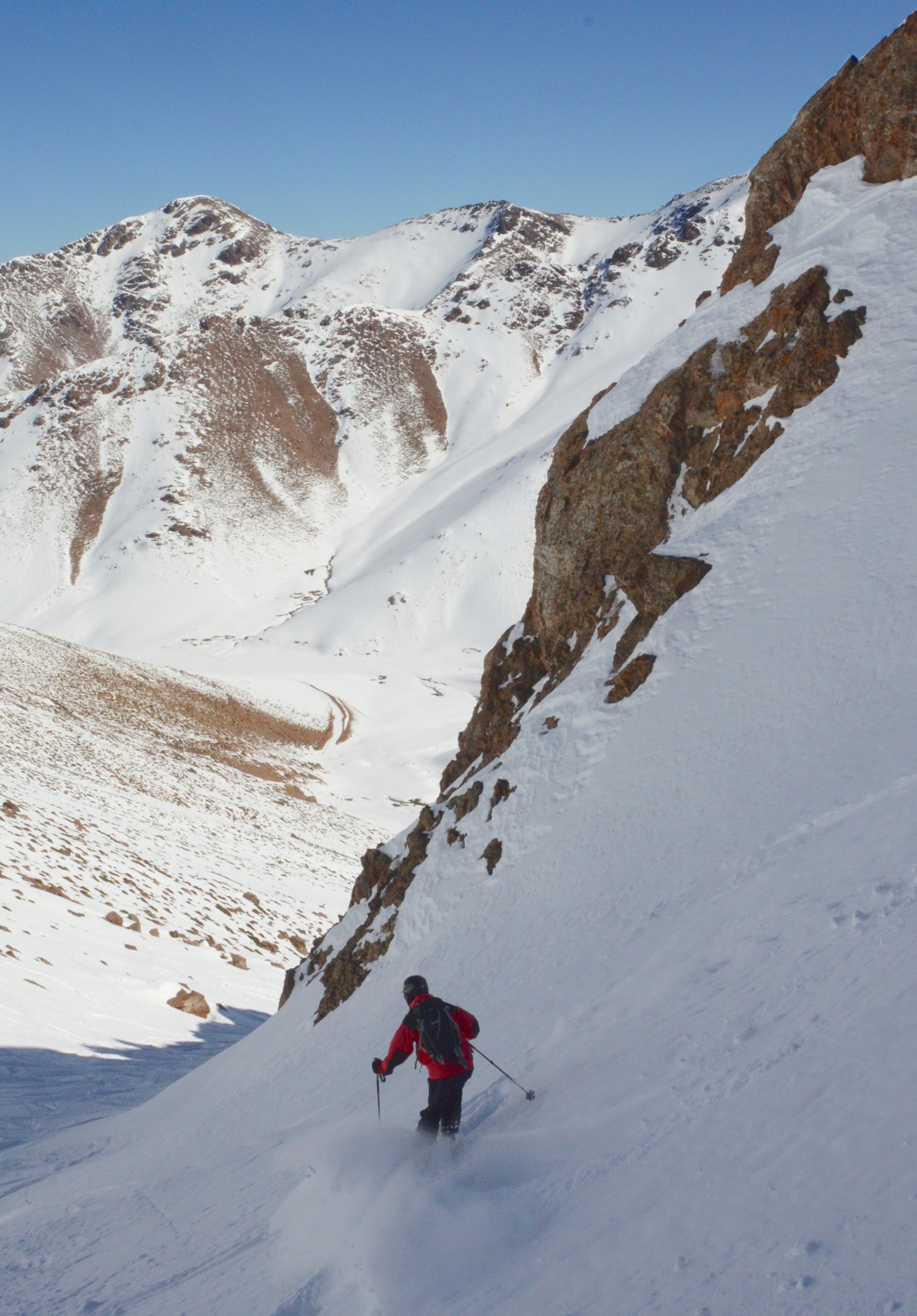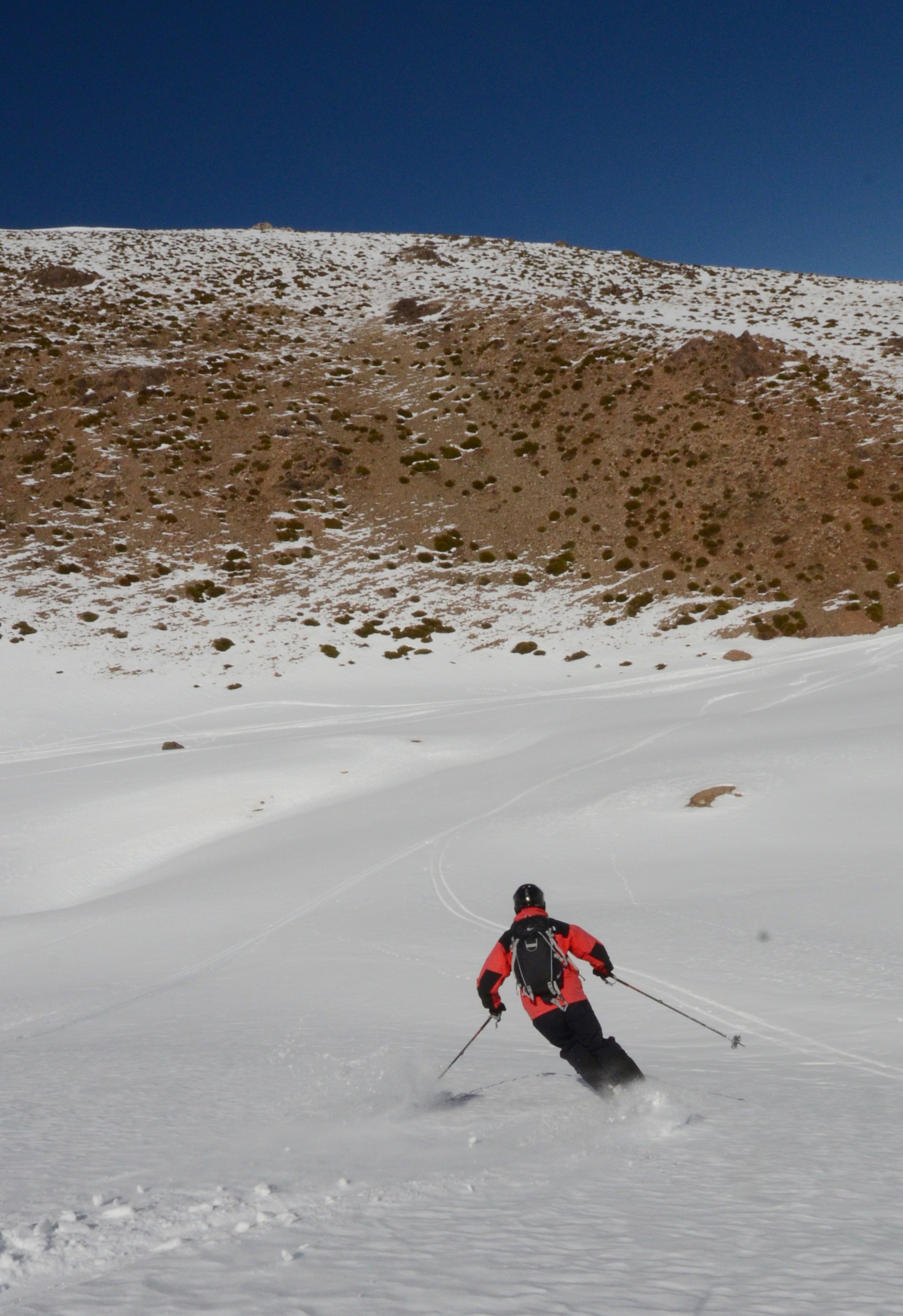 But lets get back to the main topic: skiing. The Atlas mountains are some serious mountains, ranging all the way to the 4,167 meter Toubkal, visible from the ski area. We skied nearby, in the ski area's backcountry, offering easily accessible untouched snow. We run into a guy at the parking lot who offered to guide us, so for 20 $ we got a guide for the day. The exploration was still a bit unnerving, given that there were clearly some places where avalanches were a possibility. We skied one at a time and passed these points quickly. Exploring the highest peaks far beyond Oukaïmeden would be a far bigger effort, and will likely require you to bring your own guides and be completely self-sufficient.