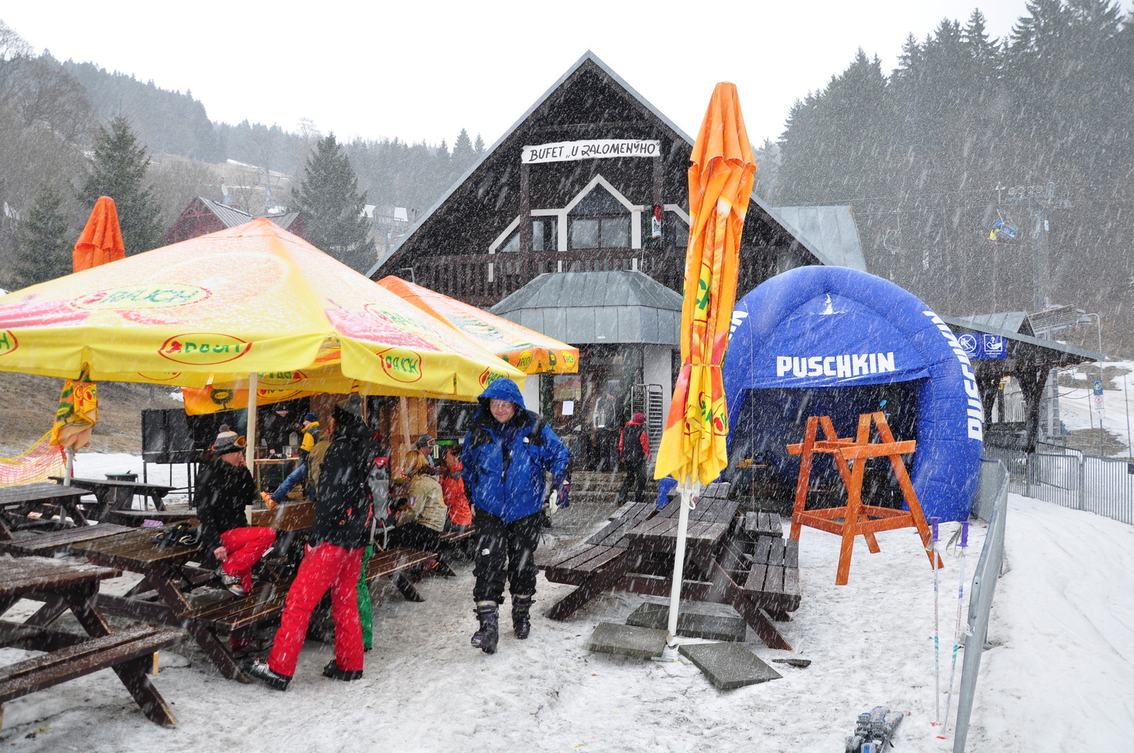 Go here for the after-skiThe best after-ski on the slopes takes place at the bottom of the Slalomák trail. This is the gathering place for many tourists, but also for racers whose race track sometimes occupies the Slalomák. The restaurant has tables inside and outside, cheap beer, music, outside grill, and all the other necessary ingredients to attract the crowds.