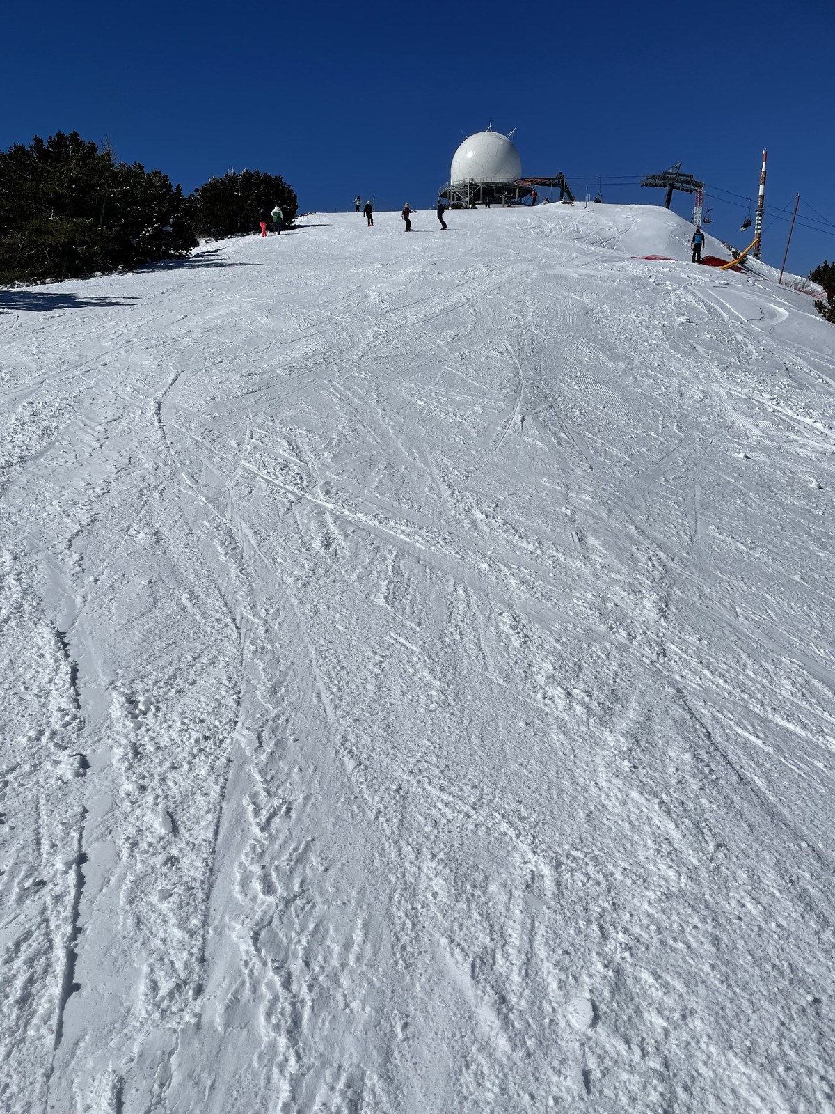The ski area is divided into the main "Zeus" slope (!) and the Sun Valley area. The latter is where a lot of the tourists and beginners are, and on this area there's also some excellent forest skiing. The Sun Valley area is served by two lifts at different points in the ridge/valley. There are about five main slopes, plus all the interesting forest skiing in between, particularly around the Hermes lift, i.e., furthest side from hut. the But the most challenging and steepest area is the one around the Zeus slope and lift. This part of the area has two lifts and five official slopes. The most challenging run is the Jubilee run.