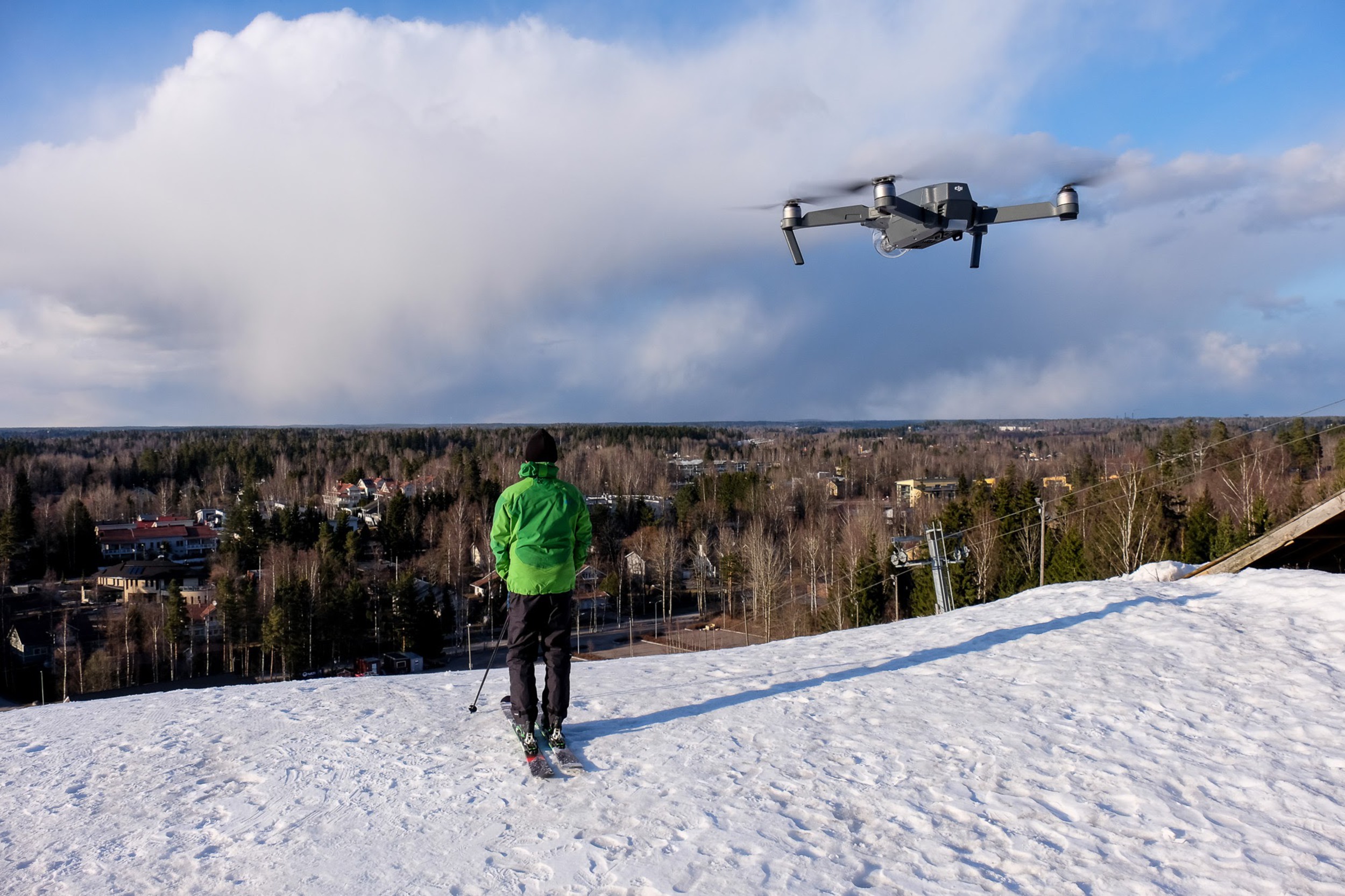 Here's a clip from our first test of shooting skiing in the automatic follow mode, in Peuramaa's a bit cloudy day. The drone is here in completely automatic mode, following me based on the recognising the skier on its video:
