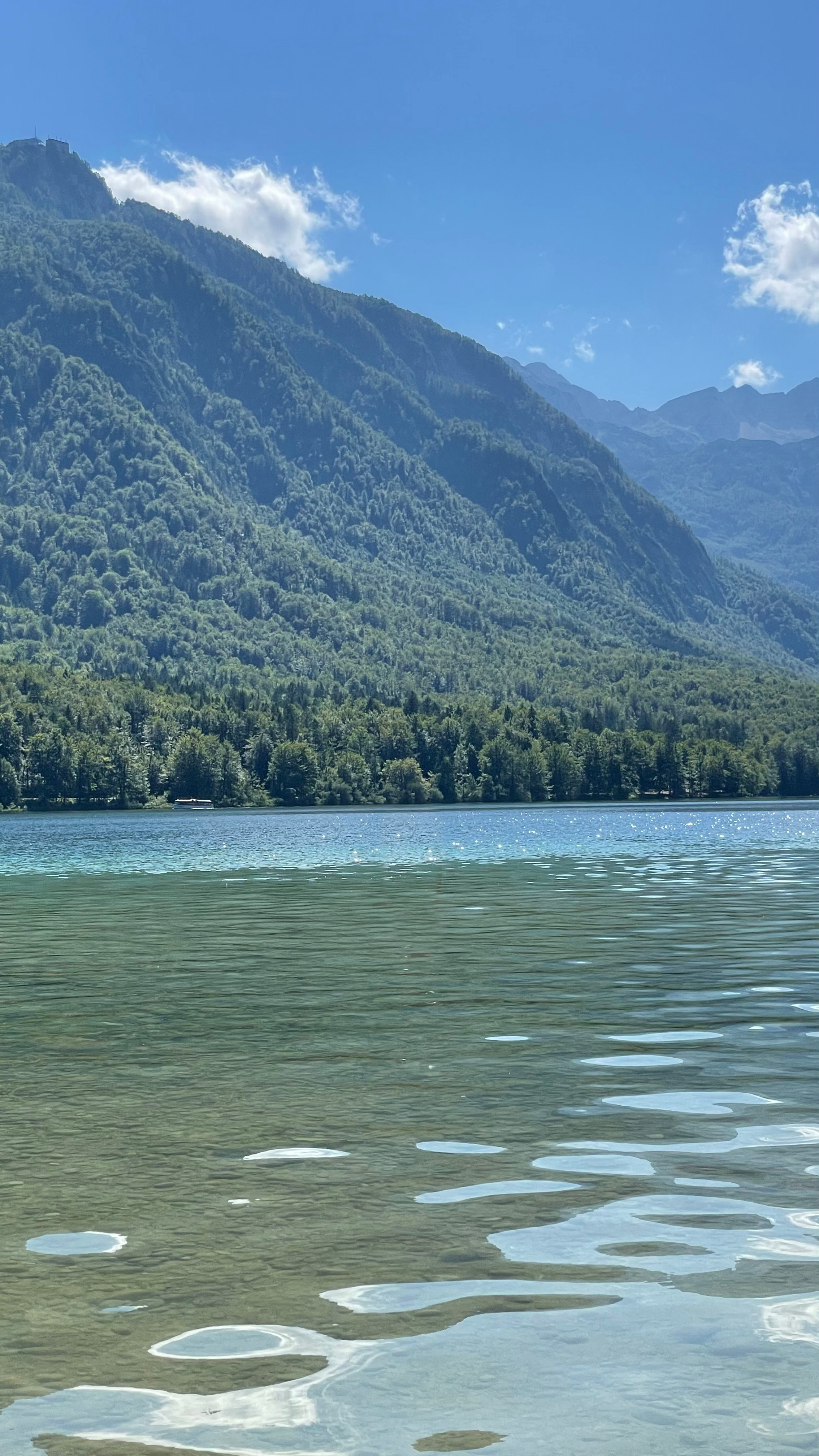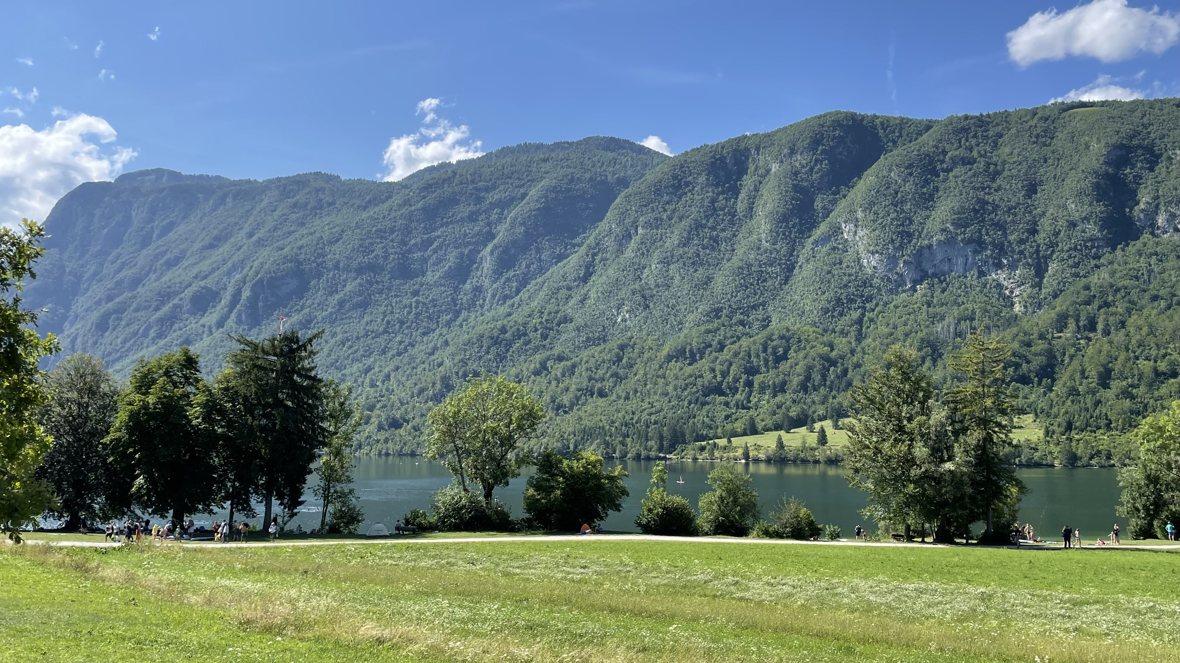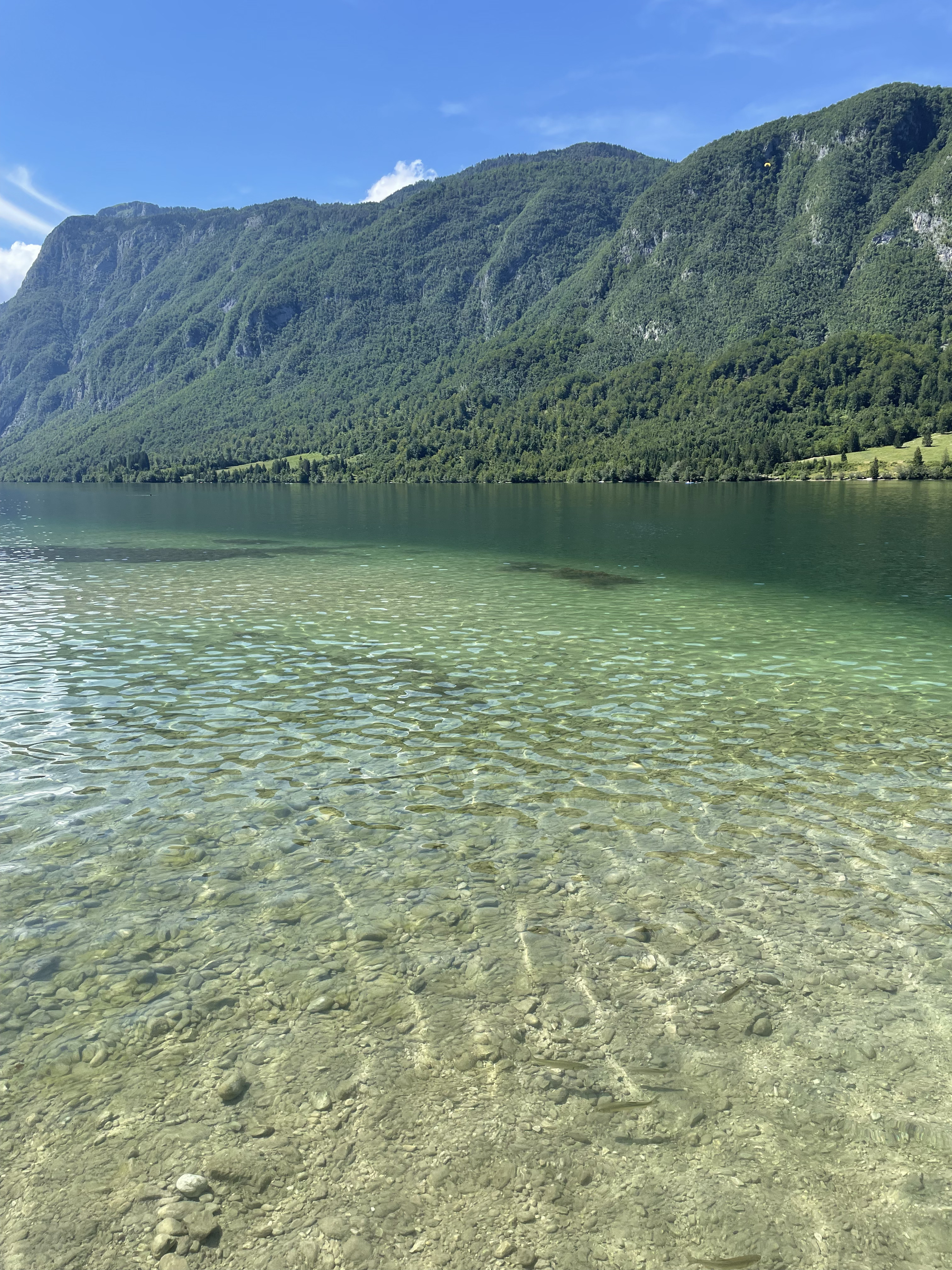 We were swimming here on lake Bohinj, one of the official beaches: N 46.28216 E 13.88040. Parking was a bit scarce, but available and inexpensive.
