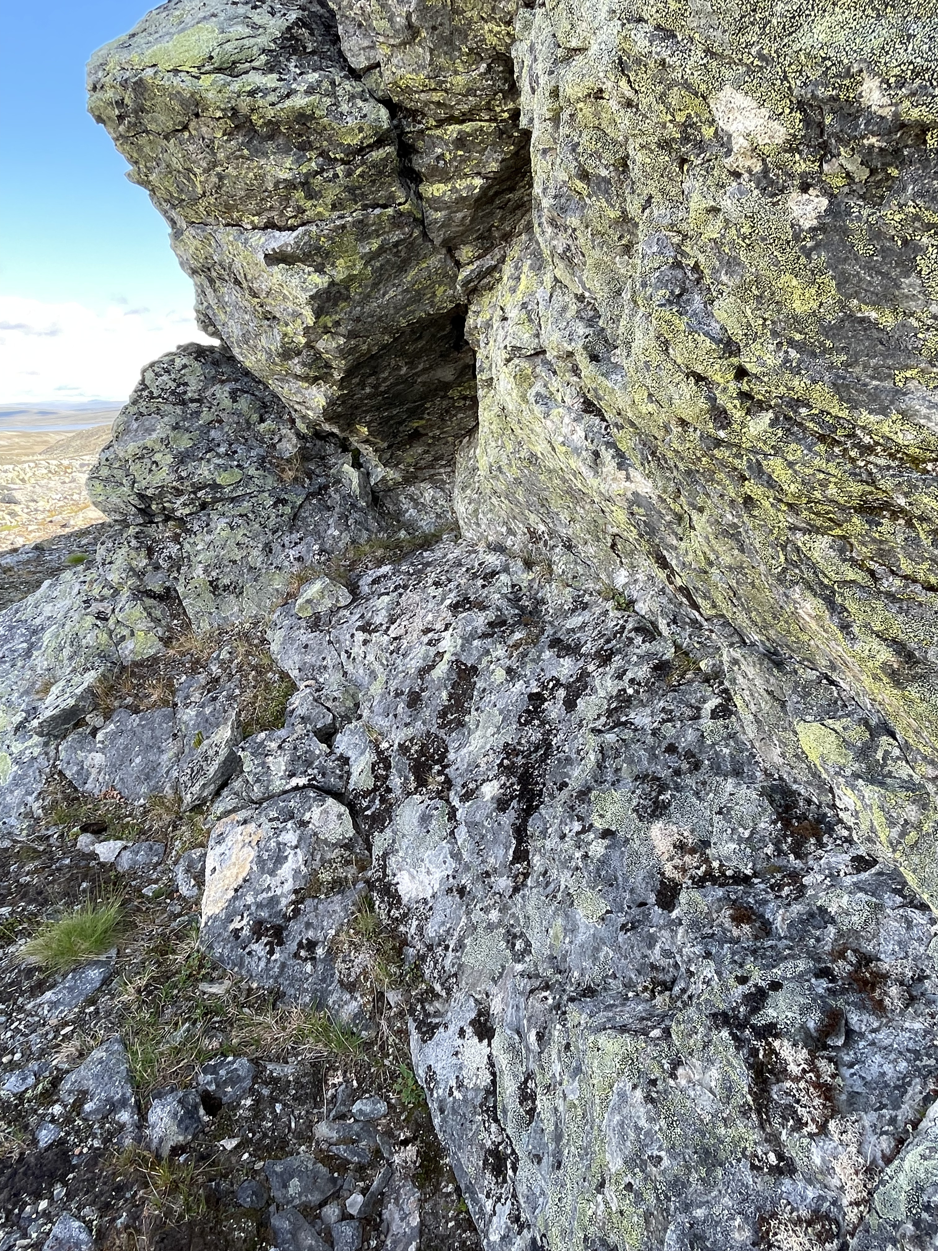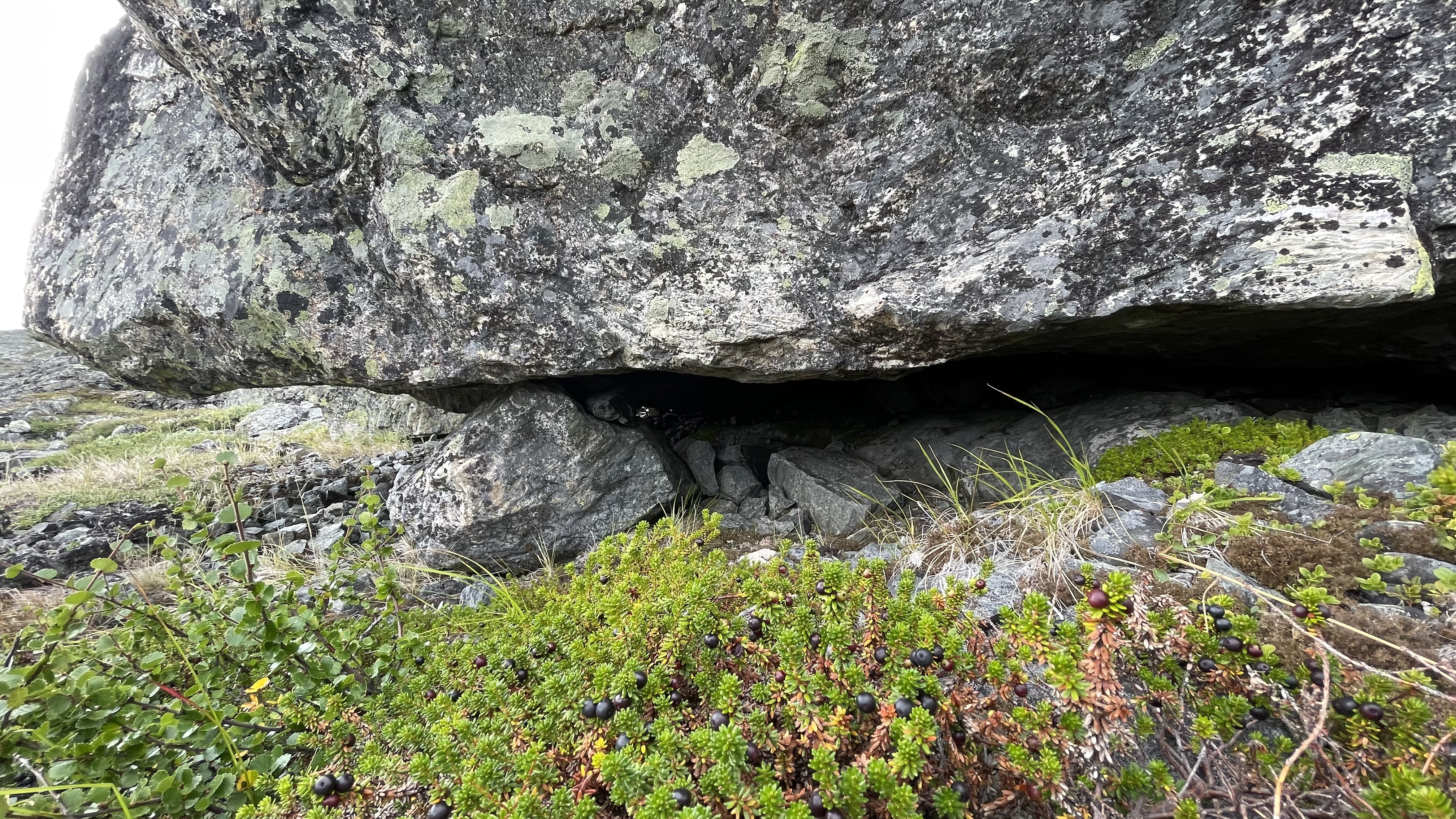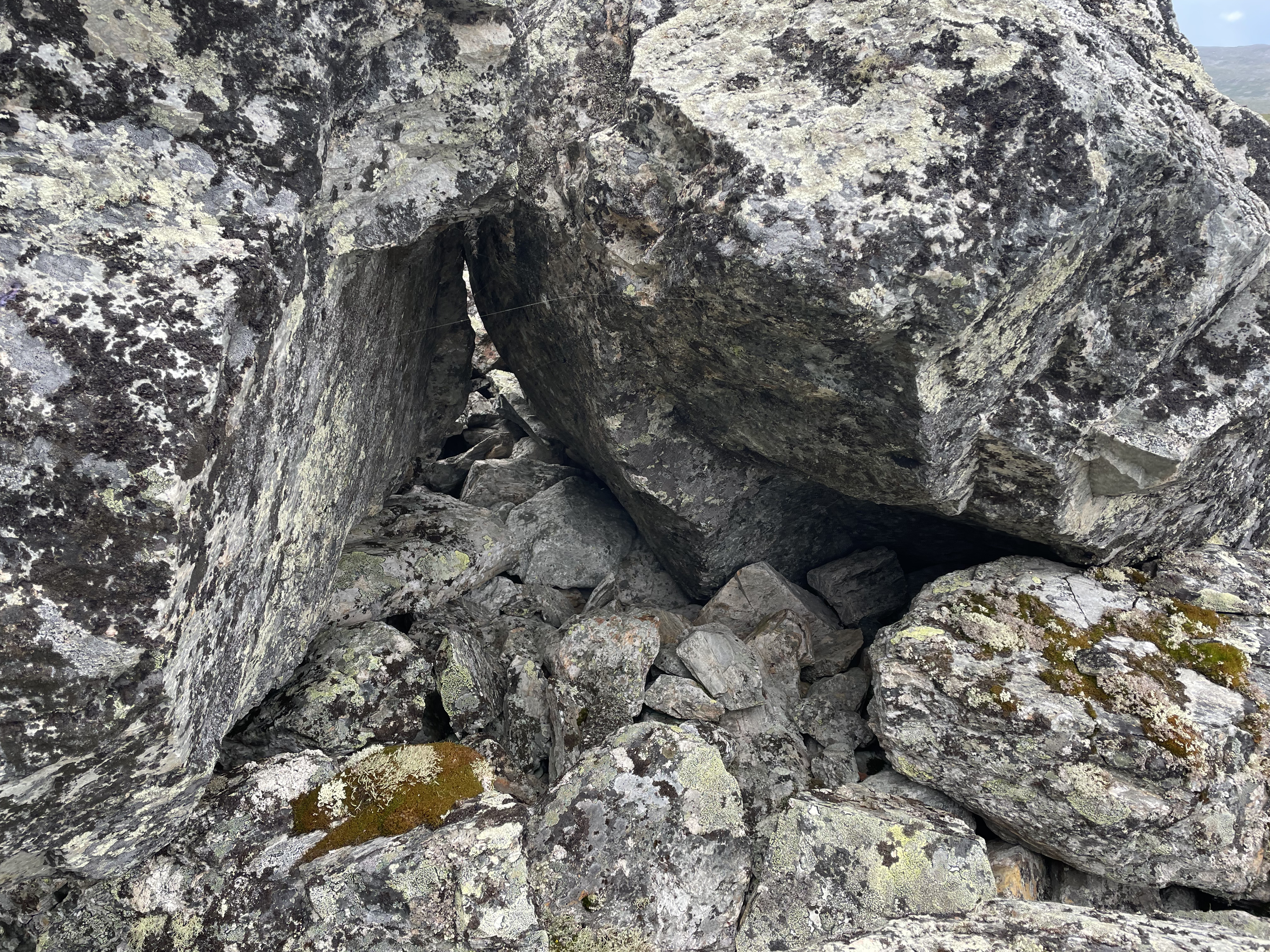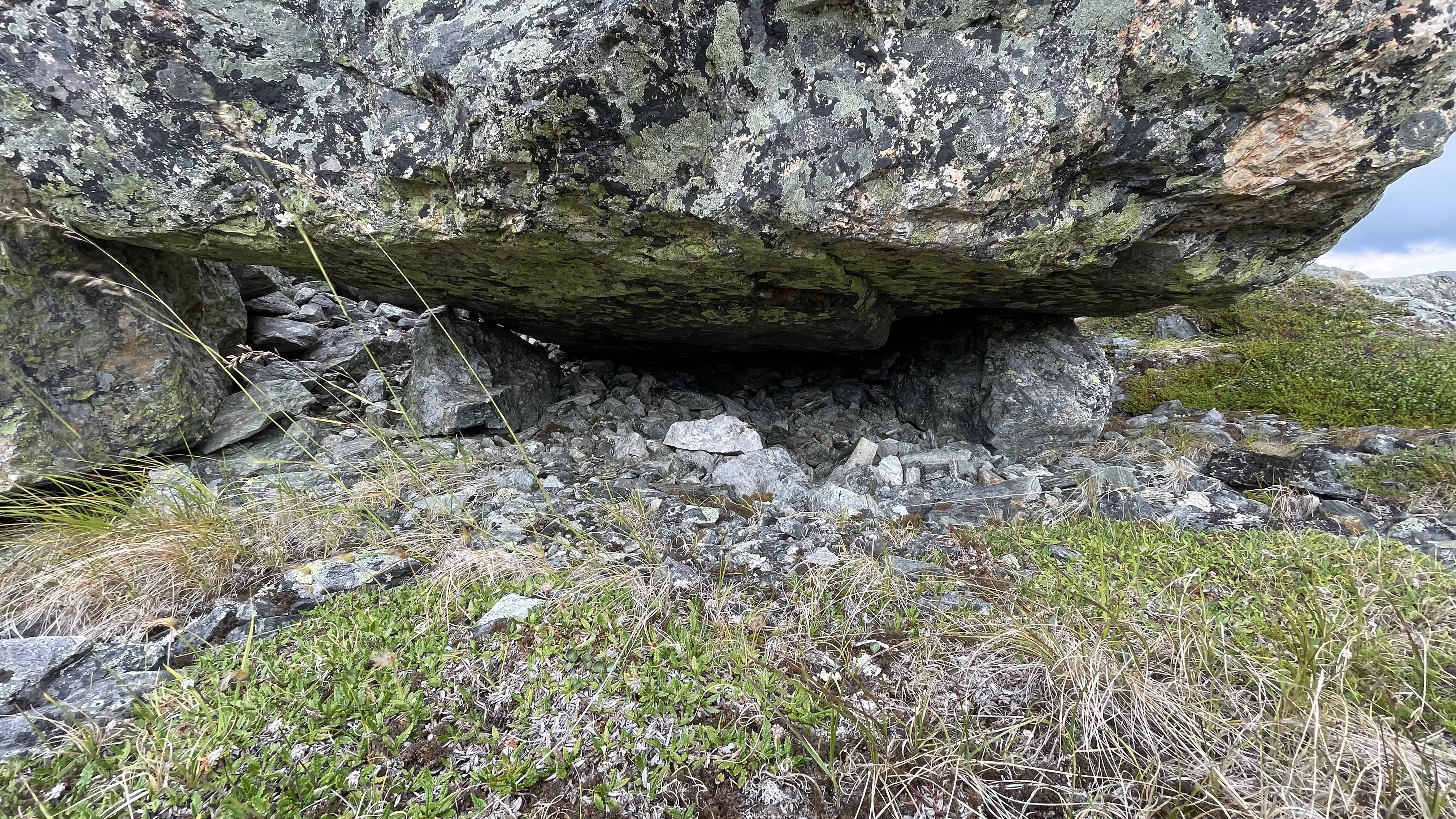On the slope from Láfolvárri top towards Njiellalanjávri there's a small cliff or perhaps pile of boulders on top of each other. Some space forms underneath.