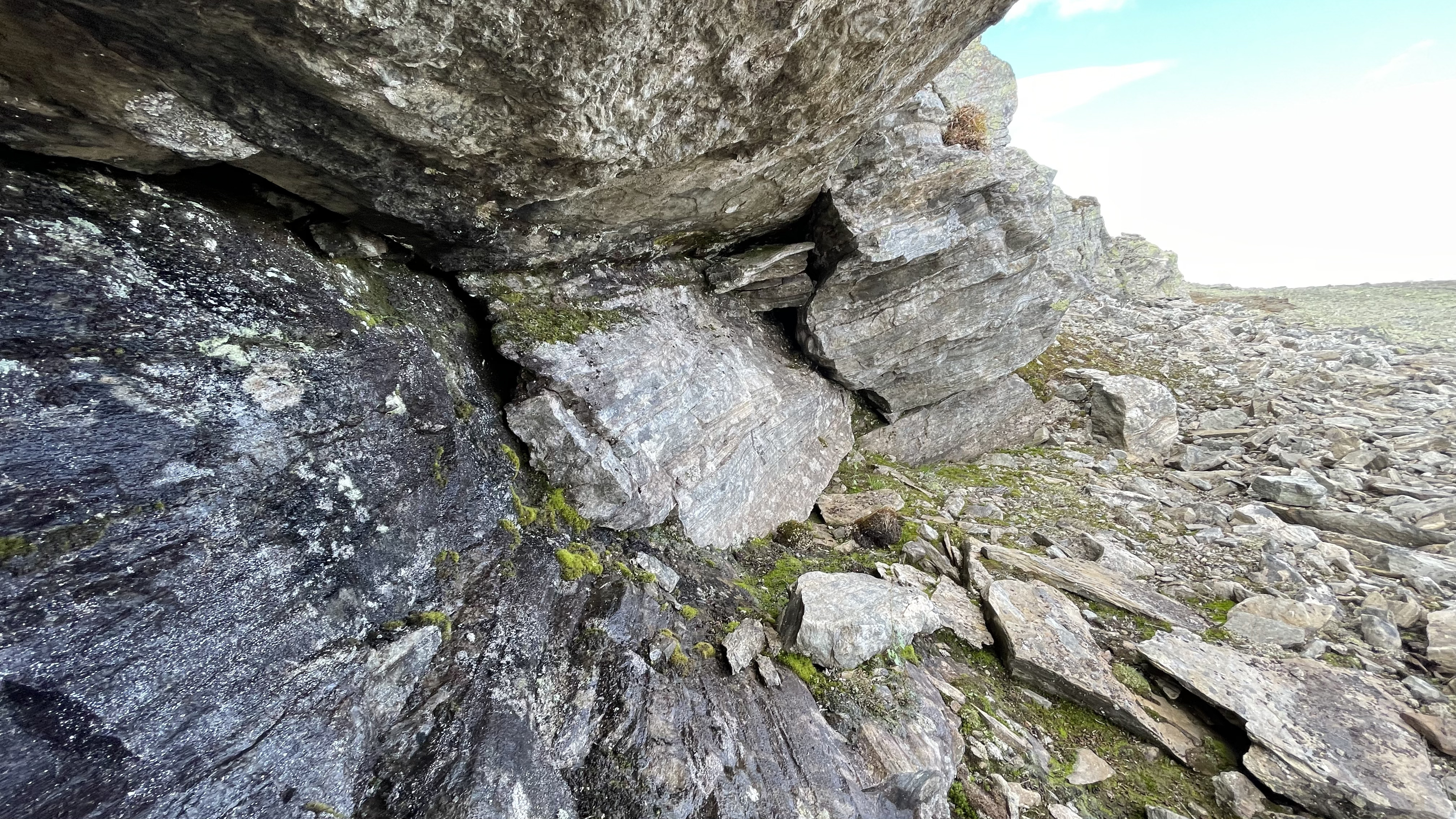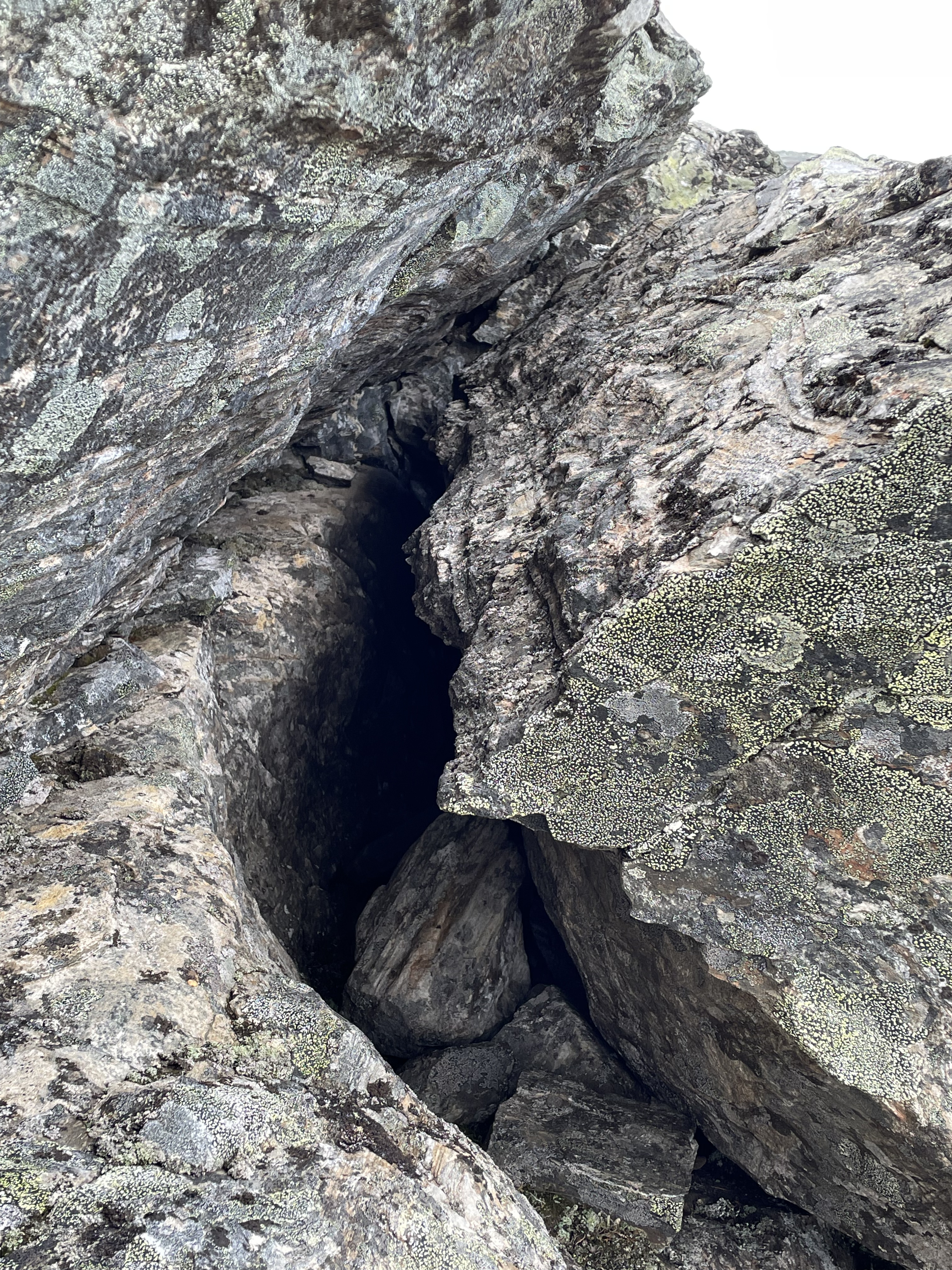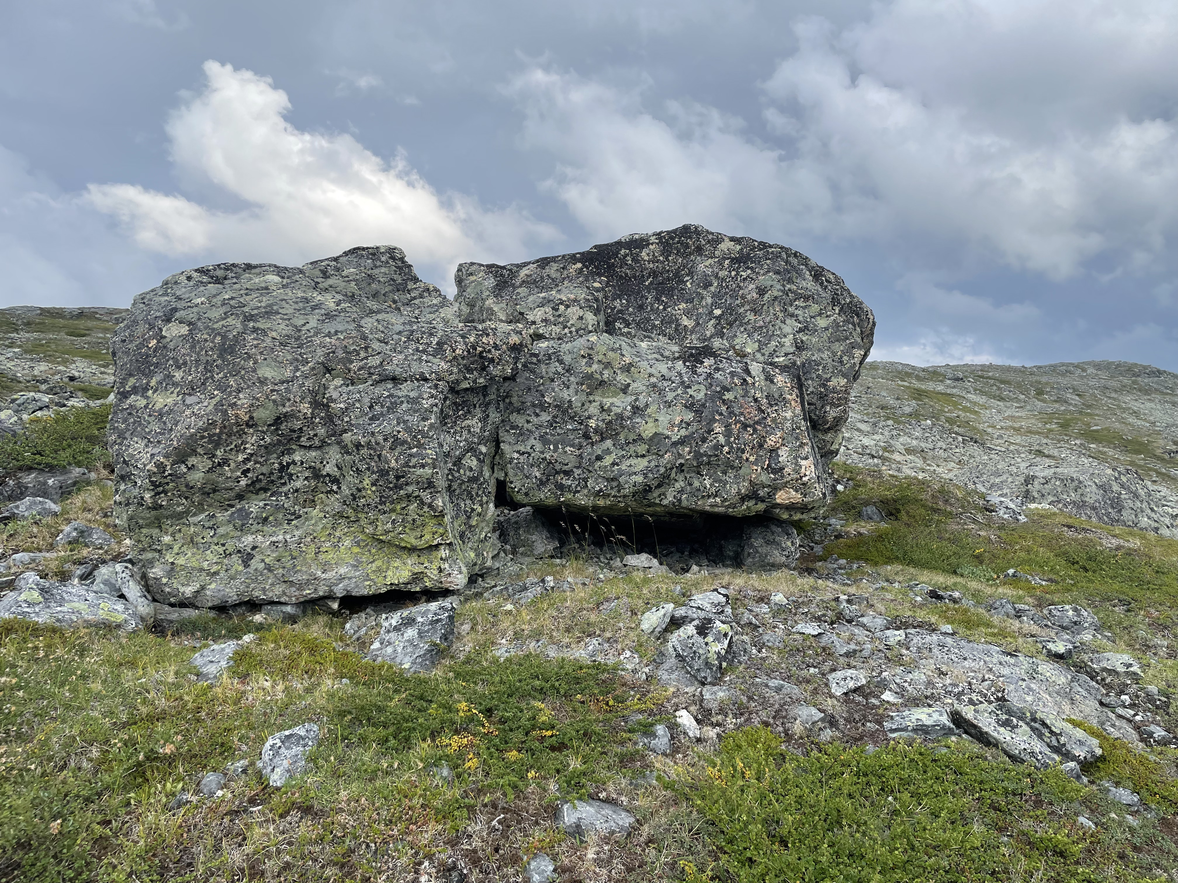 On the slope from Láfolvárri top towards Njiellalanjávri there's a small cliff or perhaps pile of boulders on top of each other. Some space forms underneath.