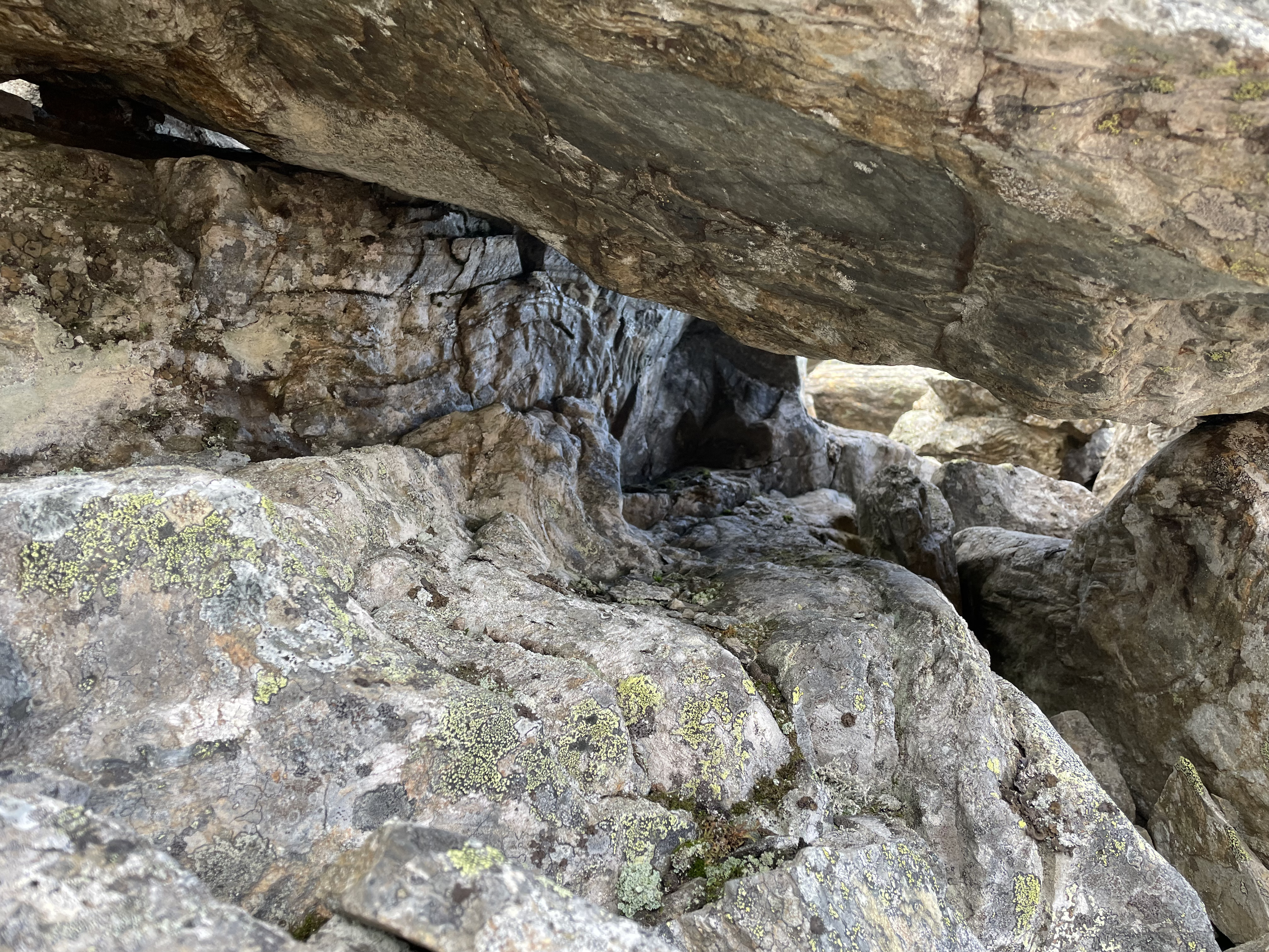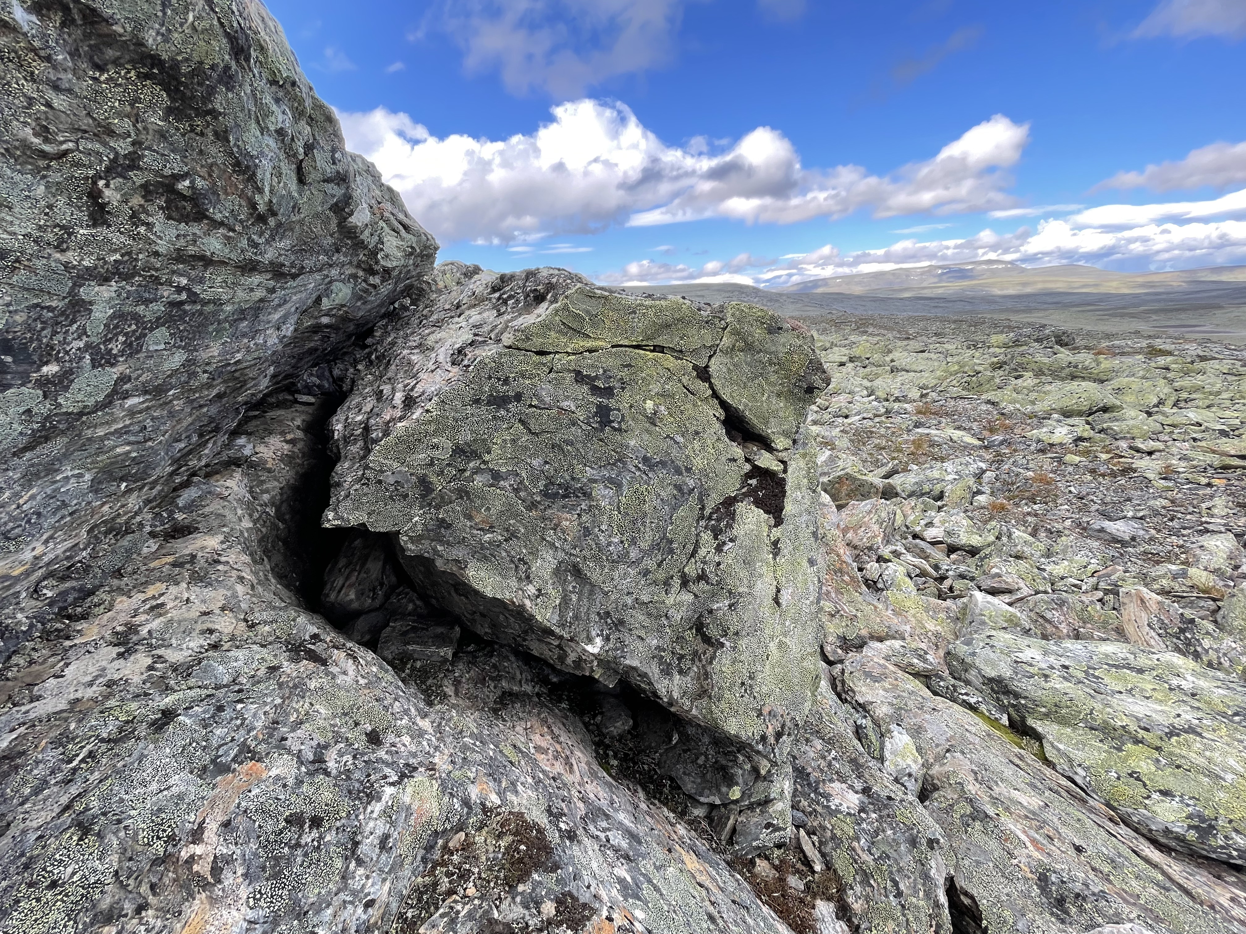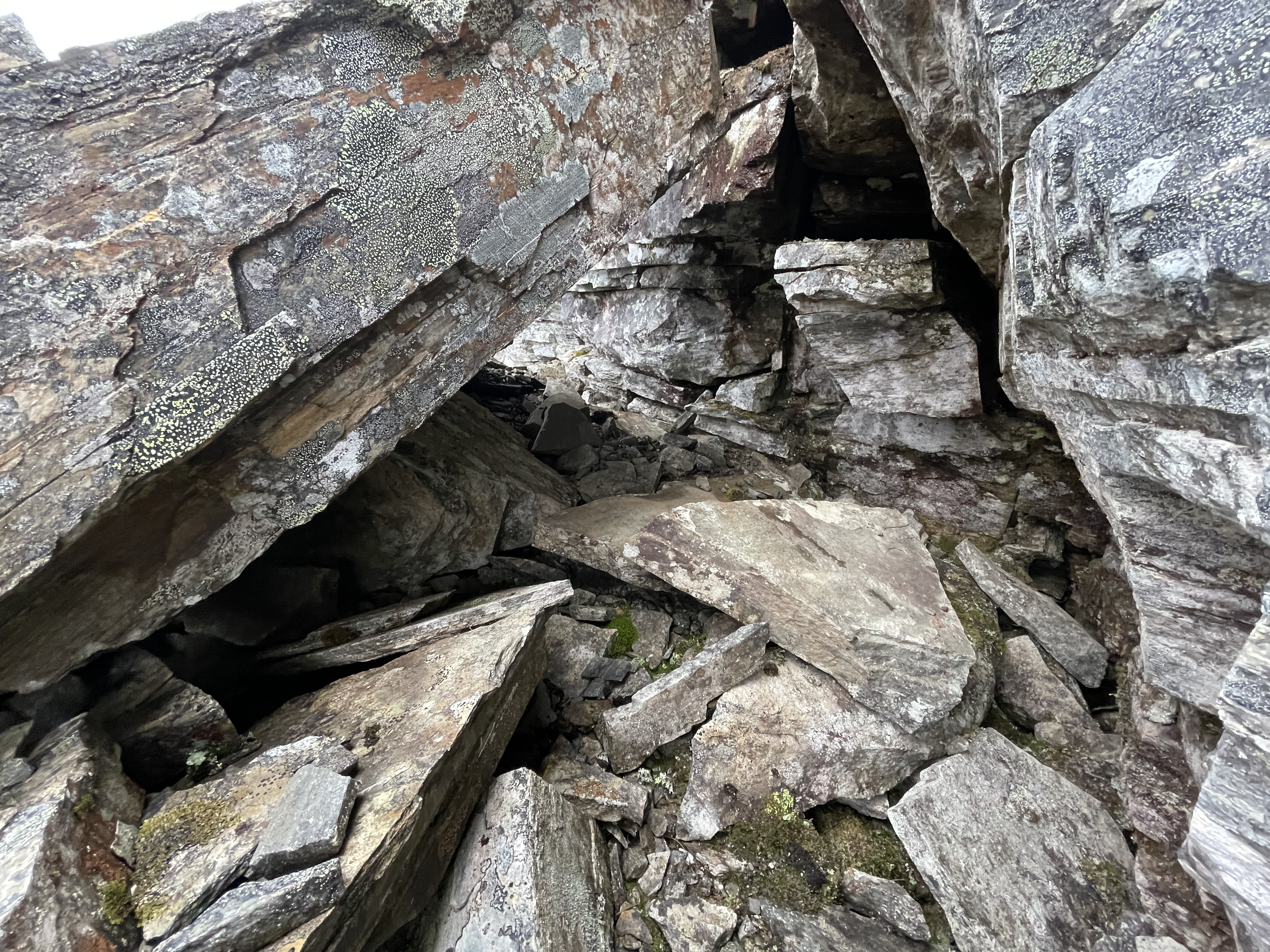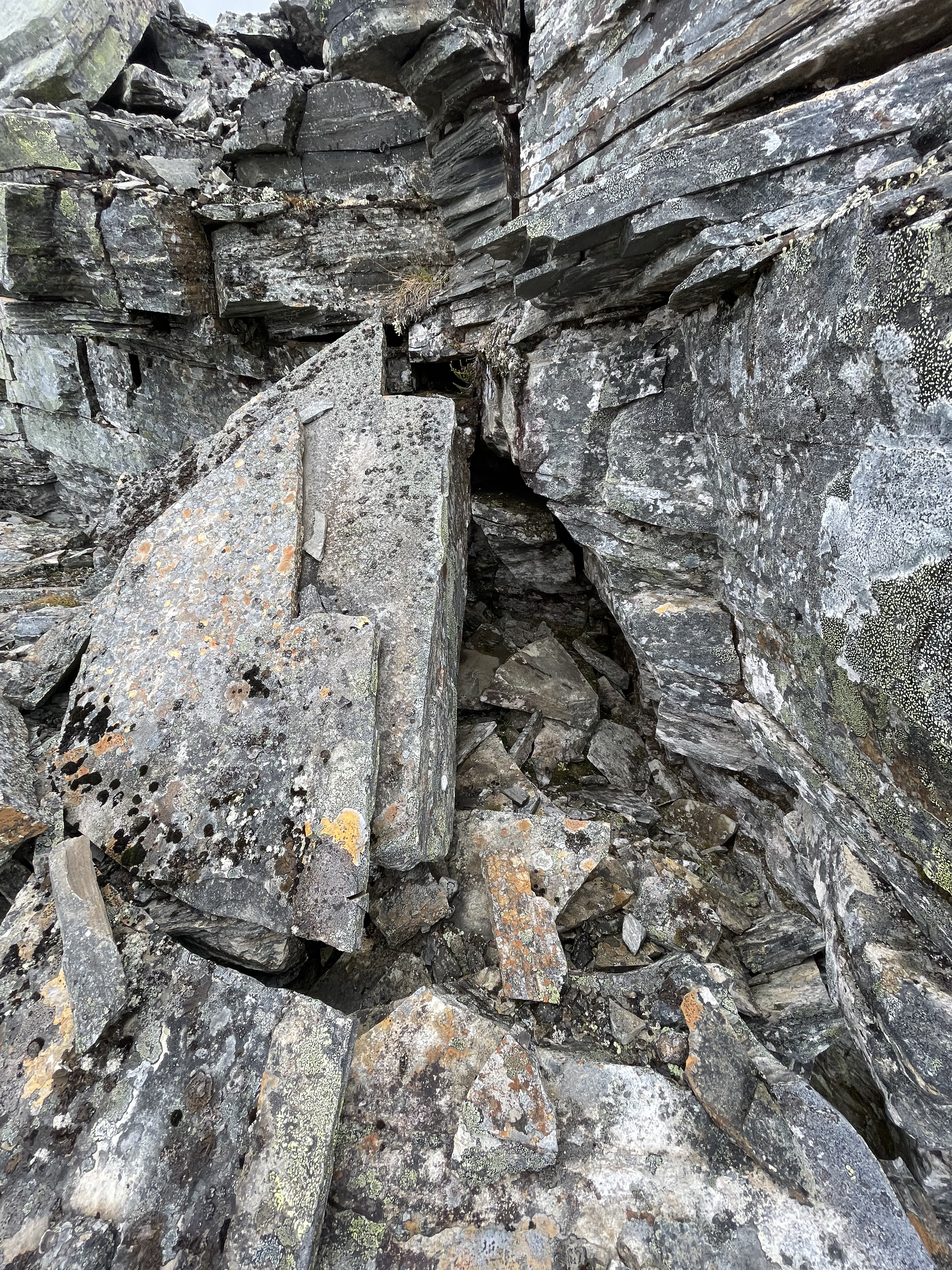 On the slope from Láfolvárri top towards Njiellalanjávri there's a small cliff or perhaps pile of boulders on top of each other. Some space forms underneath.