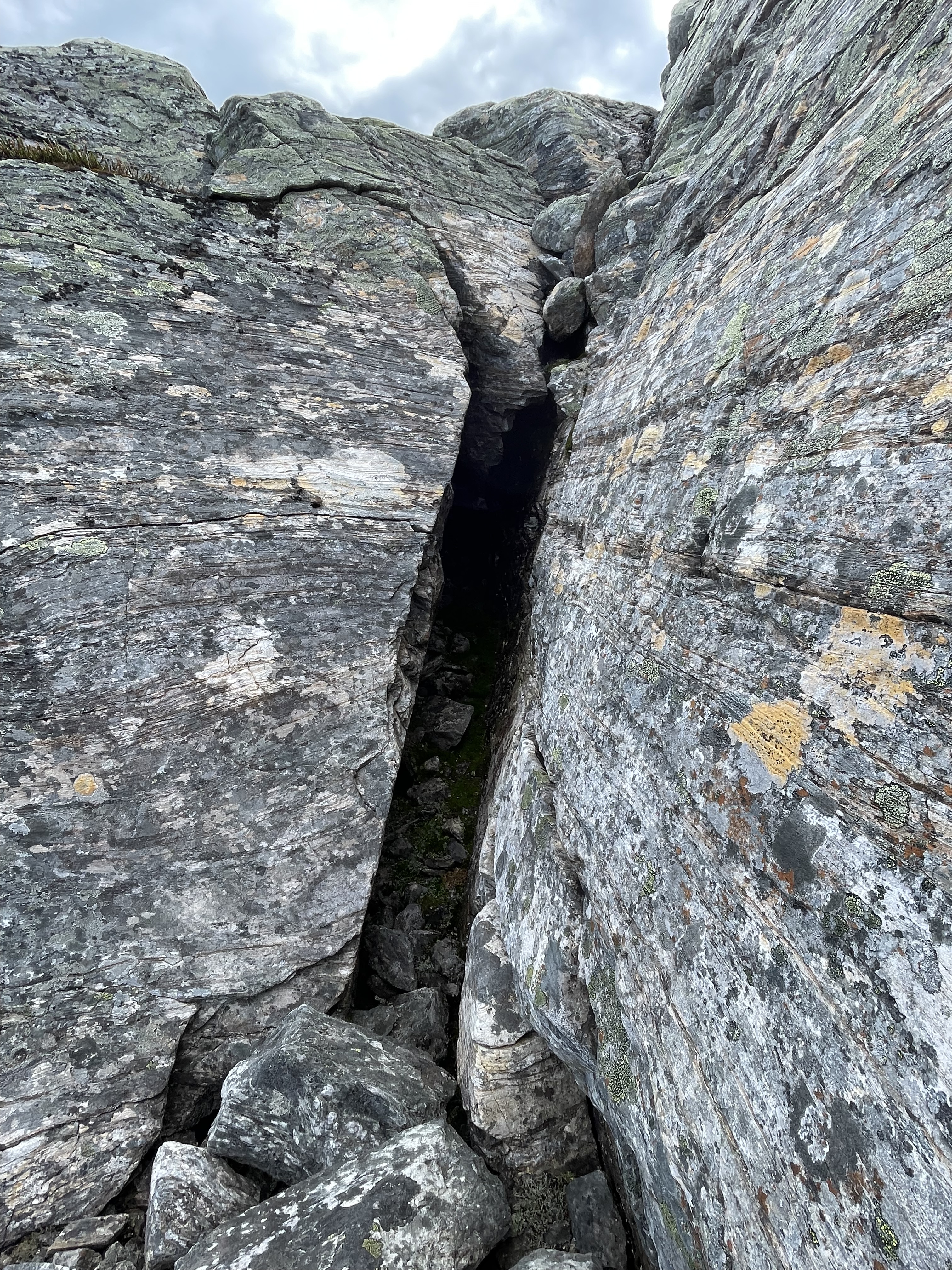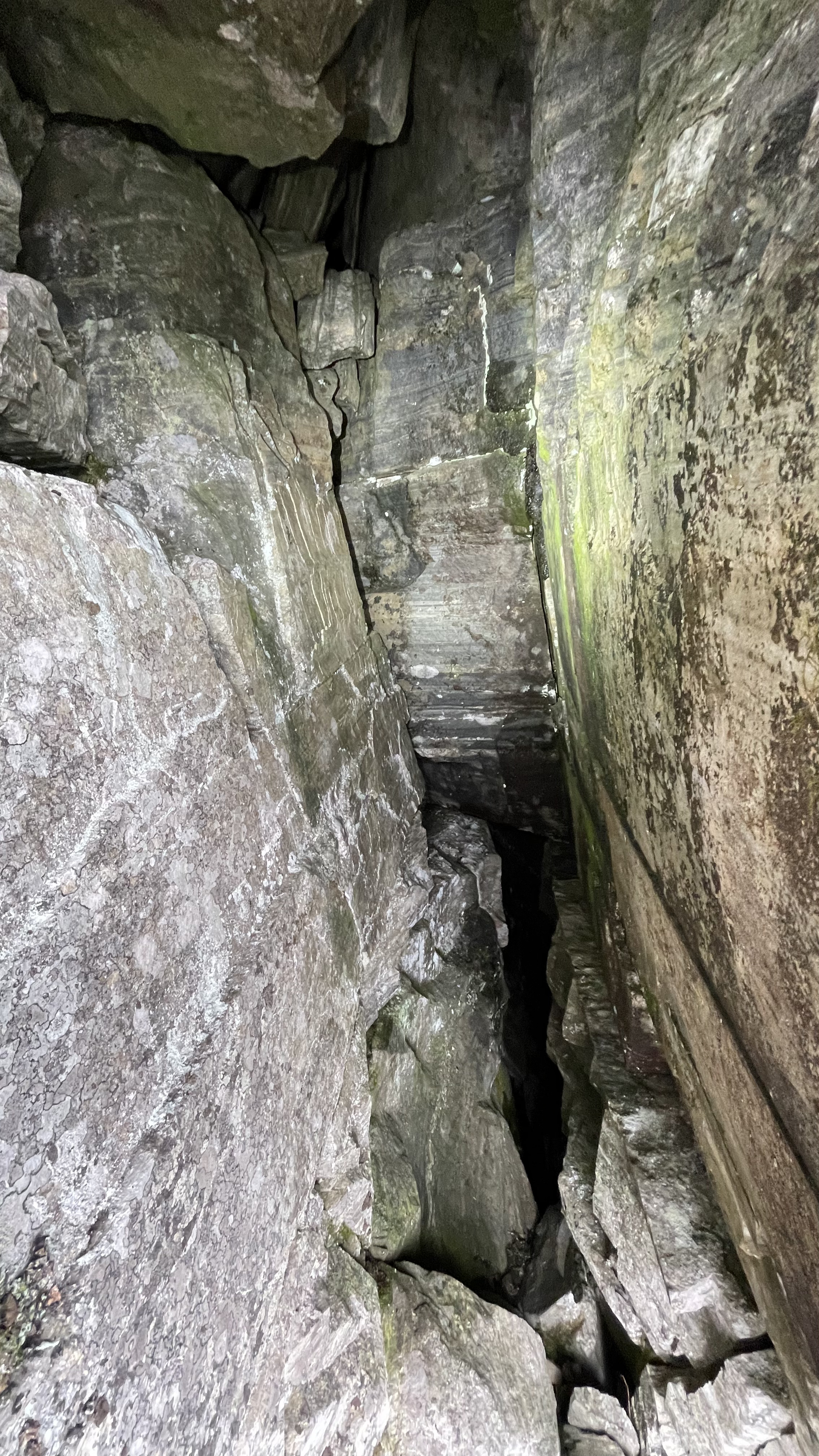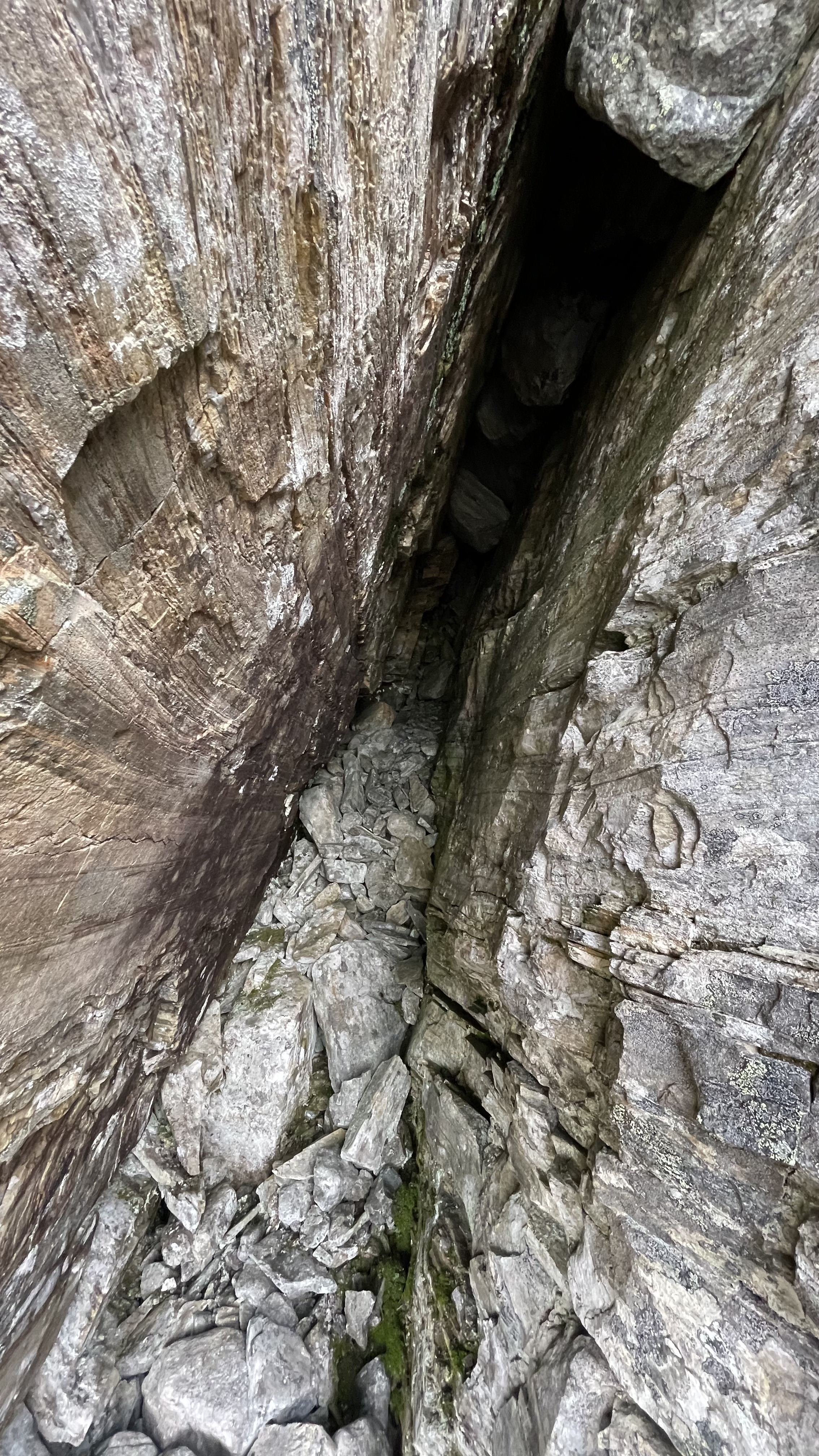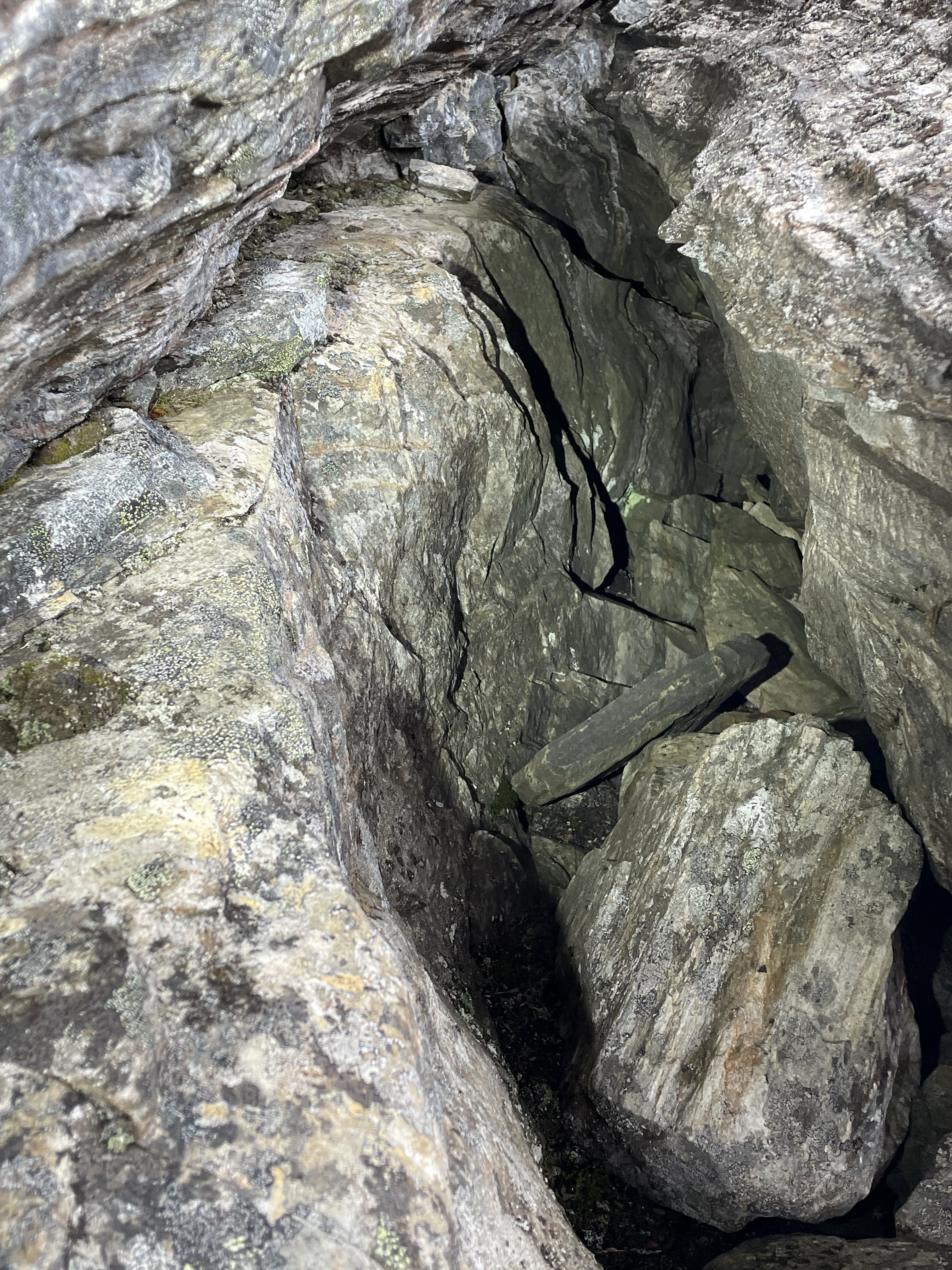 This canyon was a very nice find. Interesting rock, layered, cracking, leaning shaky stacks of rocks. The canyon is maybe 2-5 meters deep and runs for 100+ meters. At one point the cracked rocks are shifted so that there's a discontinuity in the canyon. There's a middle stack of rocks between the two sides, and under one side of the leaning stack there's a small hole. In addition, both walls of the canyon lean in, further covering the area where the small hole begins. Really nice place. I'd classify this as a small cavelet.