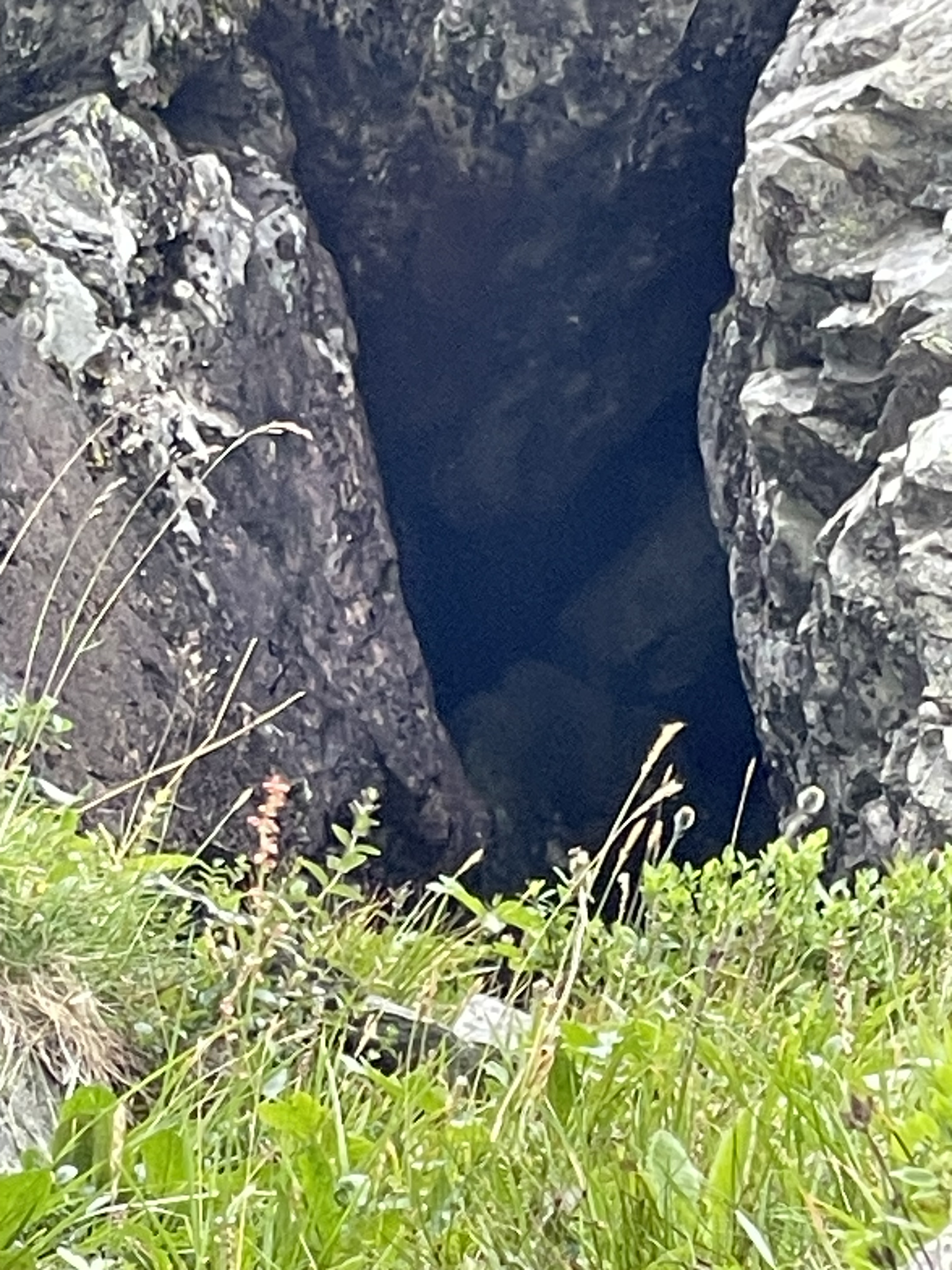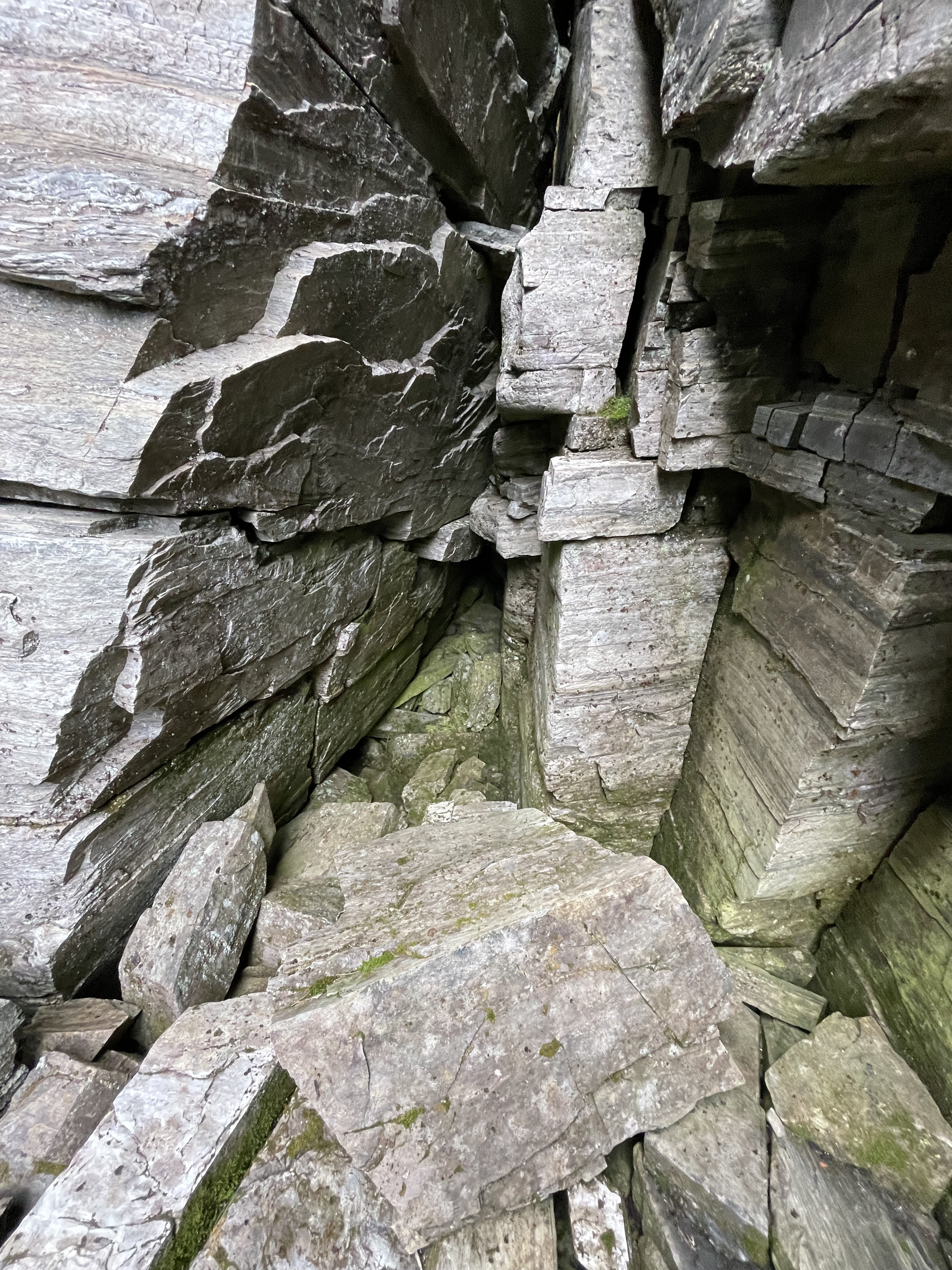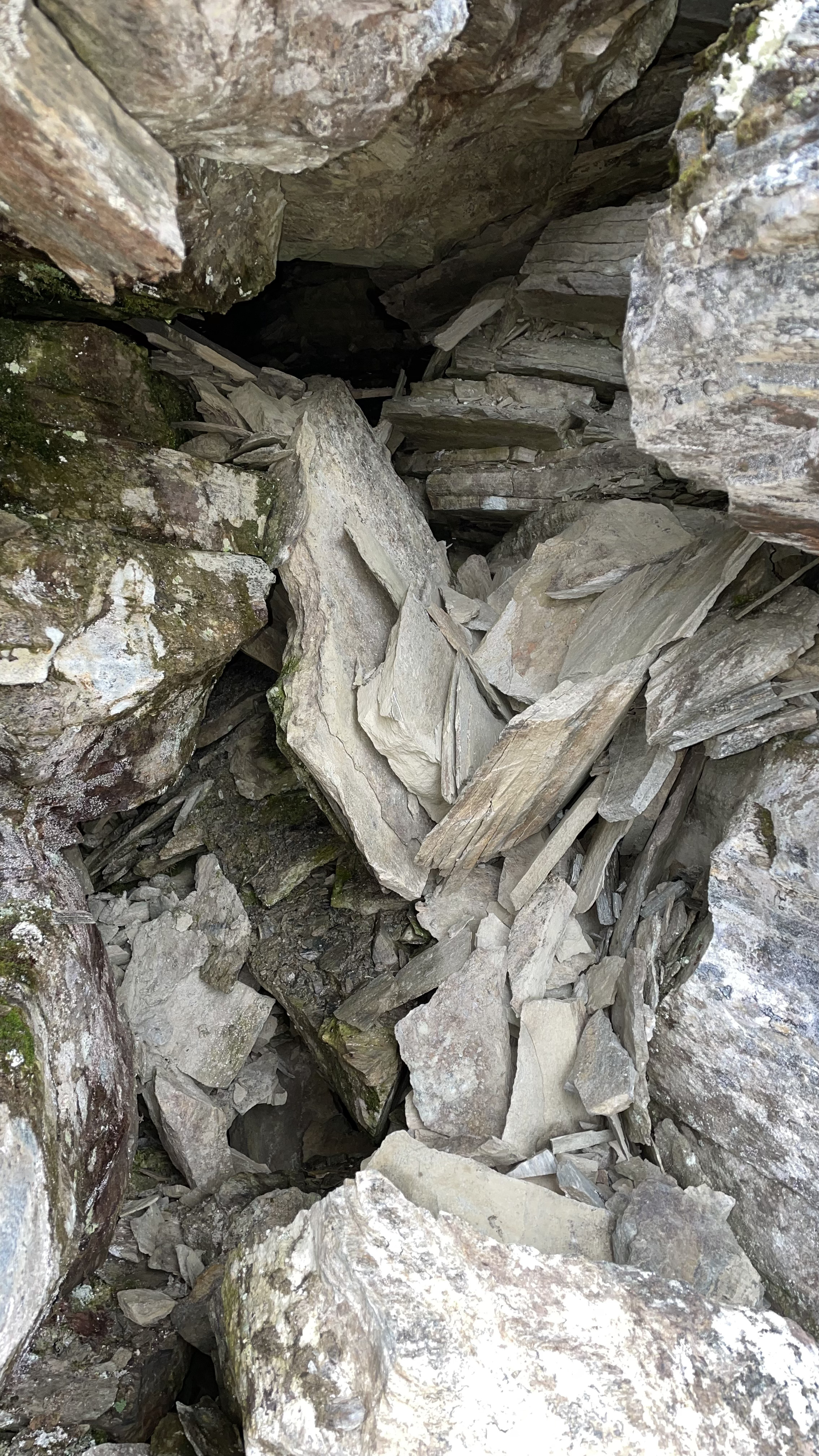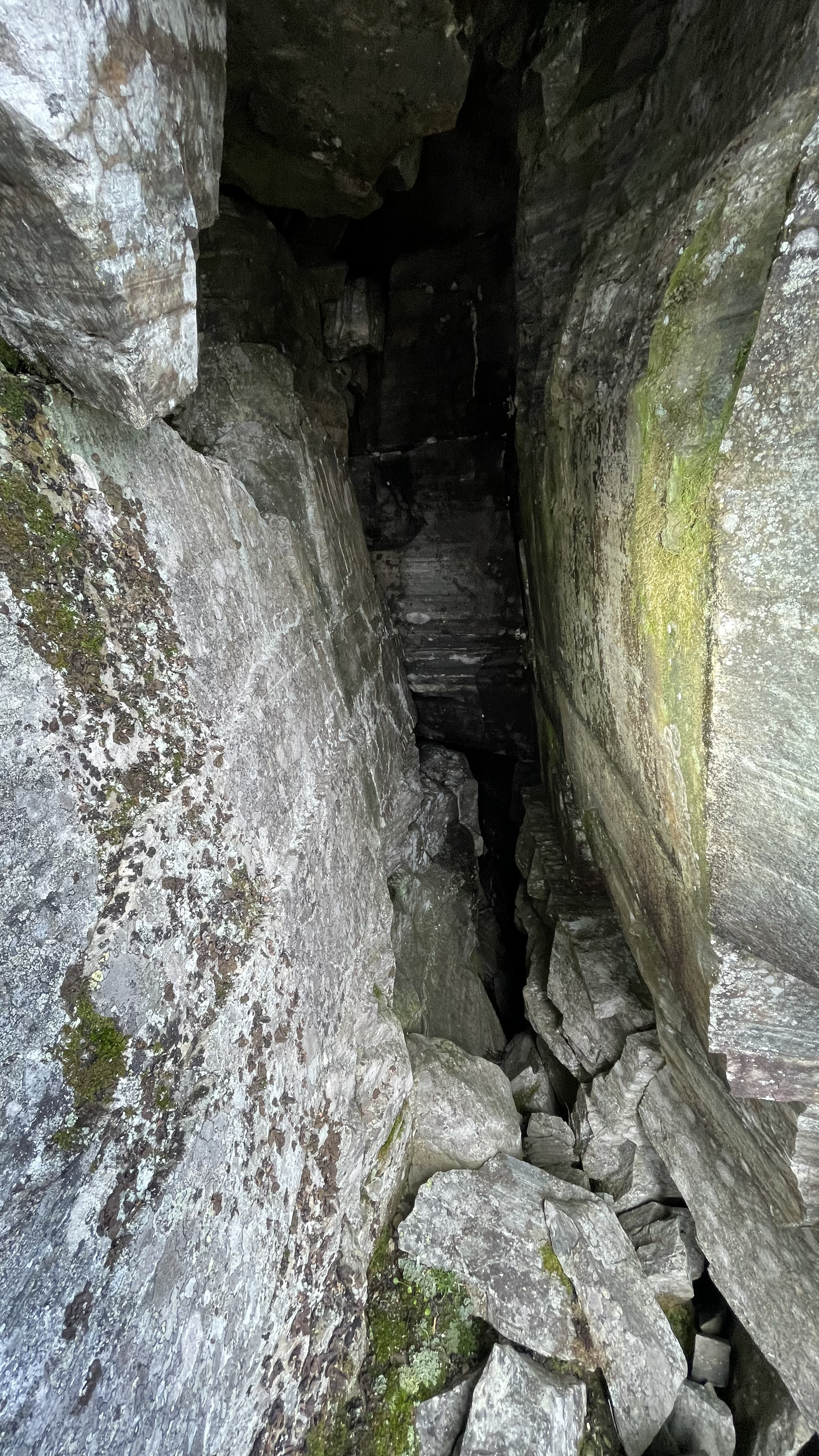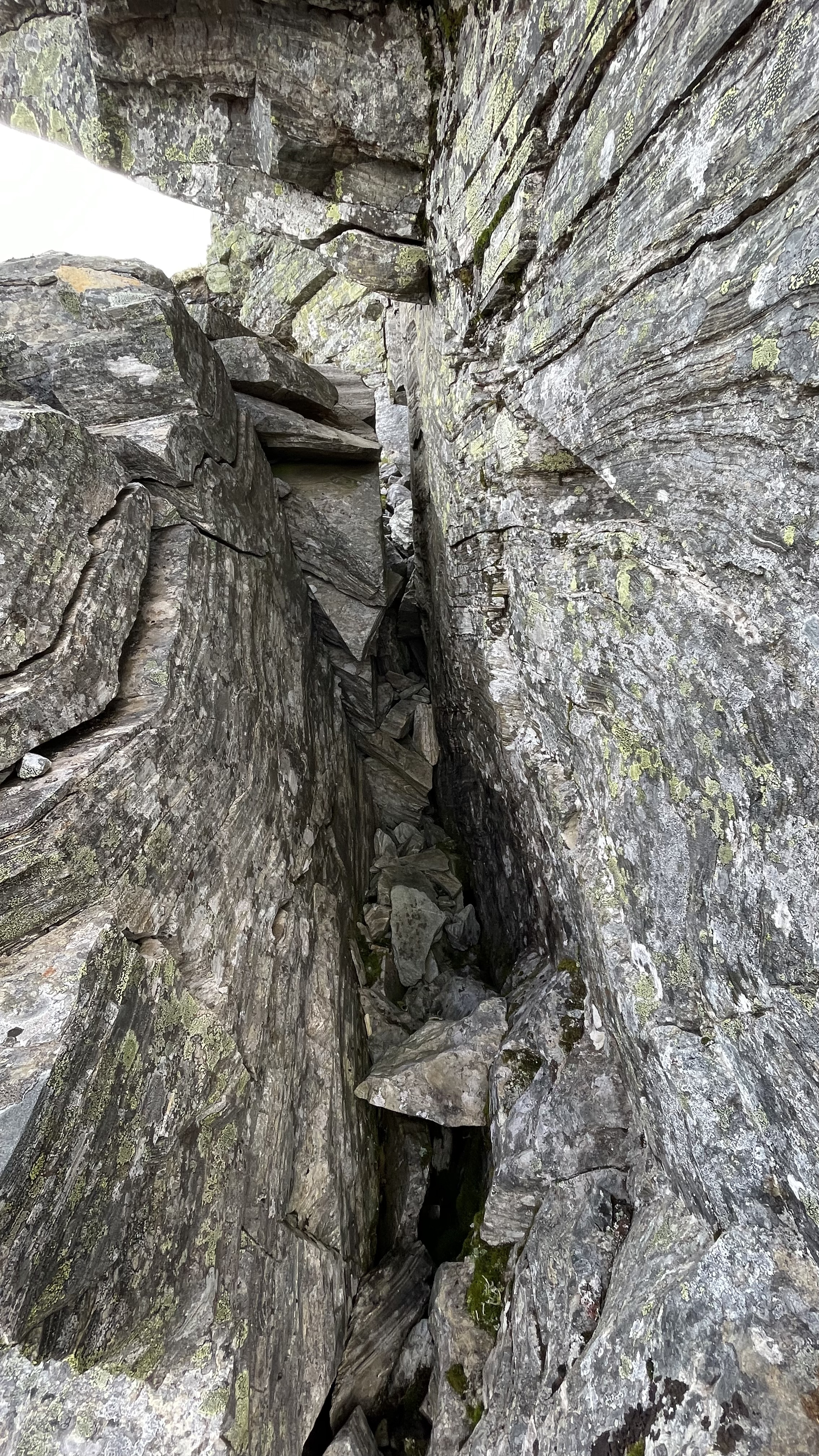 This canyon was a very nice find. Interesting rock, layered, cracking, leaning shaky stacks of rocks. The canyon is maybe 2-5 meters deep and runs for 100+ meters. At one point the cracked rocks are shifted so that there's a discontinuity in the canyon. There's a middle stack of rocks between the two sides, and under one side of the leaning stack there's a small hole. In addition, both walls of the canyon lean in, further covering the area where the small hole begins. Really nice place. I'd classify this as a small cavelet.