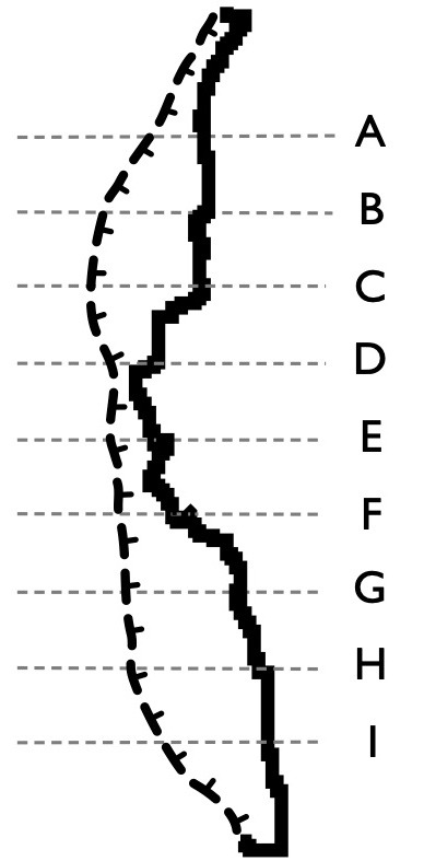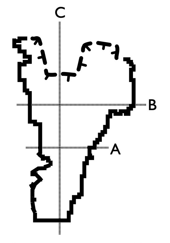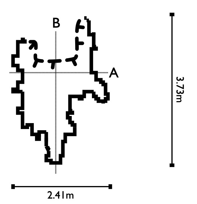 Given the small scale of the cave and the limited accuracy of the sensor in the iPhone I'm using, the map is not particularly high-resolution, but should give you an idea. And the Cave Outliner software is not perfect, it cannot always recognize entrances or driplines properly, so the map was manually edited for the entrance part. And the length of the cave has been also manually determined, in this case based on how far the small end of the cave at the bottom is from the dripline.