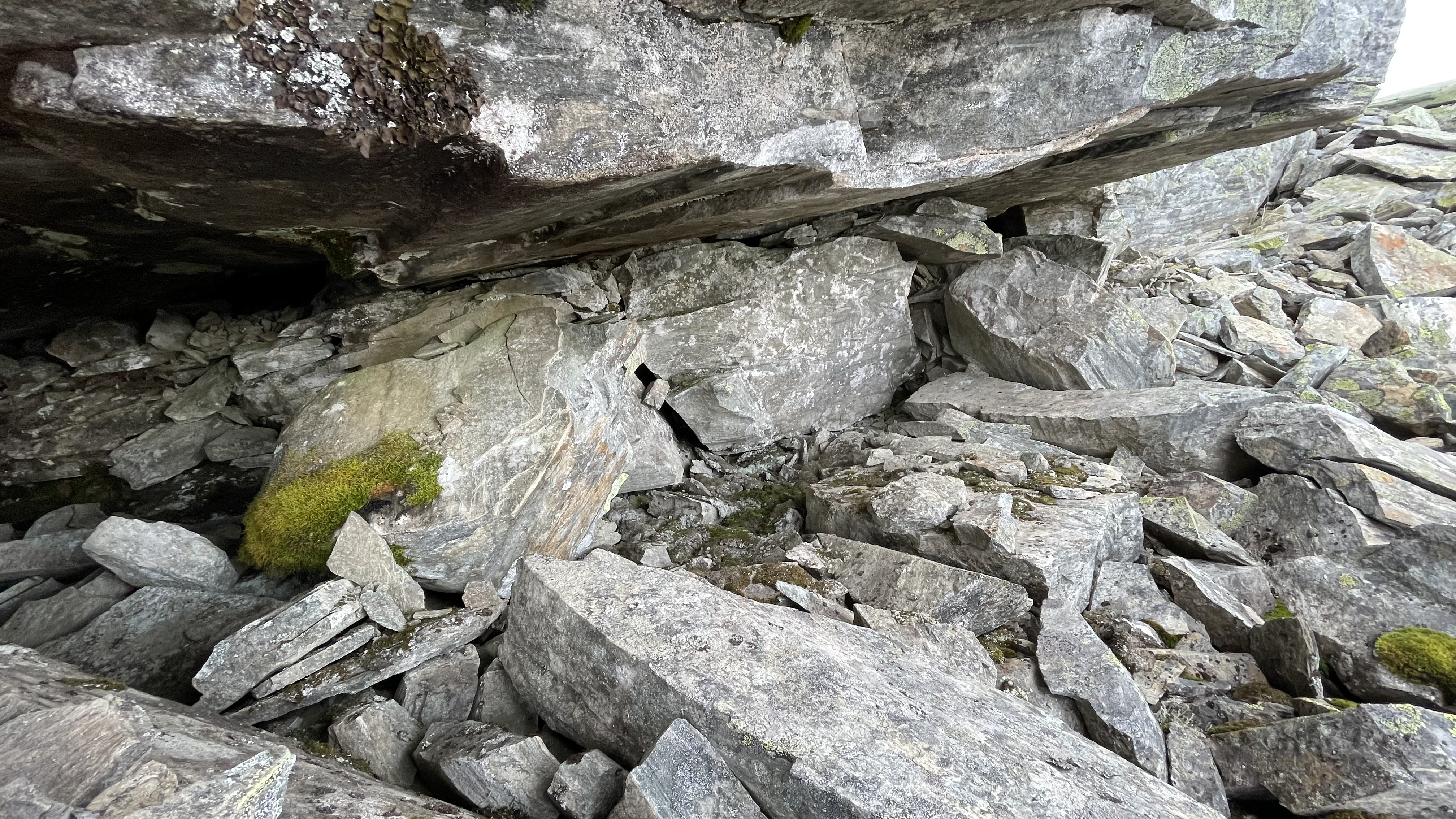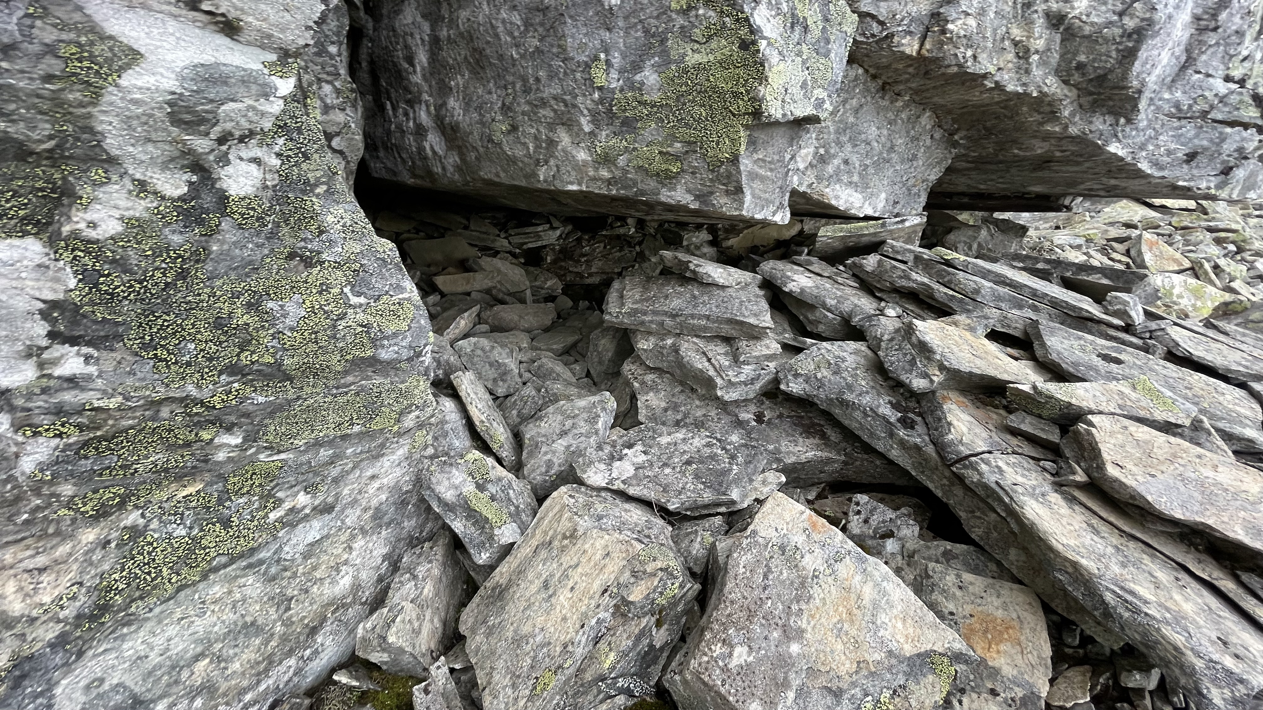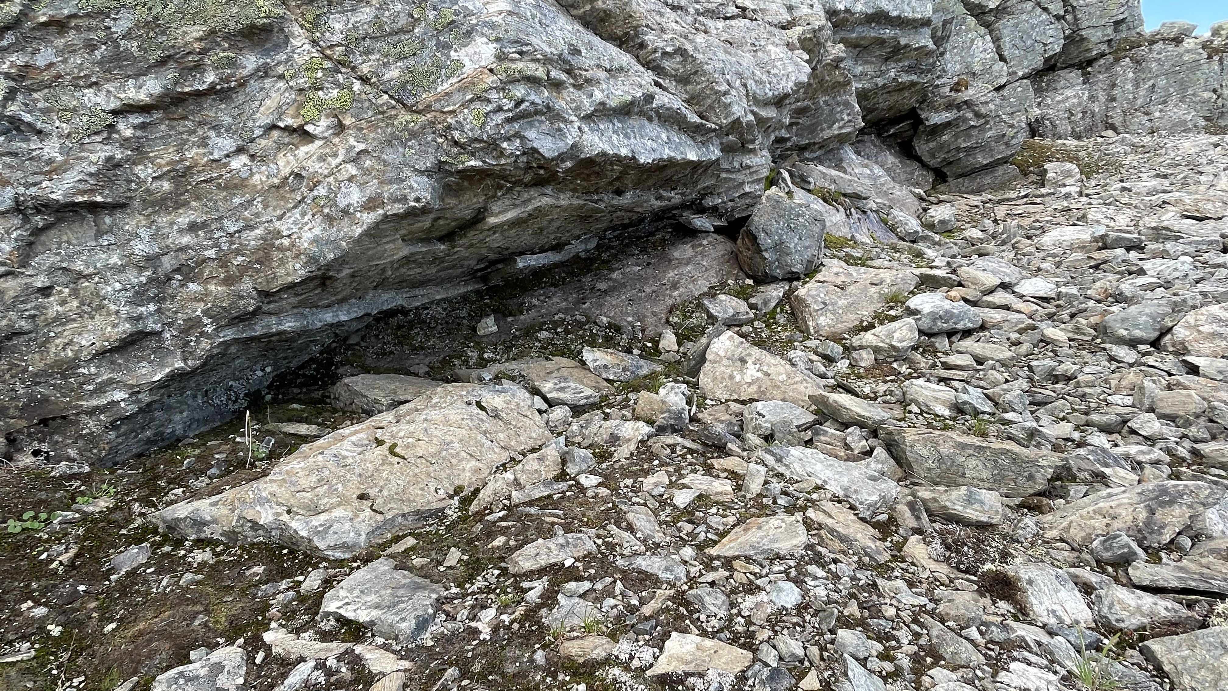 The potential resurgence area for any caves in the mountains between Njiellalanjávri and Toskaljärvi is a large cliff with a boulder field at the bottom. Two of the largest boulders form kind of a tiny shelter. Too small for a proper cave, but registering it here for completeness sake.