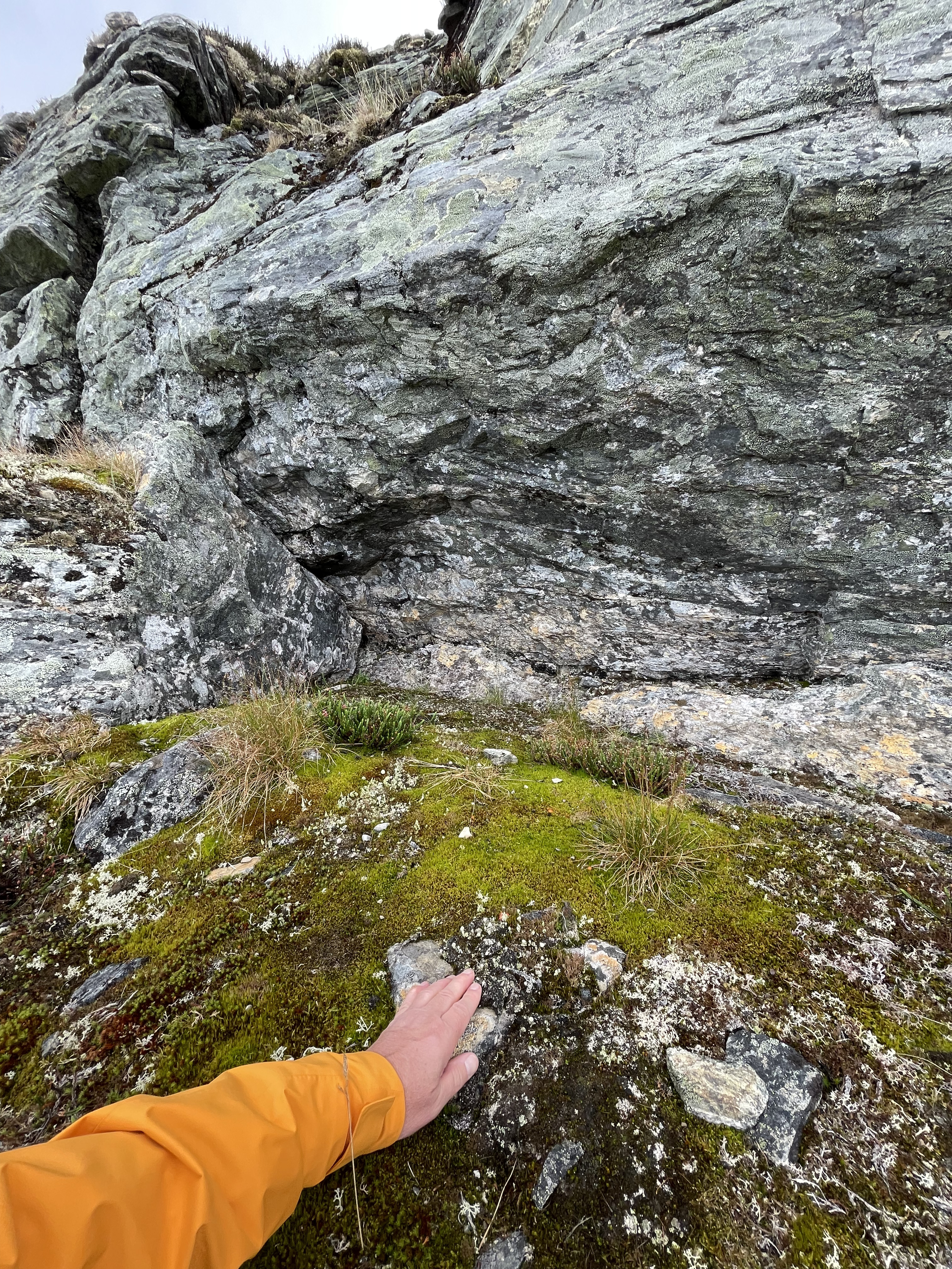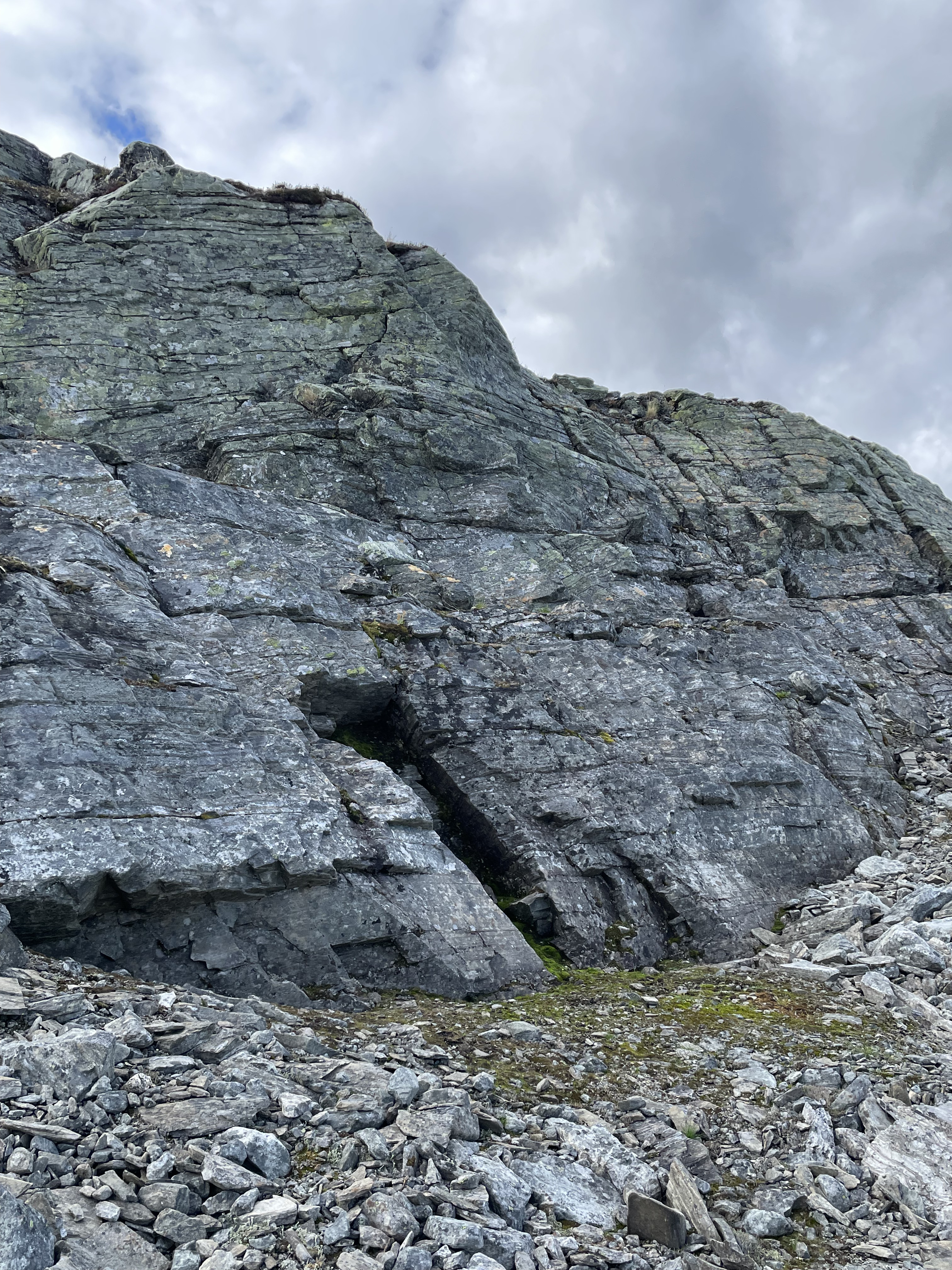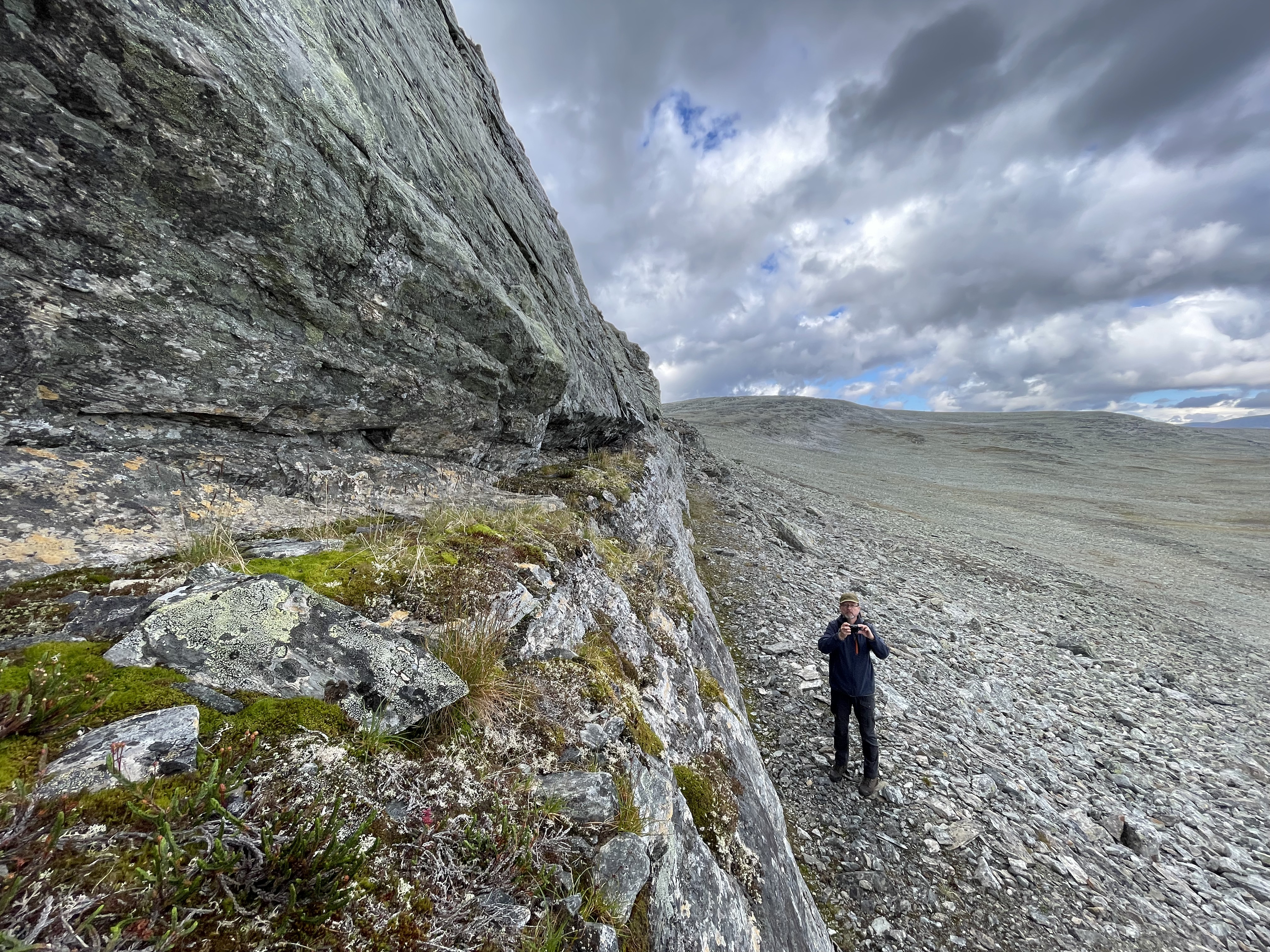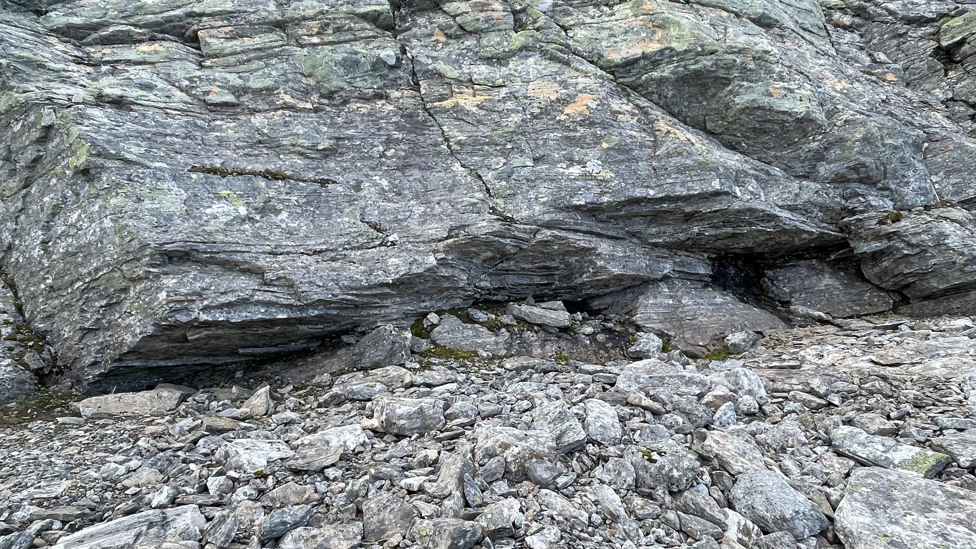 The potential resurgence area for any caves in the mountains between Njiellalanjávri and Toskaljärvi is a large cliff with a boulder field at the bottom. Two of the largest boulders form kind of a tiny shelter. Too small for a proper cave, but registering it here for completeness sake.
