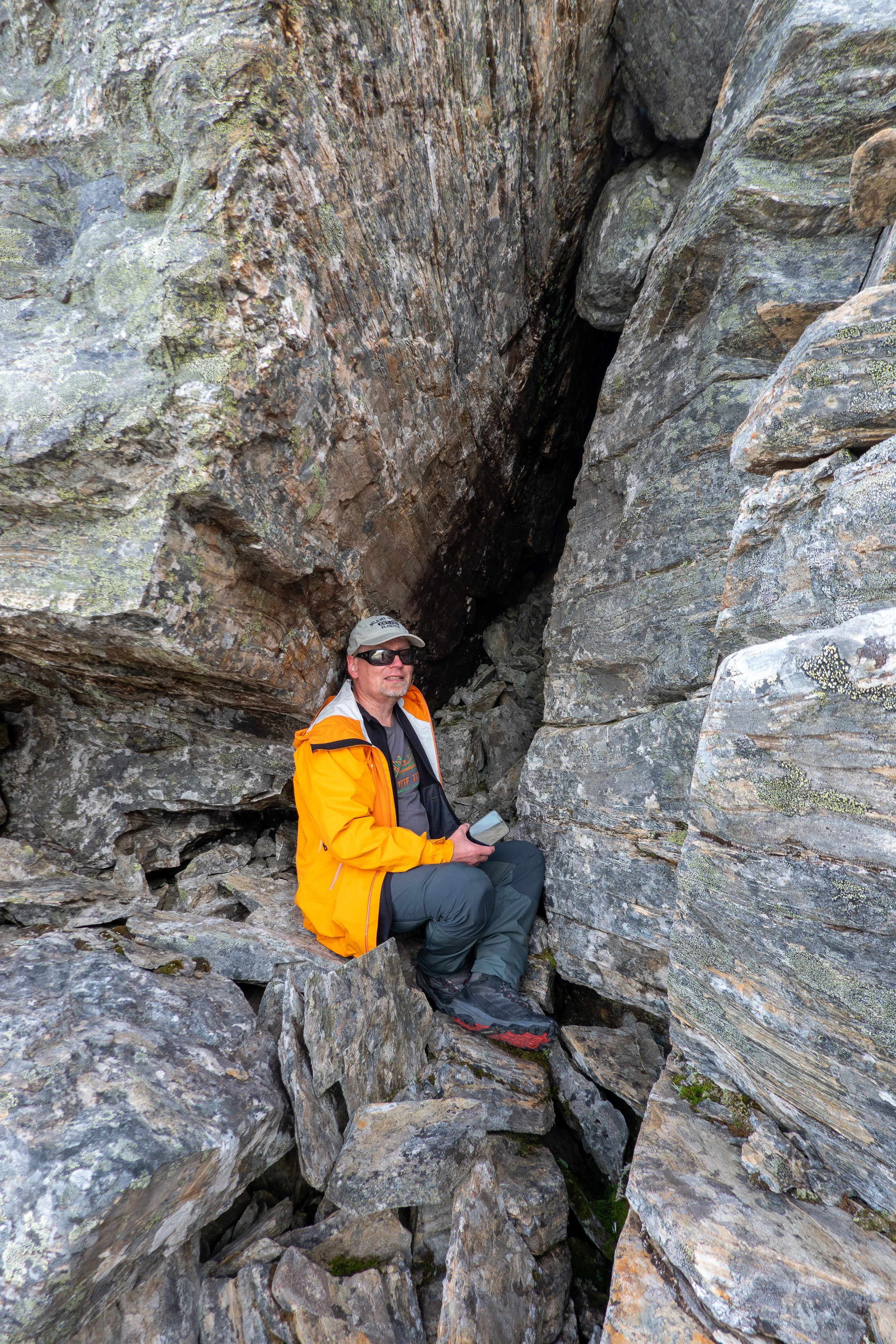 This is on the col when walking from Njiellalanjávri towards the Kopmajoki hut, between Veajetoaivi and Skaidi. It is basically a small leaning rock pieces on a small cliff face, enough to form a tiny roof cavelet. But not officially a cave.