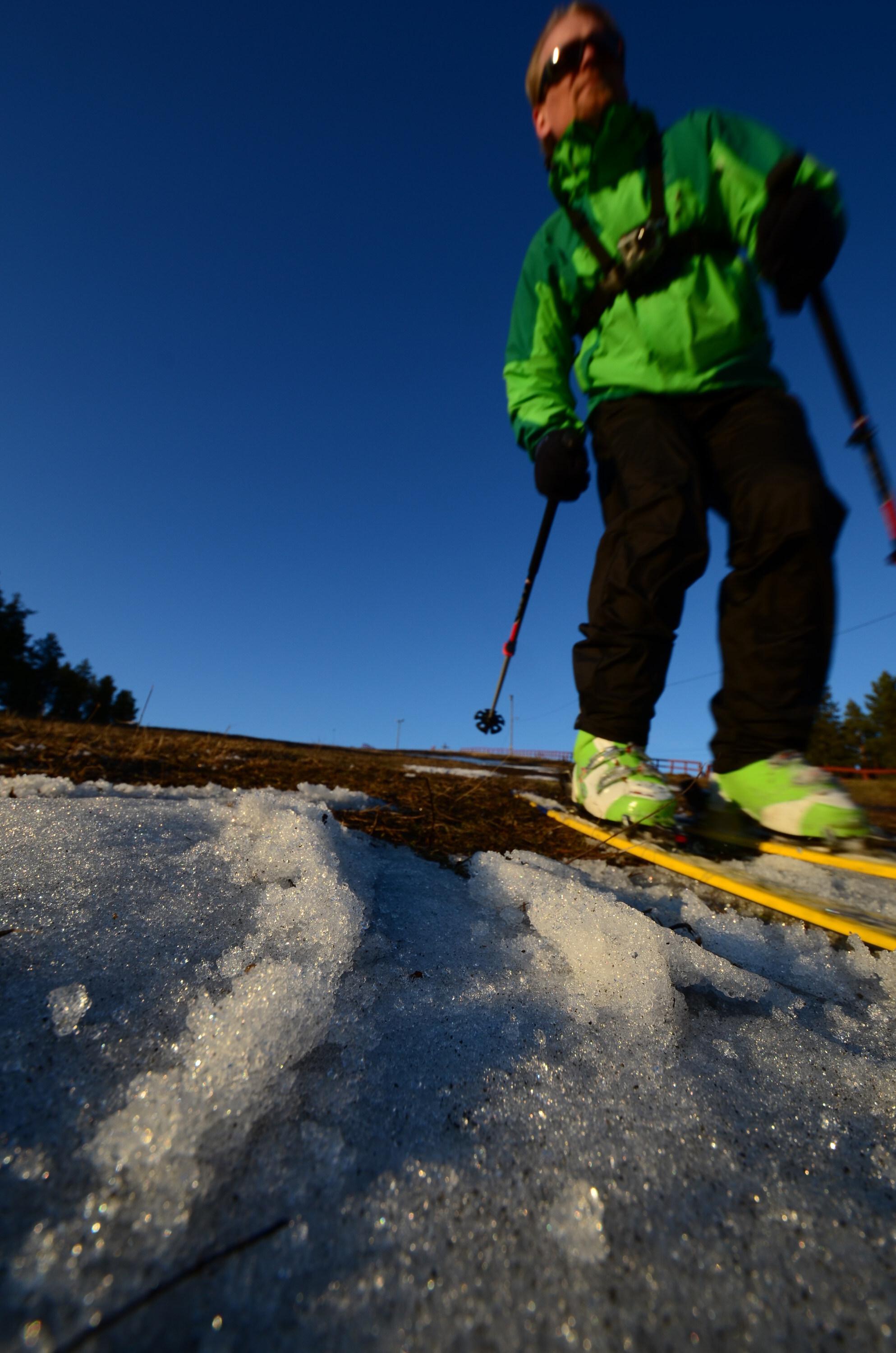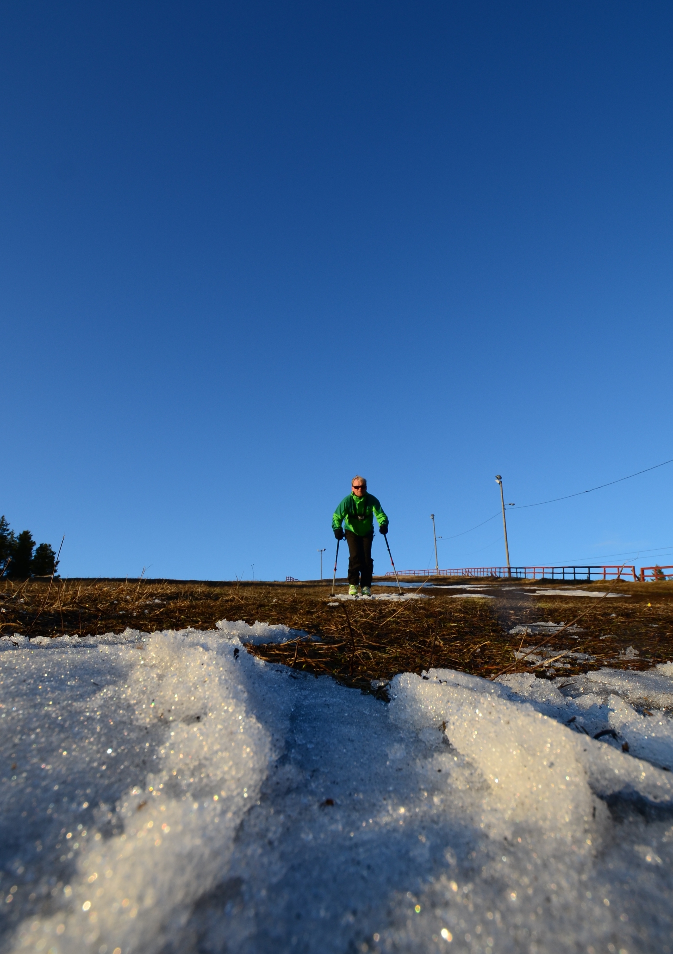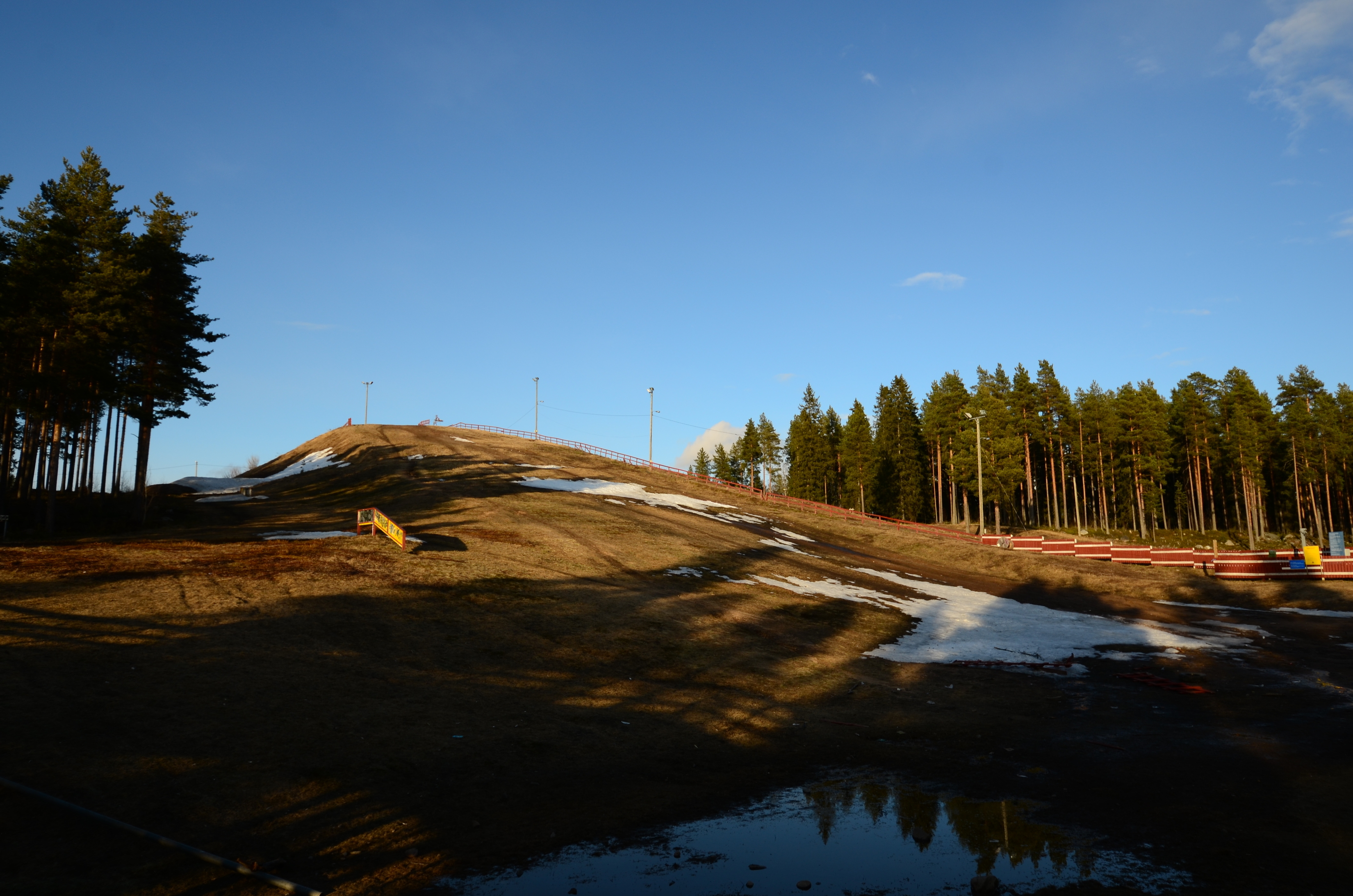 Köykkyri is Finland's smallest ski center at a whopping 25 meters of altitude difference. The length of the ski run is 135 meters. Fortunately, I do not have to ski the entire length this time - that would be a full-day expedition. Almost all snow has melted, there's only small patches left. I try to ski them anyway, taking off my skis for the parts between the patches.