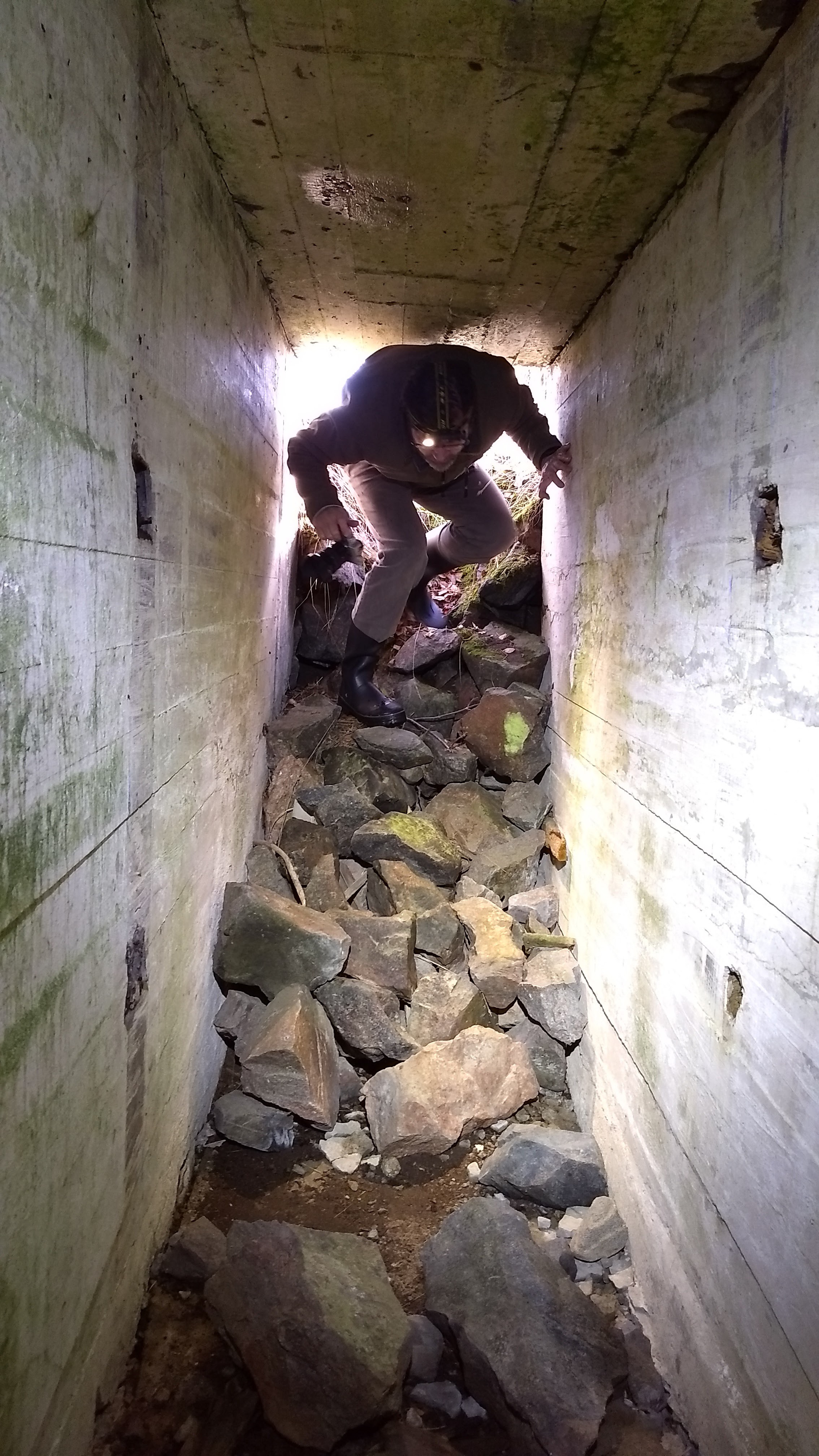 Finally, we could better see the design of this basic form of the bunkers in the Porkkala parenthesis area. This is the most common, small bunker form. A few of the bunkers are of the larger, 2-story variant with round hole for a large 100 mm gun. But the basic bunker here in Sepänkylä has this floor plan: