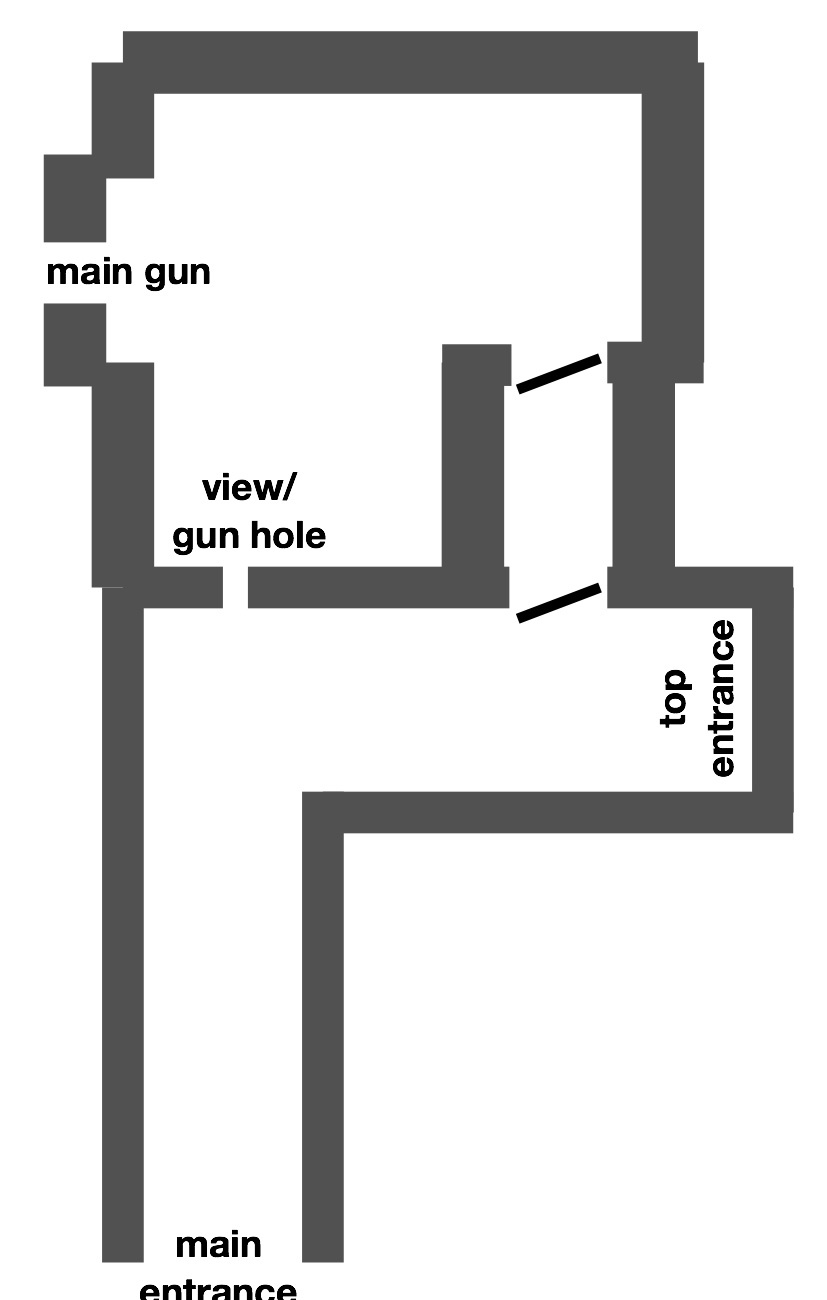 Other bunkers of the same form can vary on where the gun is placed -- in many places it is sitting on top of the bunker rather than on the side.