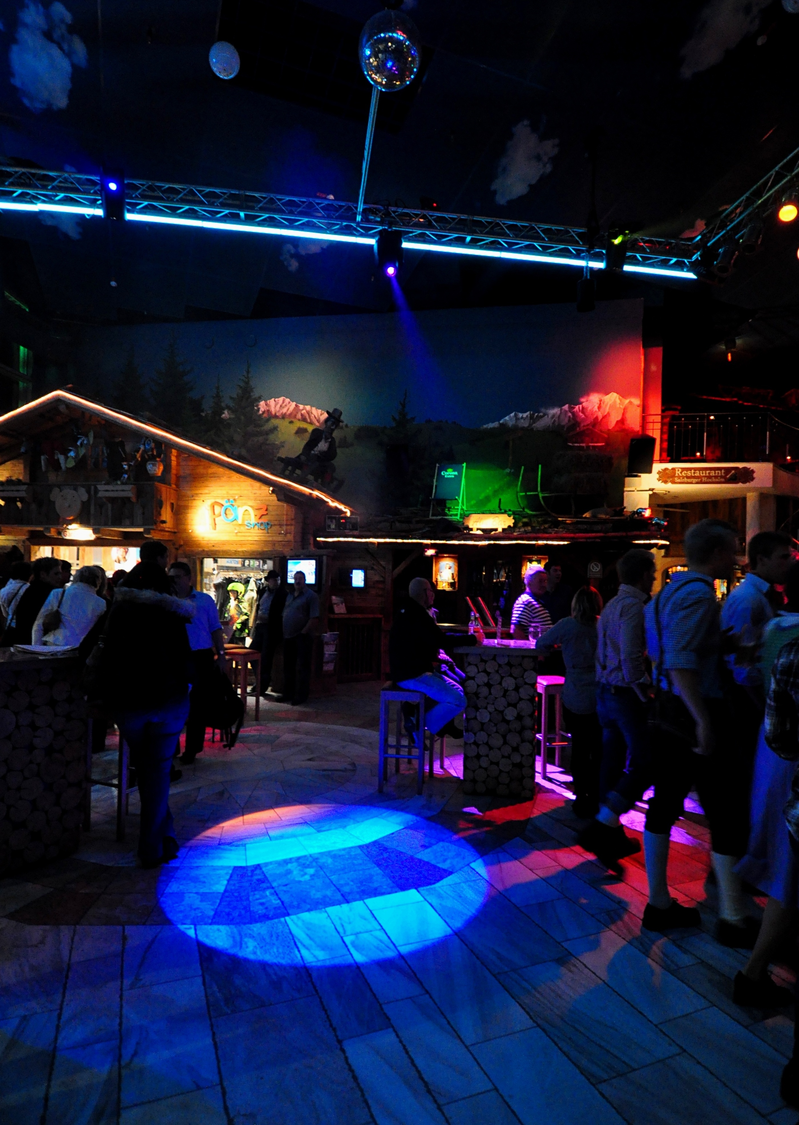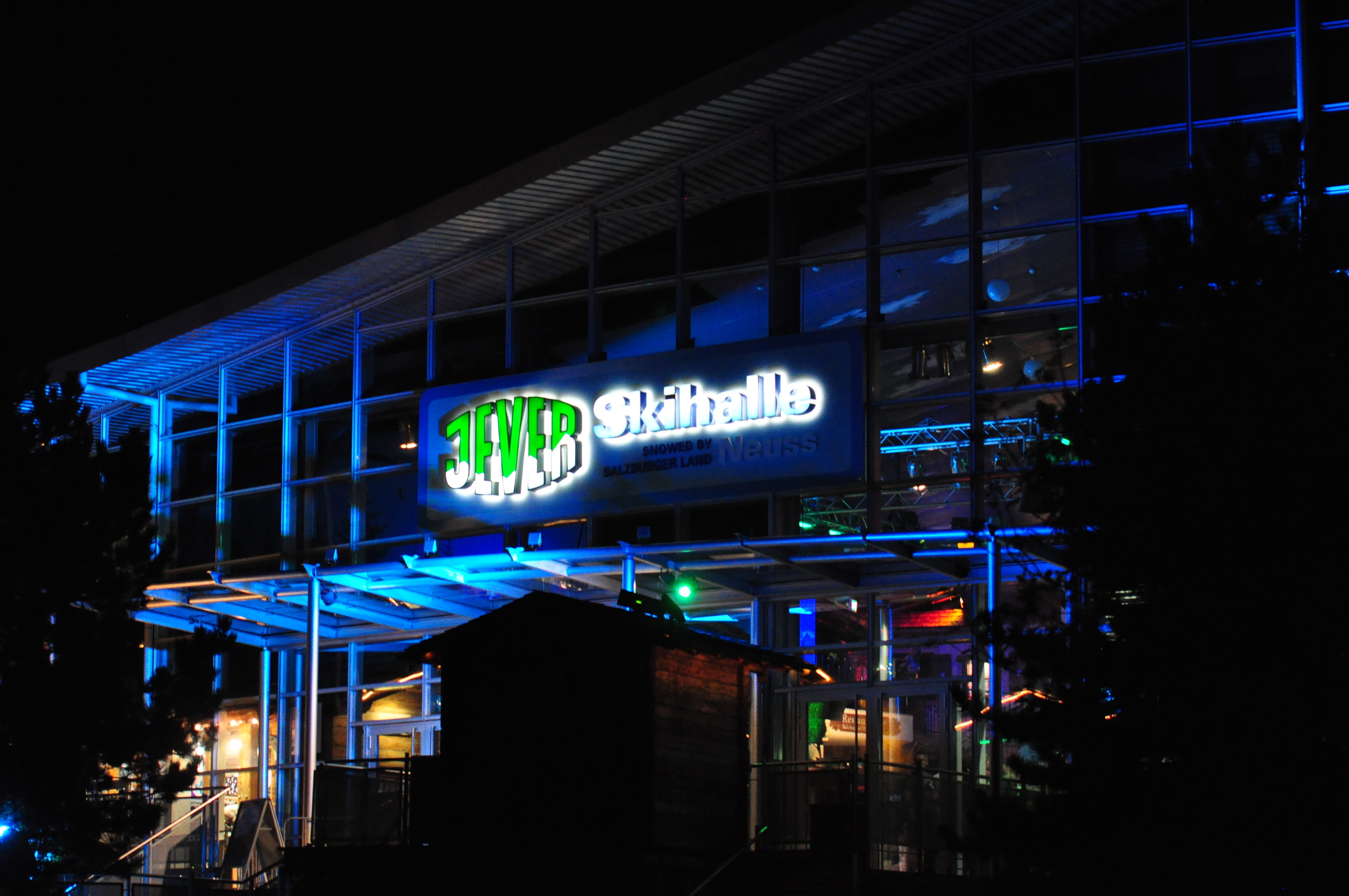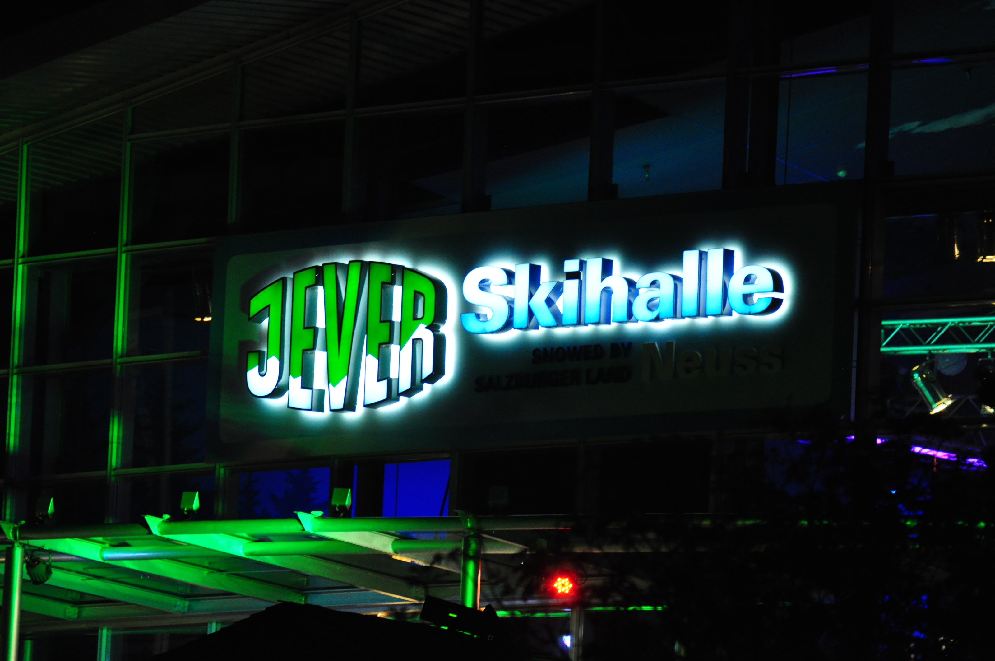 Jever Skihalle is a modern indoor sports and entertainment complex near the Dutch border between Düsseldorf and Köln. They house skiing, tubing, climbing, restaurants, bars, nightclubs, and a classy hotel. When I arrived Friday evening at 10PM, a steady stream of party goers were arriving to the nightclubs and bars. The ski slope is the most visible landmark around, but otherwise skiing appeared to be like a small side note at the time. I entered through the nightclub door, for instance, and had to find my way through the building to the ski area.