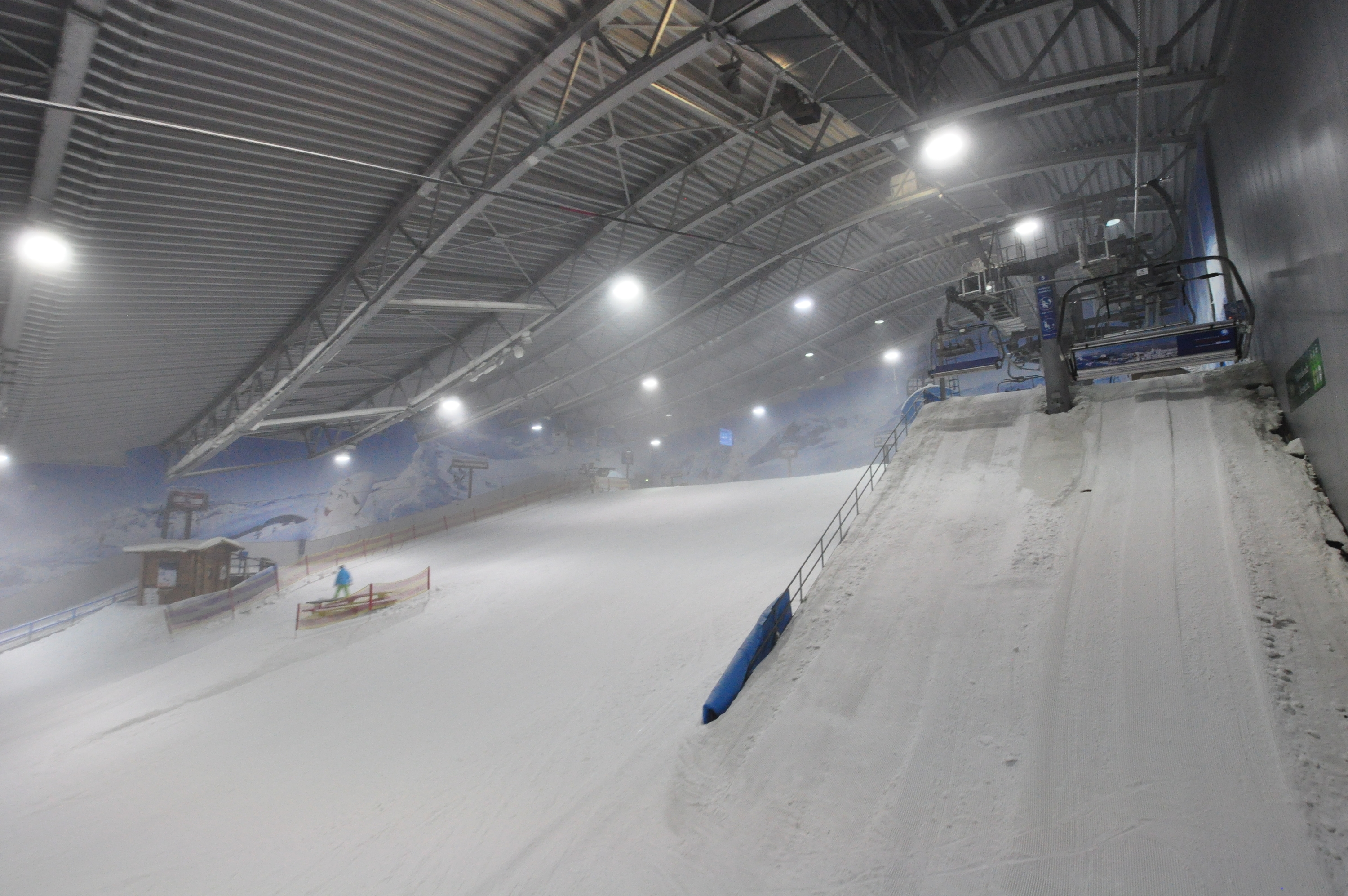 The main slope is nice for two reasons. One, this is yet another indoor ski area that likes to run its snow cannons during the opening hours. I think this is awesome, as it creates a winter feeling, reduces visibility to the structures, and creates a more realistic skiing experience. Not to mention that skiing on fresh snow is nice. Two, they have the only indoor quad chair lift that I have seen besides the one in Dubai. The lift in Dubai is painfully slow, but this one runs at the same speed a chair lift would run on a real mountain. At least a non-detachable ski lift. The lift can take 5000 people up the "mountain" per hour.