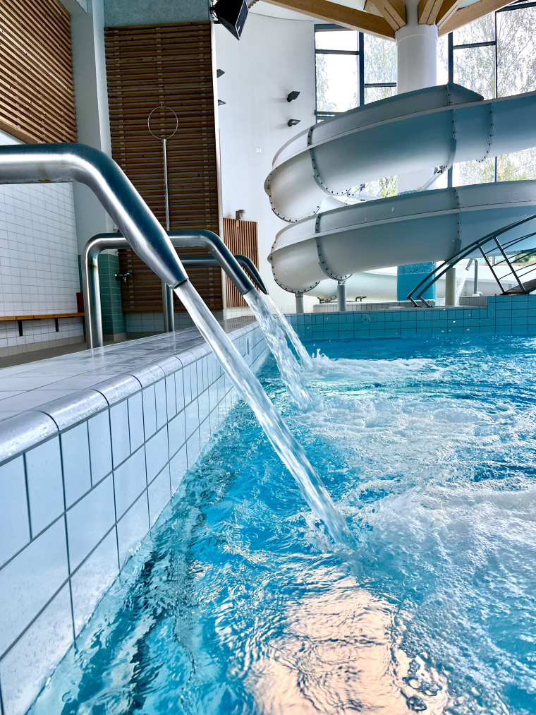 There's a 25 meter pool, a therapy pool, a waterslide, and a kiddie pool. In the washing rooms and sauna side they have two saunas (for both men and women), same type of Finnish saunas, no steam rooms that I could fine. But I prefer the Finnish saunas anyway.