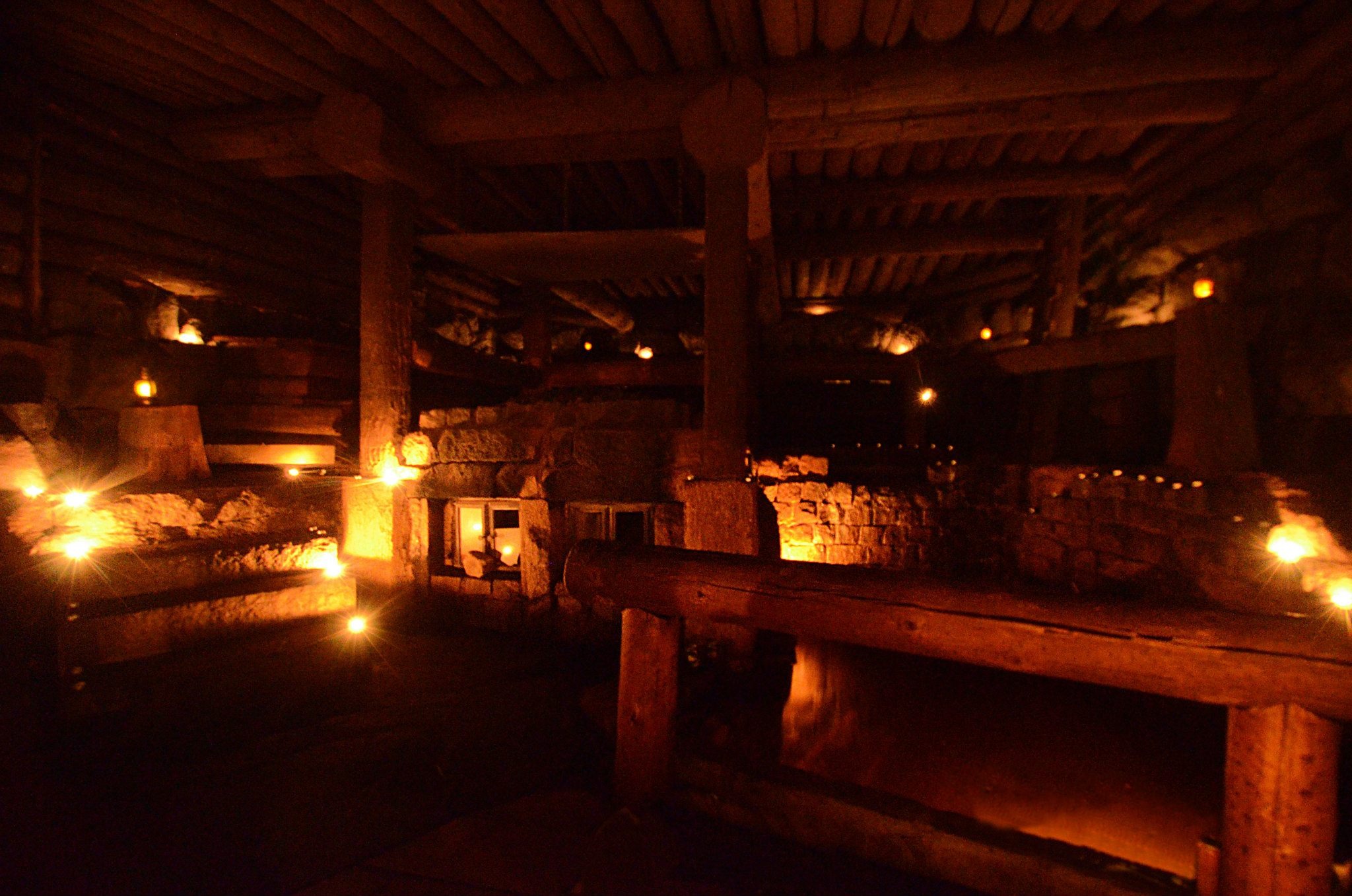 Smoke sauna for 45 people, with a small waterfall and a warm pool, all inside. Takes three days to heat up. This is possibly one of the greatest sauna experiences I've had.