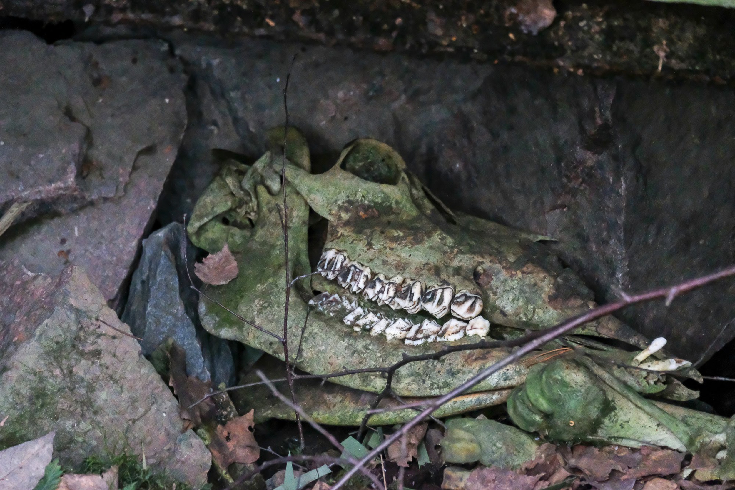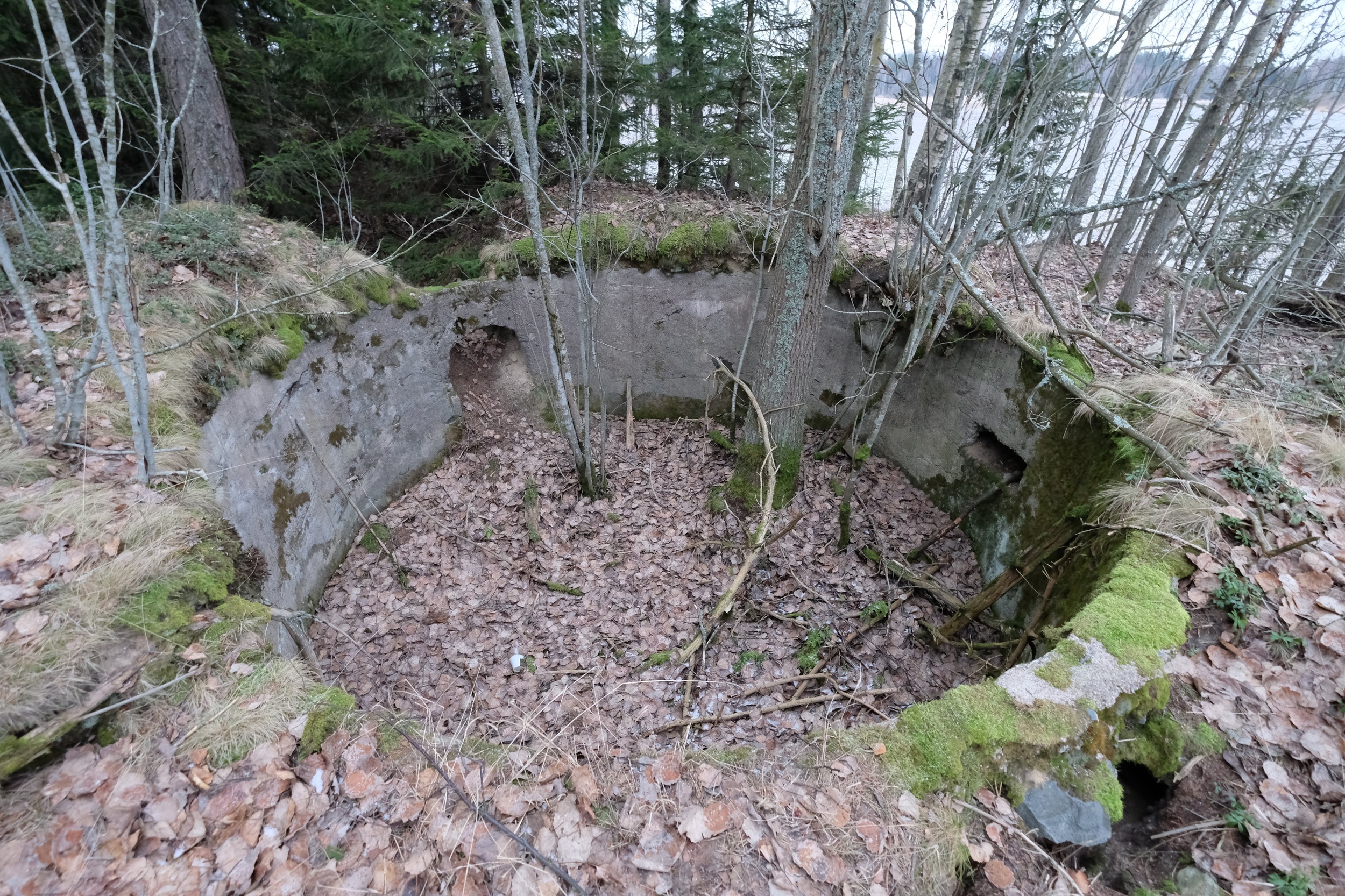 But on the Kasabergen south of Stubböle, we found two bunkers. The first one to the north of Kasabergen greeted us with moose skulls in the gun mount hole. The normal entrance tunnel was blocked, so we had to enter that way. The bunker was almost completely filled with water, but I was able to walk inside on top of some rocks.