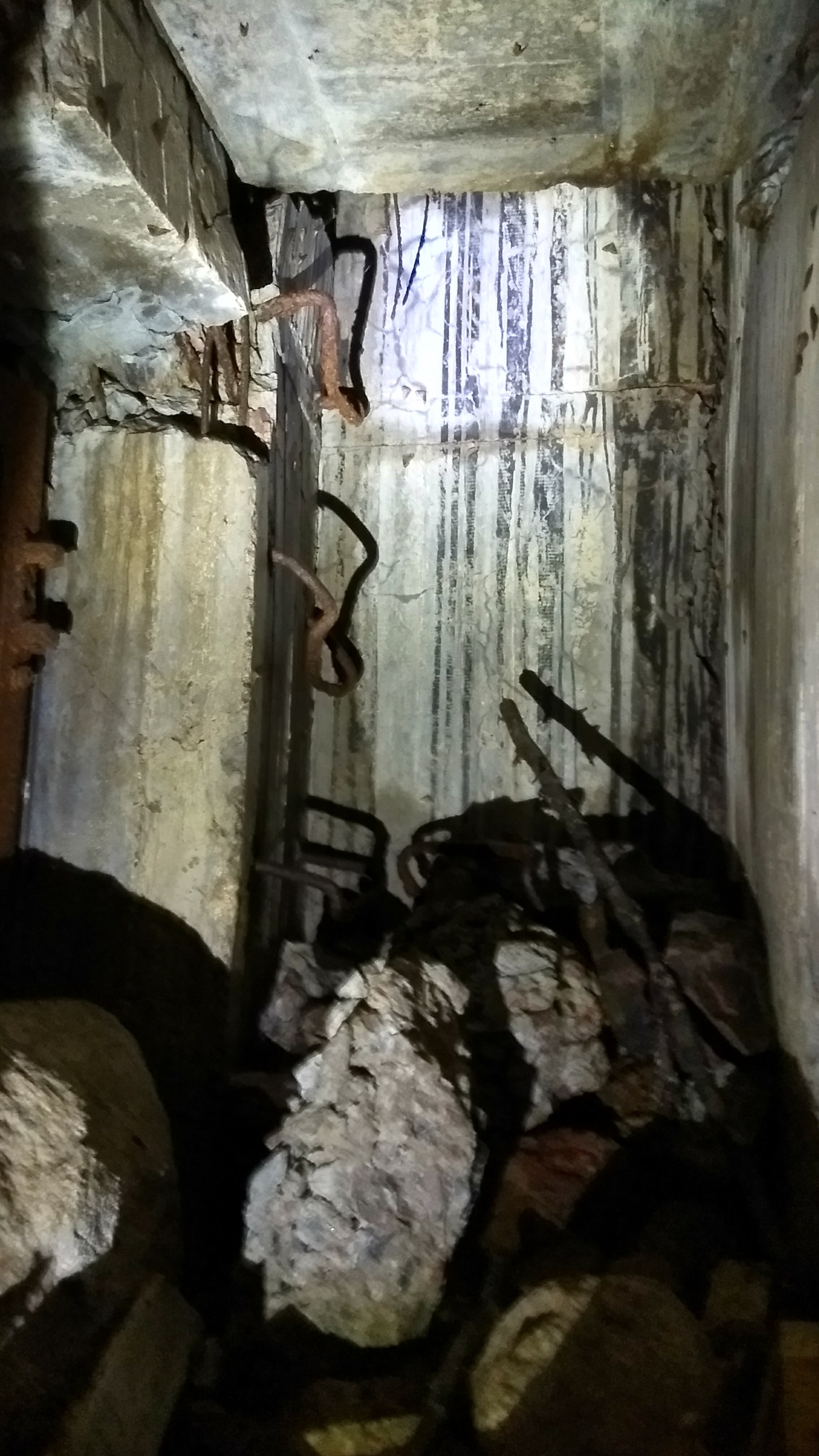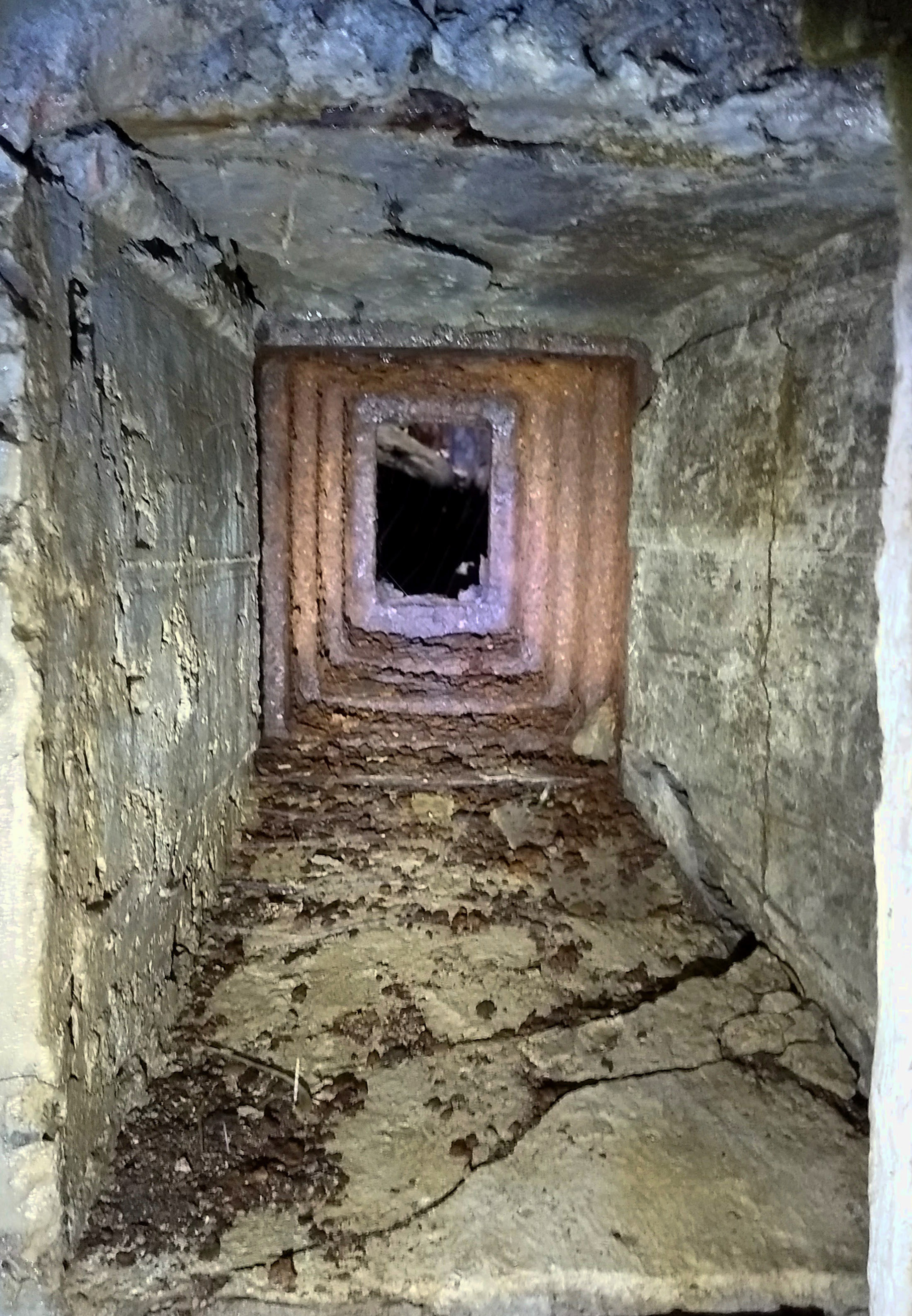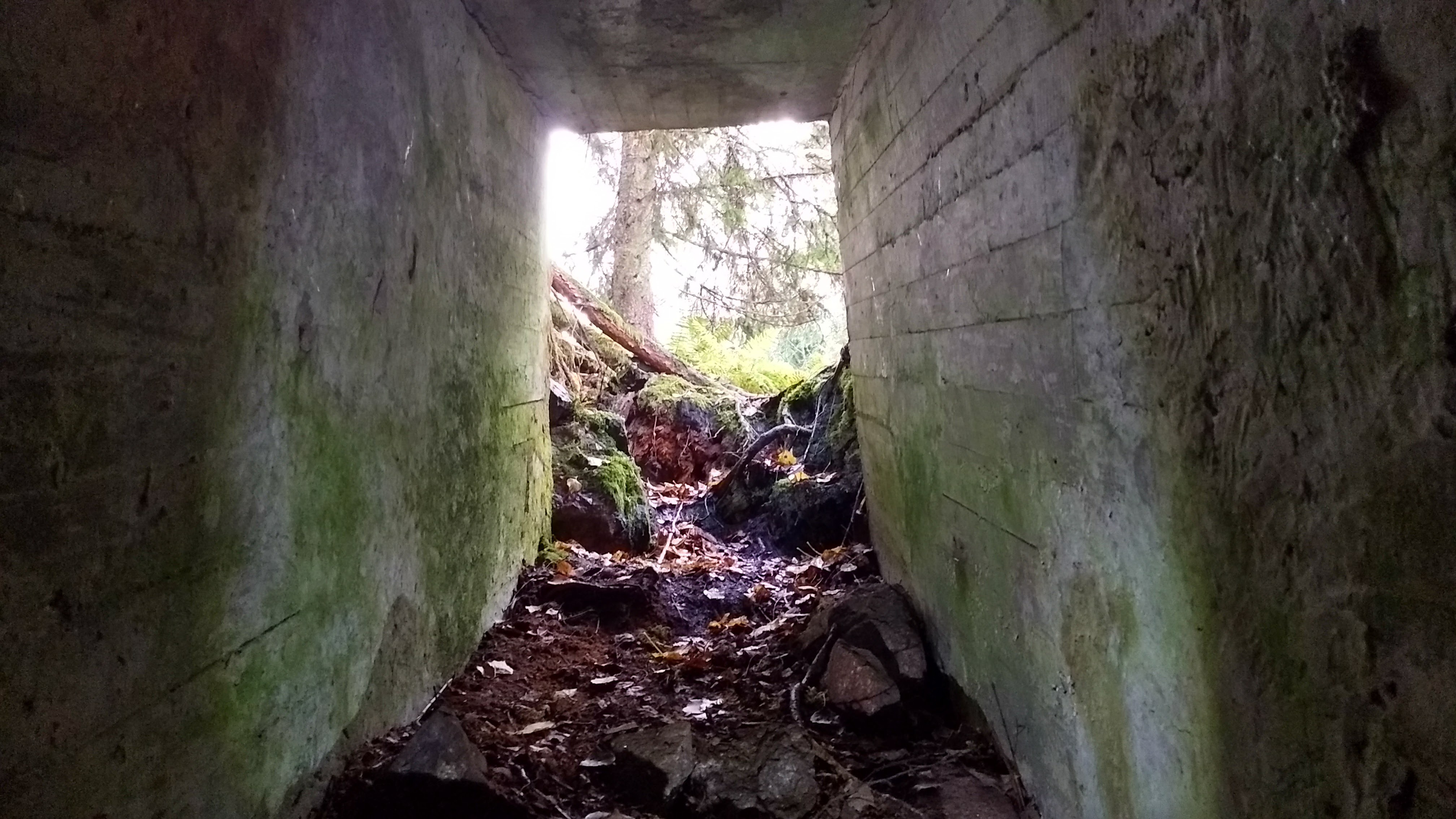 But to my surprise you can actually enter through the door, walk down a couple of meters, and most of the underground part of the bunker is still there. There's the sloped entrance tunnel, an almost intact small room to the left, a corridor to the right with a blocked exit towards the roof, and a big mostly collapsed room. But you could probably crawl from the collapsed room to the one of the "wells" -- probably a gun mountain point.