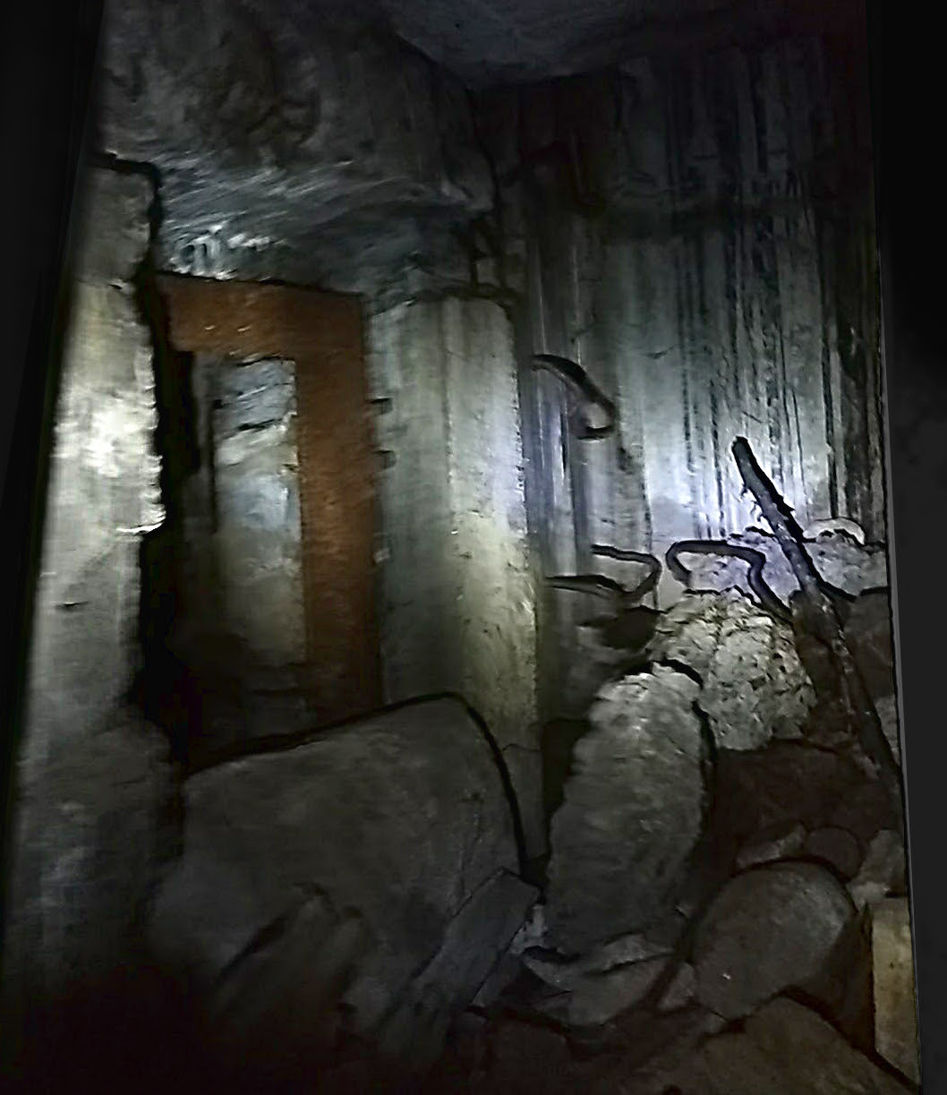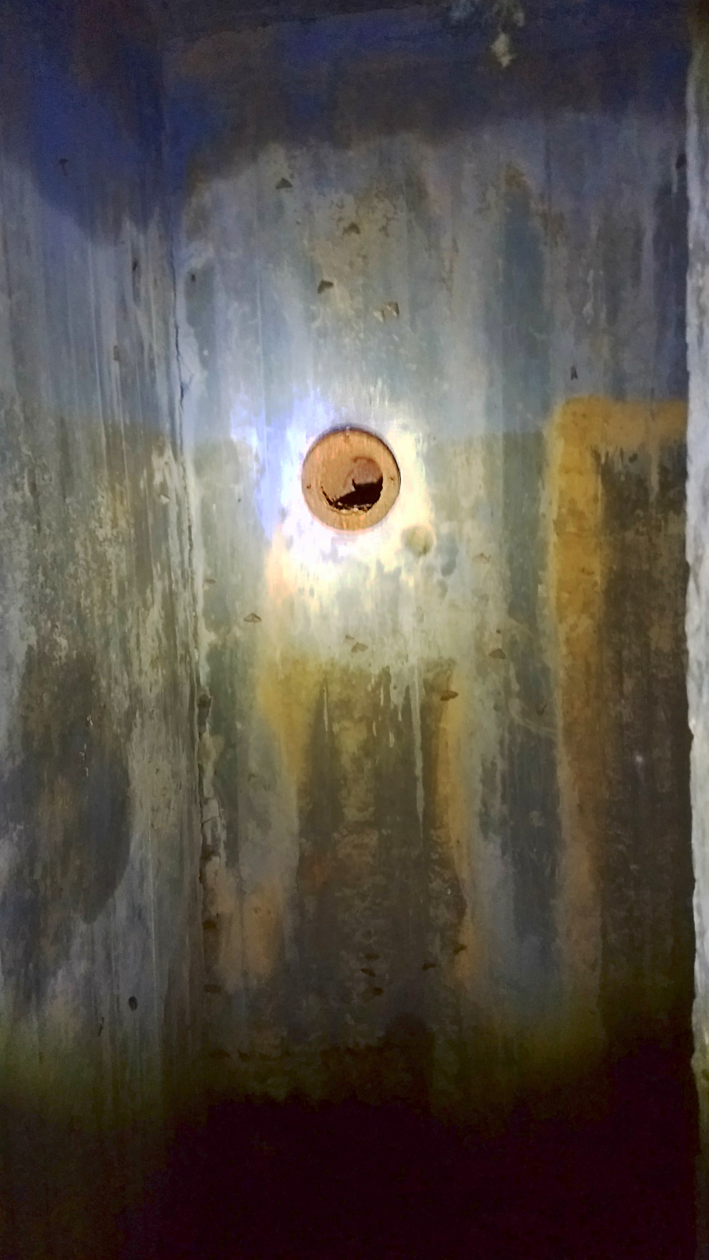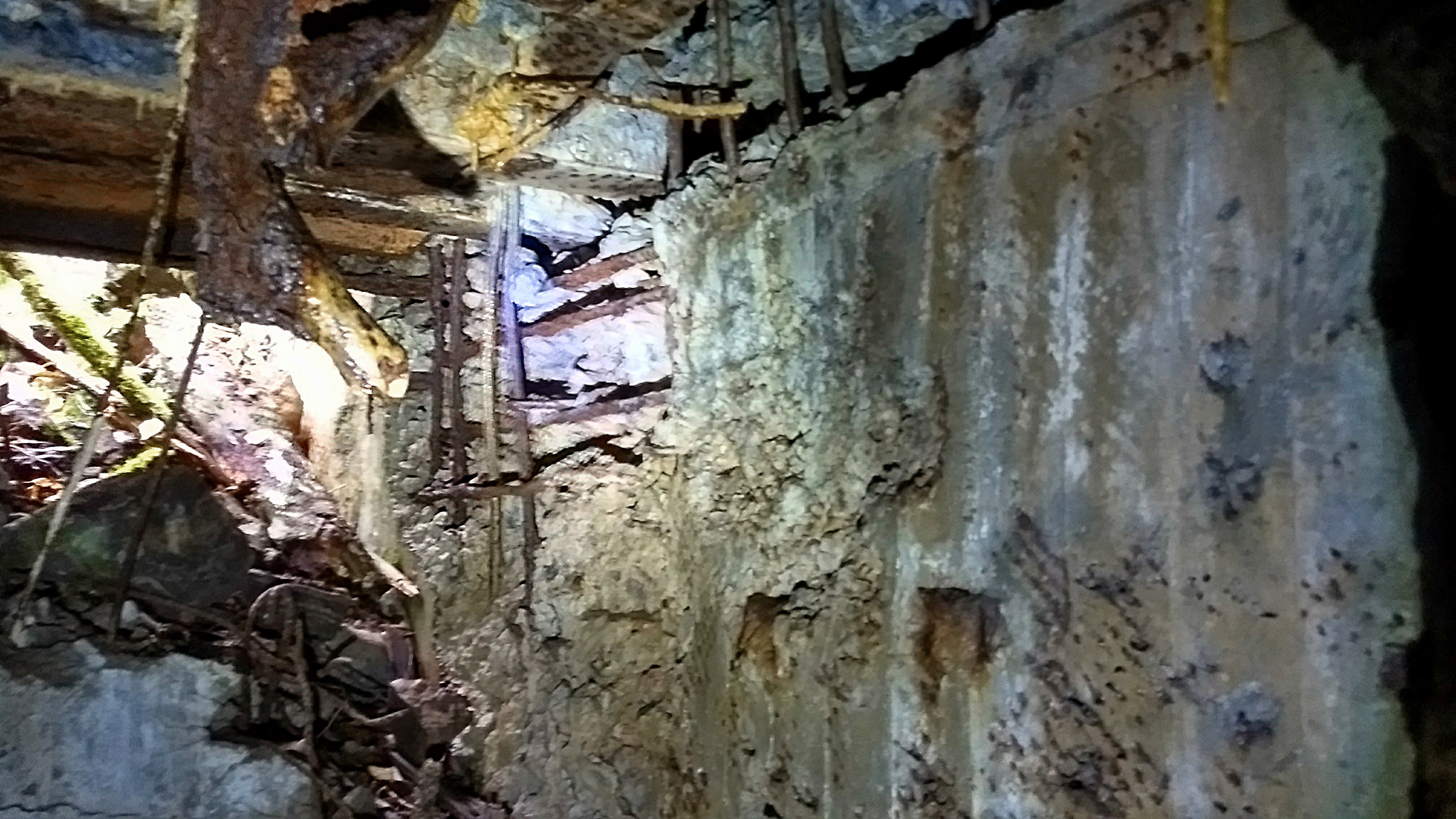 But to my surprise you can actually enter through the door, walk down a couple of meters, and most of the underground part of the bunker is still there. There's the sloped entrance tunnel, an almost intact small room to the left, a corridor to the right with a blocked exit towards the roof, and a big mostly collapsed room. But you could probably crawl from the collapsed room to the one of the "wells" -- probably a gun mountain point.