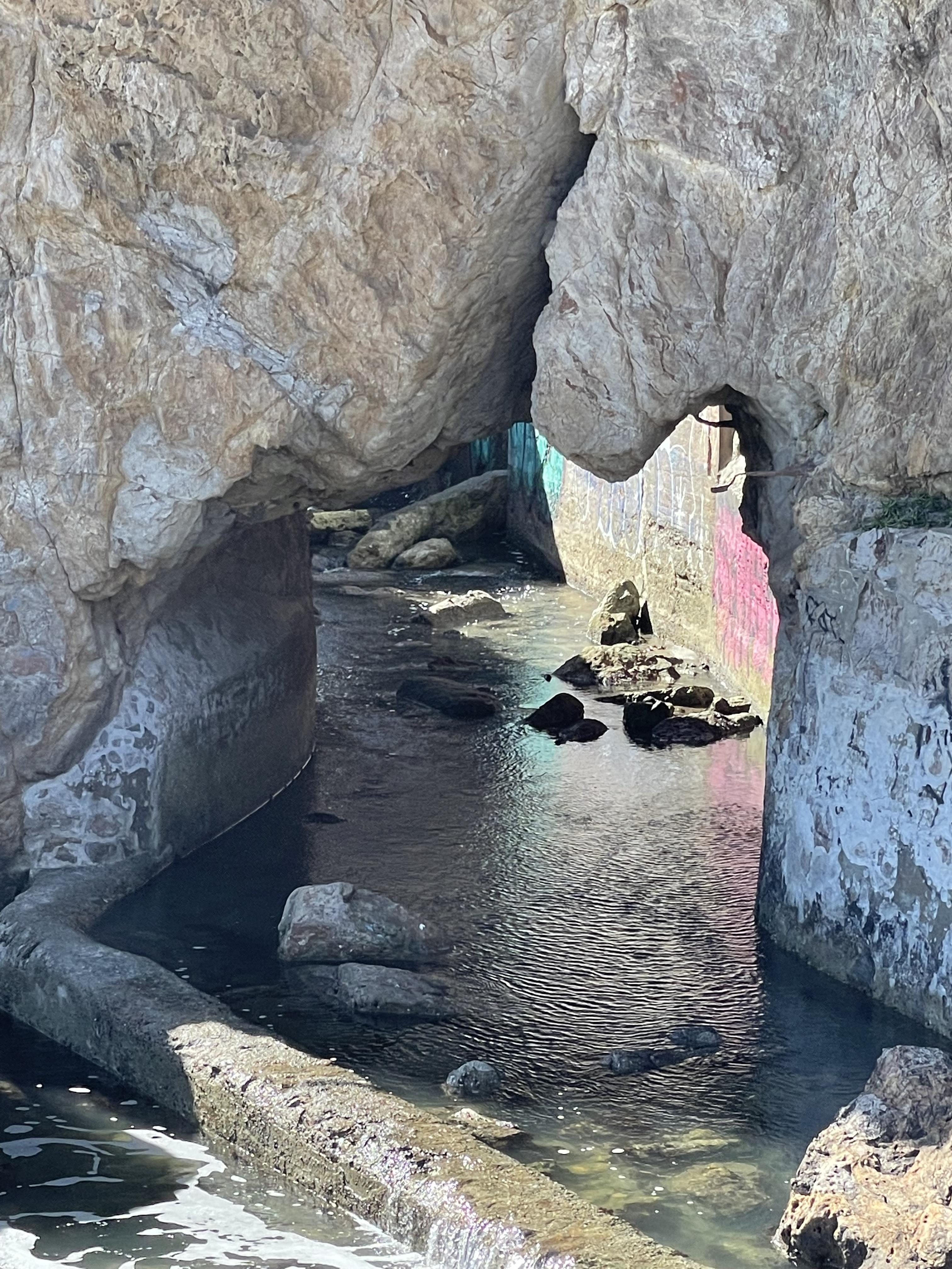 There's also a lower tunnel that is usually flooded. Apparently the lower tunnel was used to pump seawater during low tides to slowly replace the pool water; at high tide the water would naturally flow to the pools and replenish them within one hour. It doesn't seem to be easily accessible today, or at least one would have to be ready to use rubber bootss.
