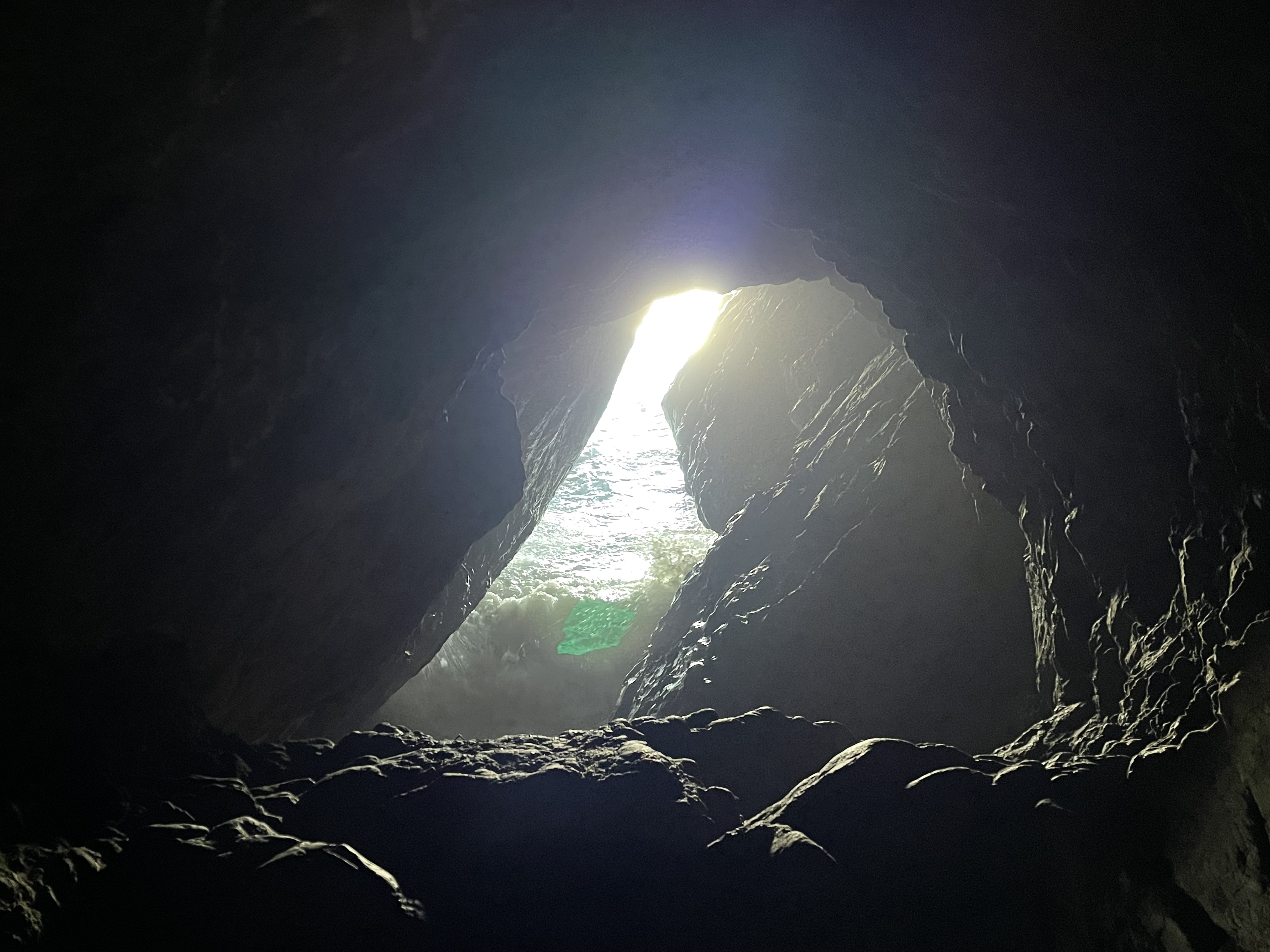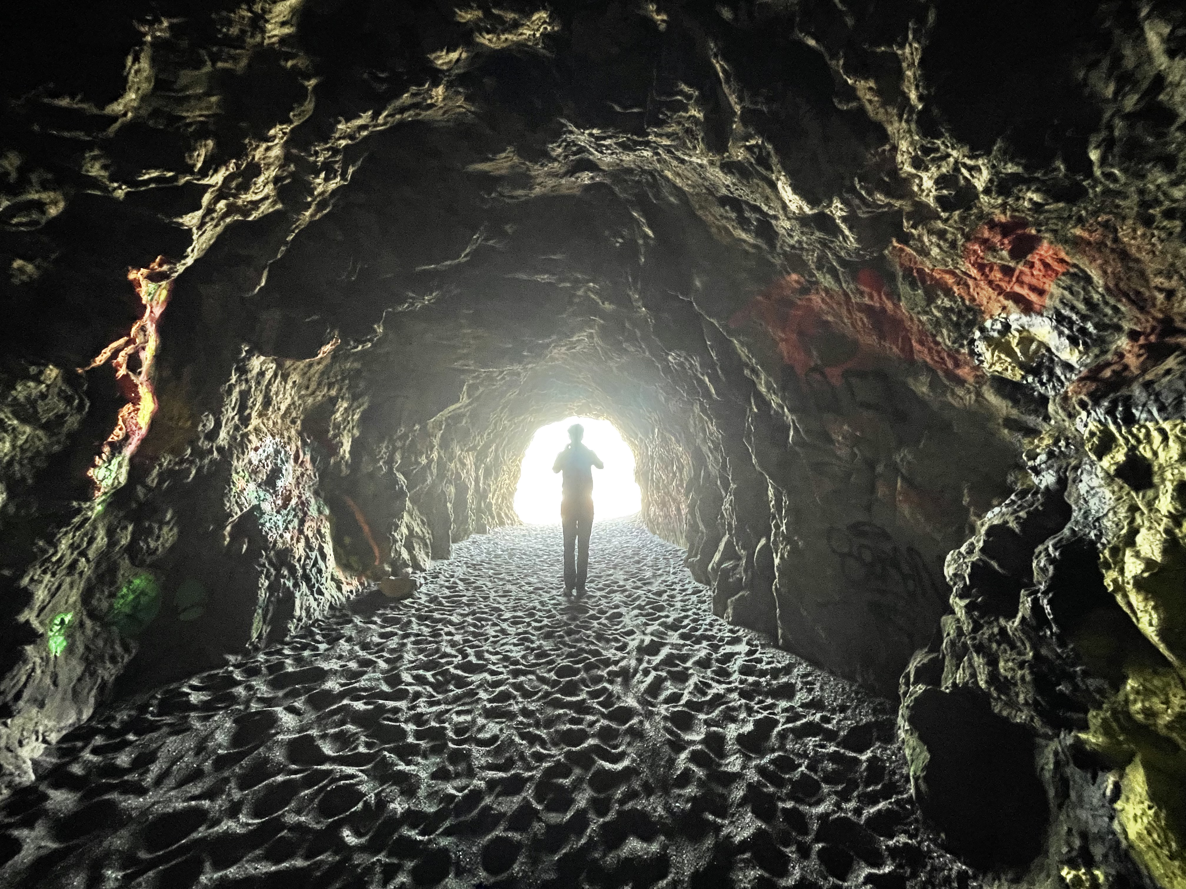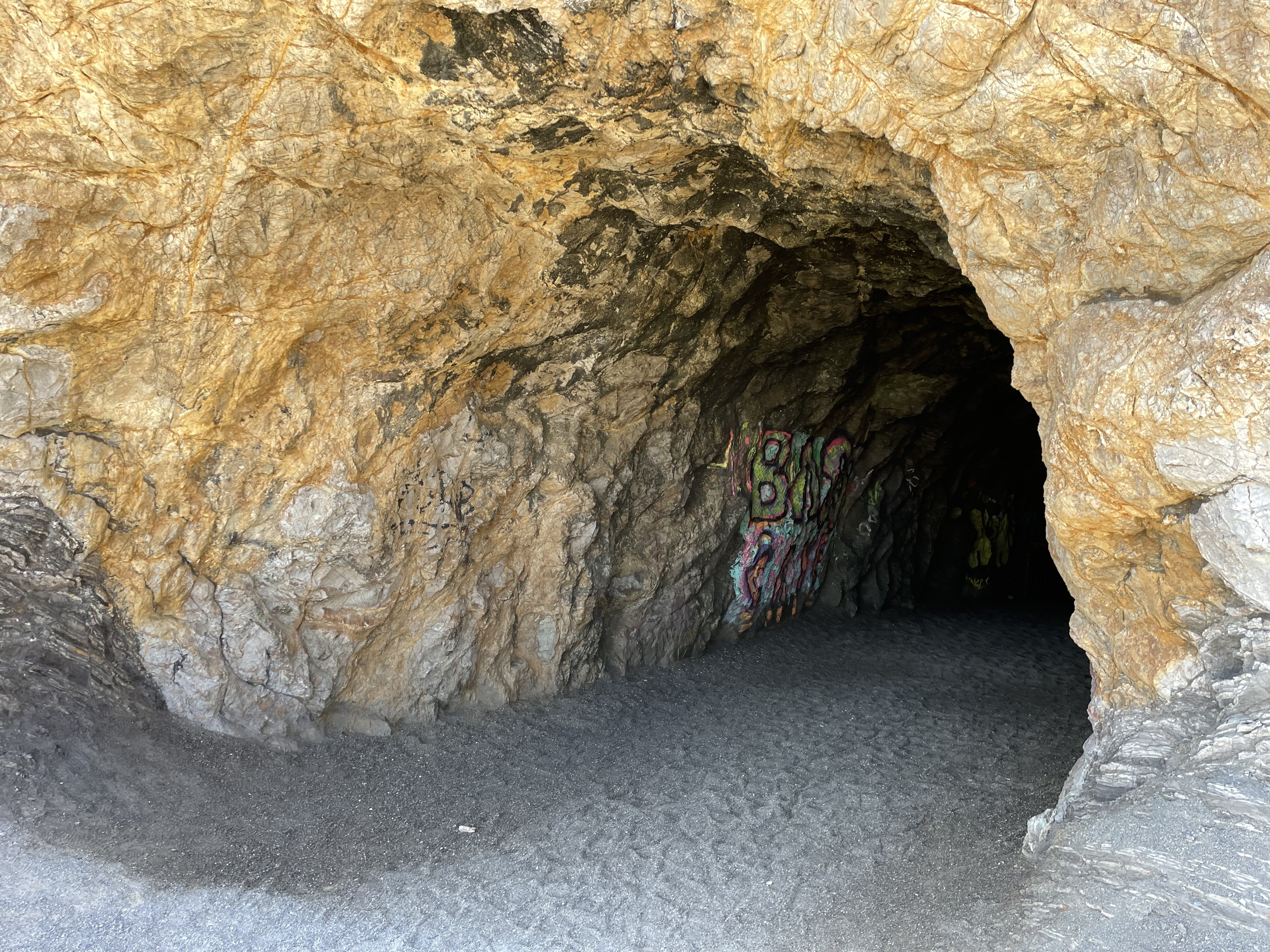 The tunnels are approximately at N 37.780777 W 122.514105. Note that there are multiple tunnels, the main walkable tunnel that is easy to spot, it goes through the cliff and opens up on the other side to rocky views of the sea. You can't continue, but can see the view. Inside the tunnel there are holes that lead to sea caves and cracks. I couldn't tell if these were there in the beginning, or if the rock has eroded since building the tunnels.
