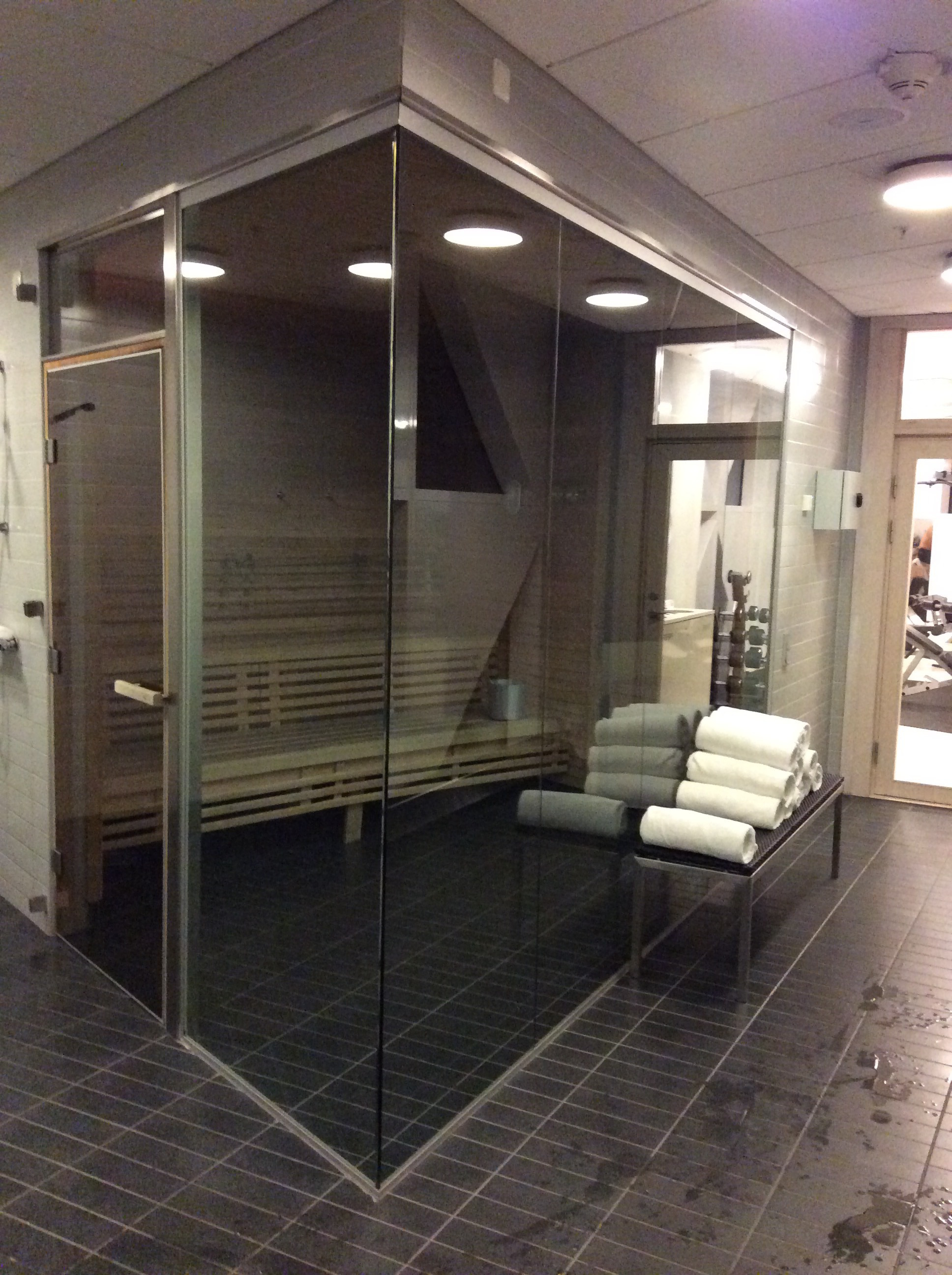 Interestingly, the sauna was not directly next to the walls of the building, but the shower and cooling down areas surrounded it. I would have thought a window directly from the sauna to the outside would have provided more interesting views. Also, the overall area was oddly arranged, as the gym area was between dressing rooms and the sauna.