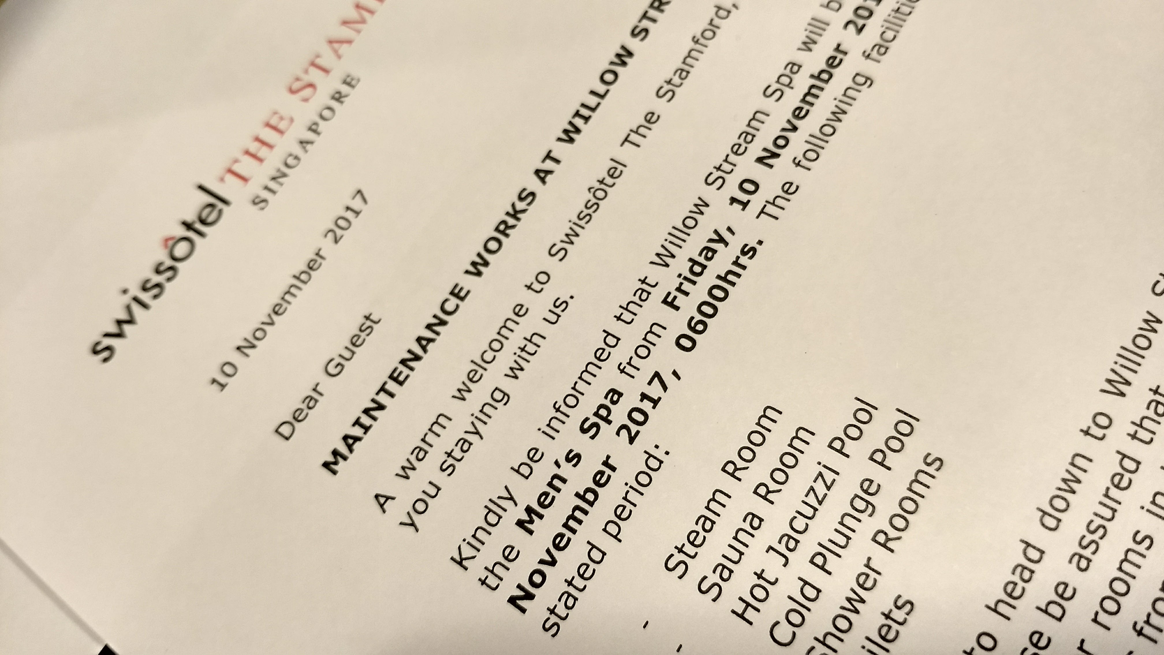 So I went to the sauna at Swissotel the Stamford, Singapore. The spa area, Willow Stream, is incidentally on the linked, co-operating Fairmont side.