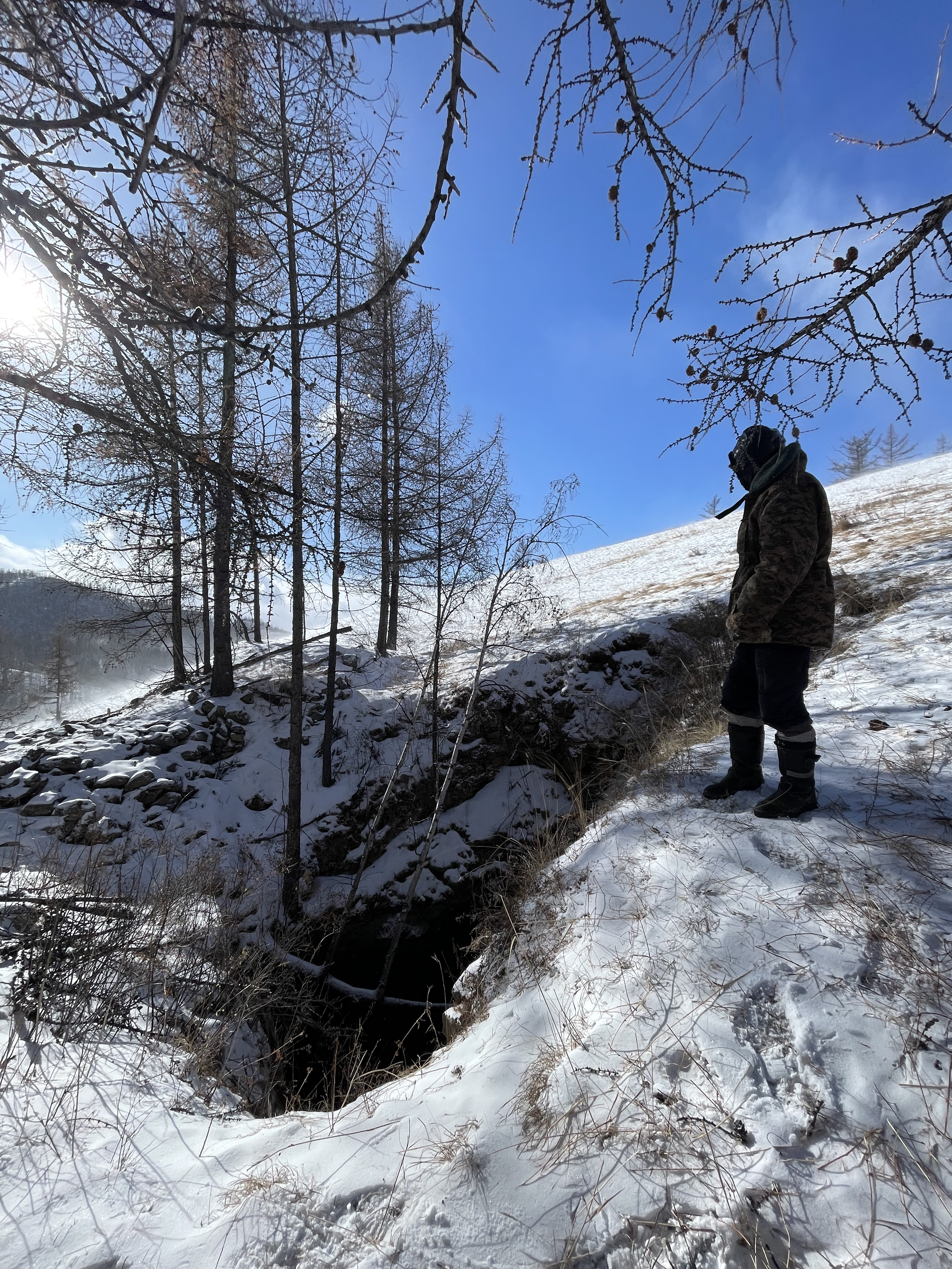 The East Crystal Cave, also in Terelj National Park. East of the main road this time. This is also a mine, and one that I visited. Or at least stood on entrance to it. You can't enter without ropes, the mine is a tunnel straight down until it branches off horizontally. I hiked 5 kilometers (one-way) from nearest road to get here. The coordinates are N 47.912347 E 107.48860.