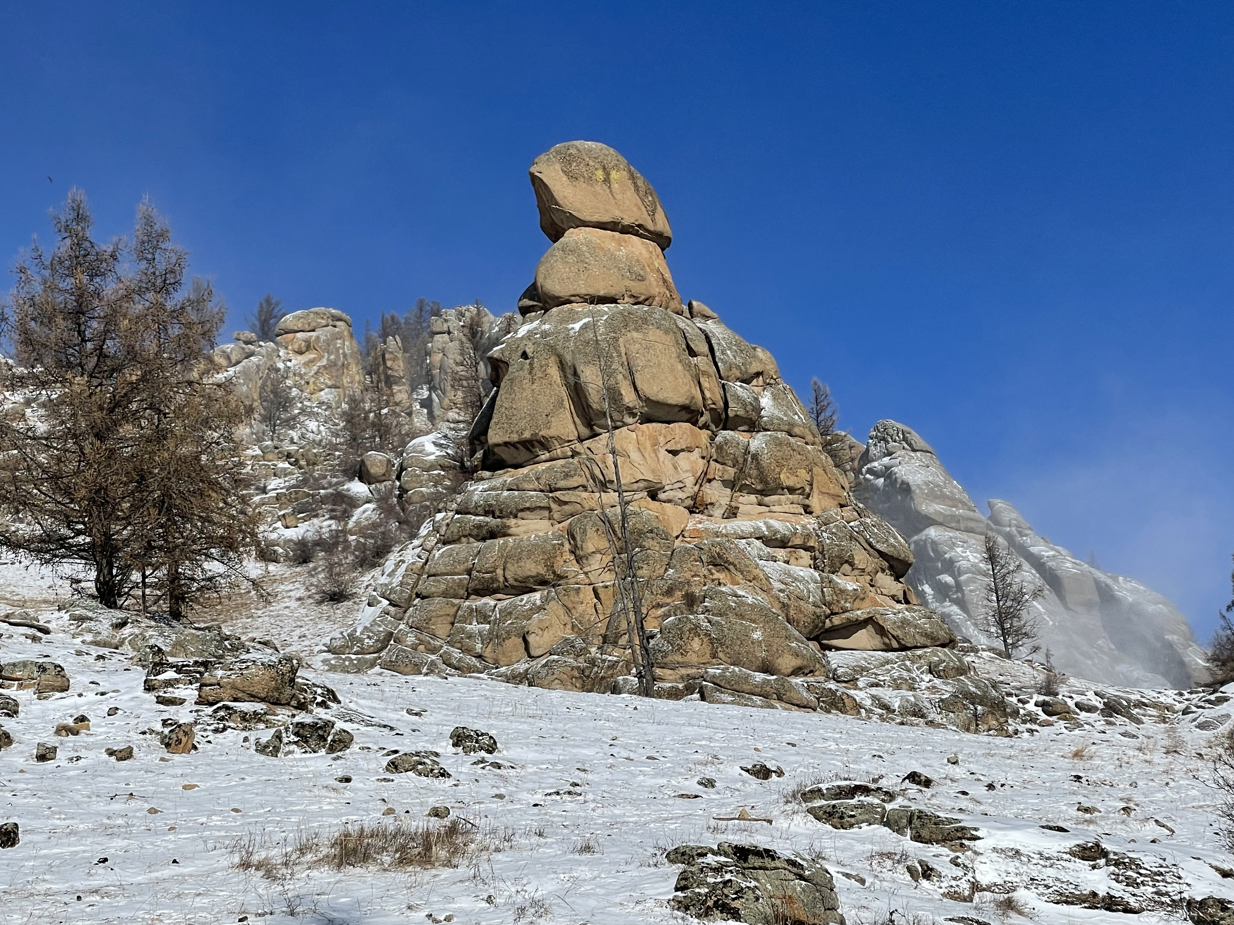 A tiny roof cave in boulders (or cavelet), again in Terelj National Park. The coordinates are N 47.910005 E 107.48736. The sheltered area is approximately 2.5 m.