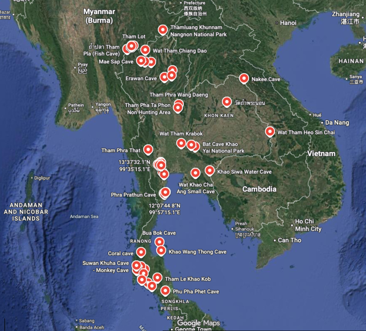 I have created a Google Maps place list of all publicly known caves in Thailand, or at least ones that I was able to find from Google Maps. Hopefully this is useful for some other cave tourists.