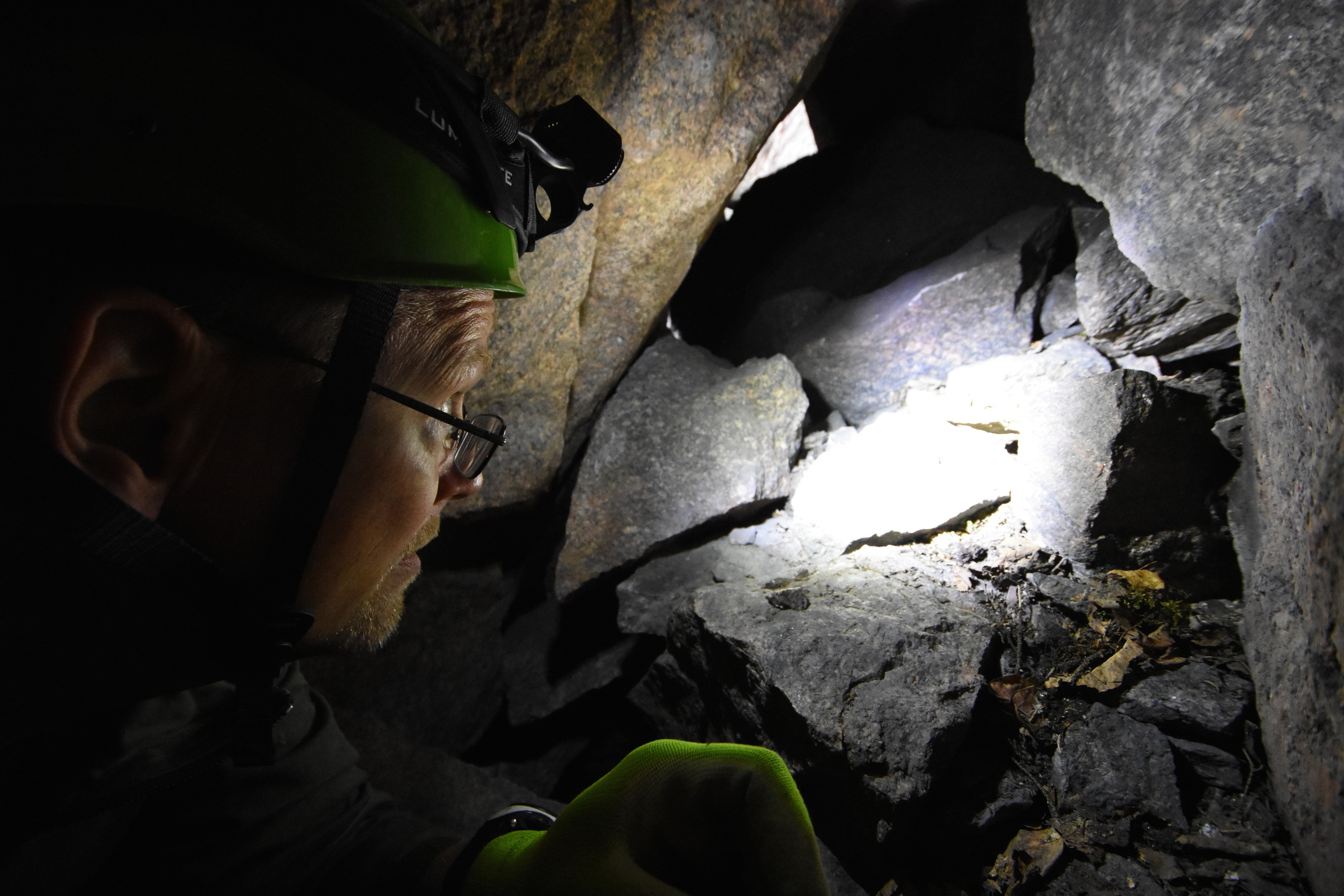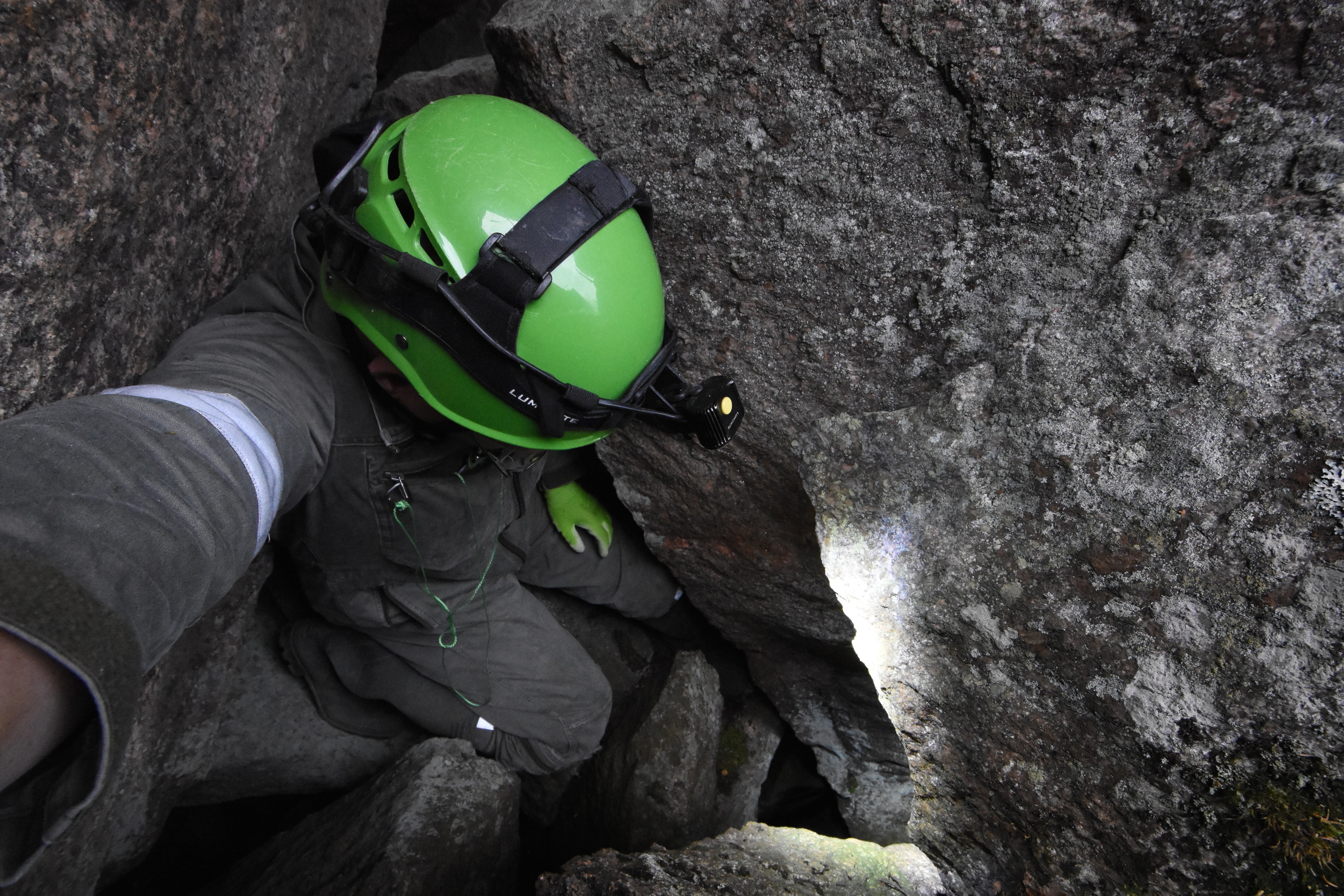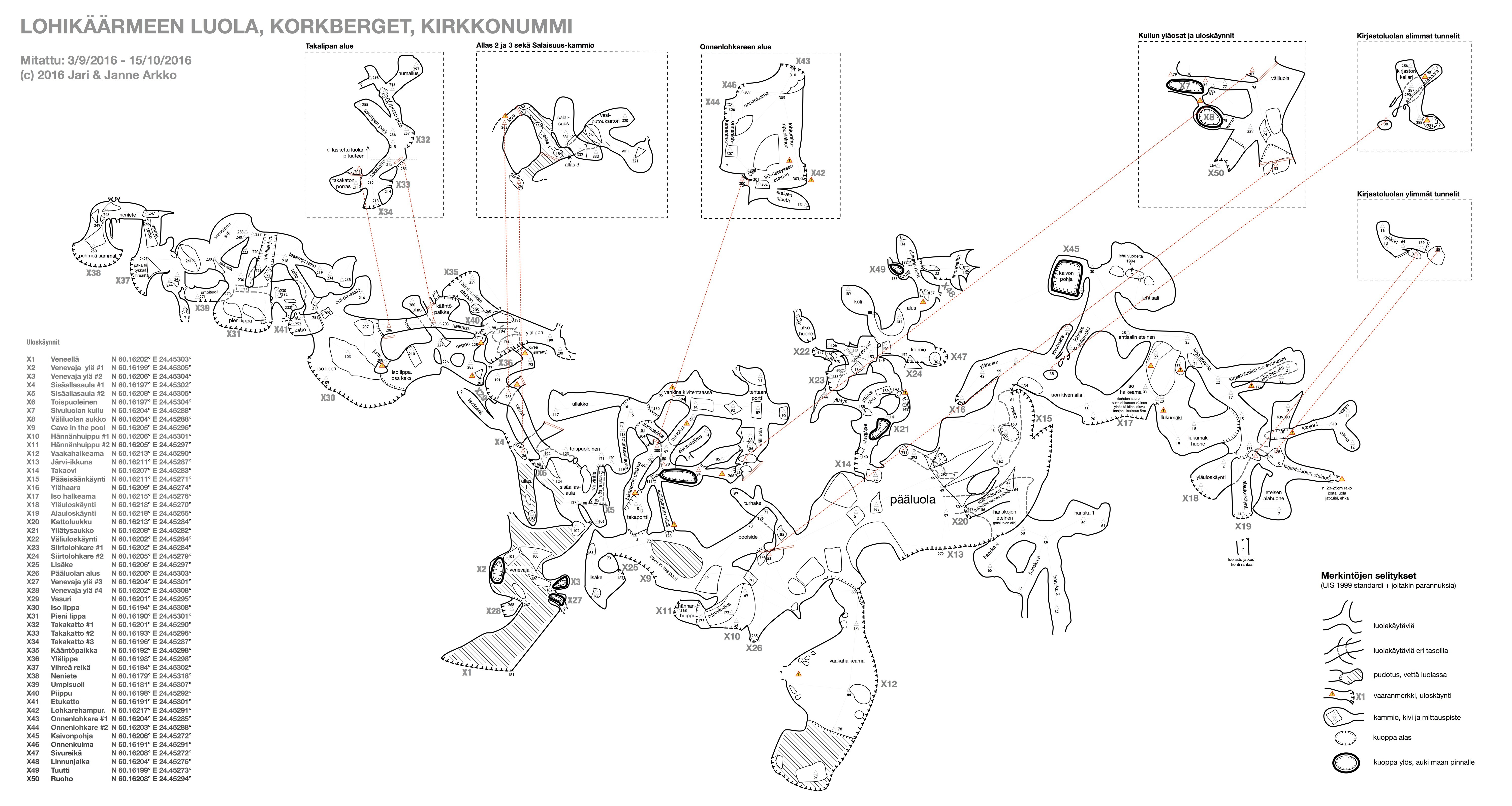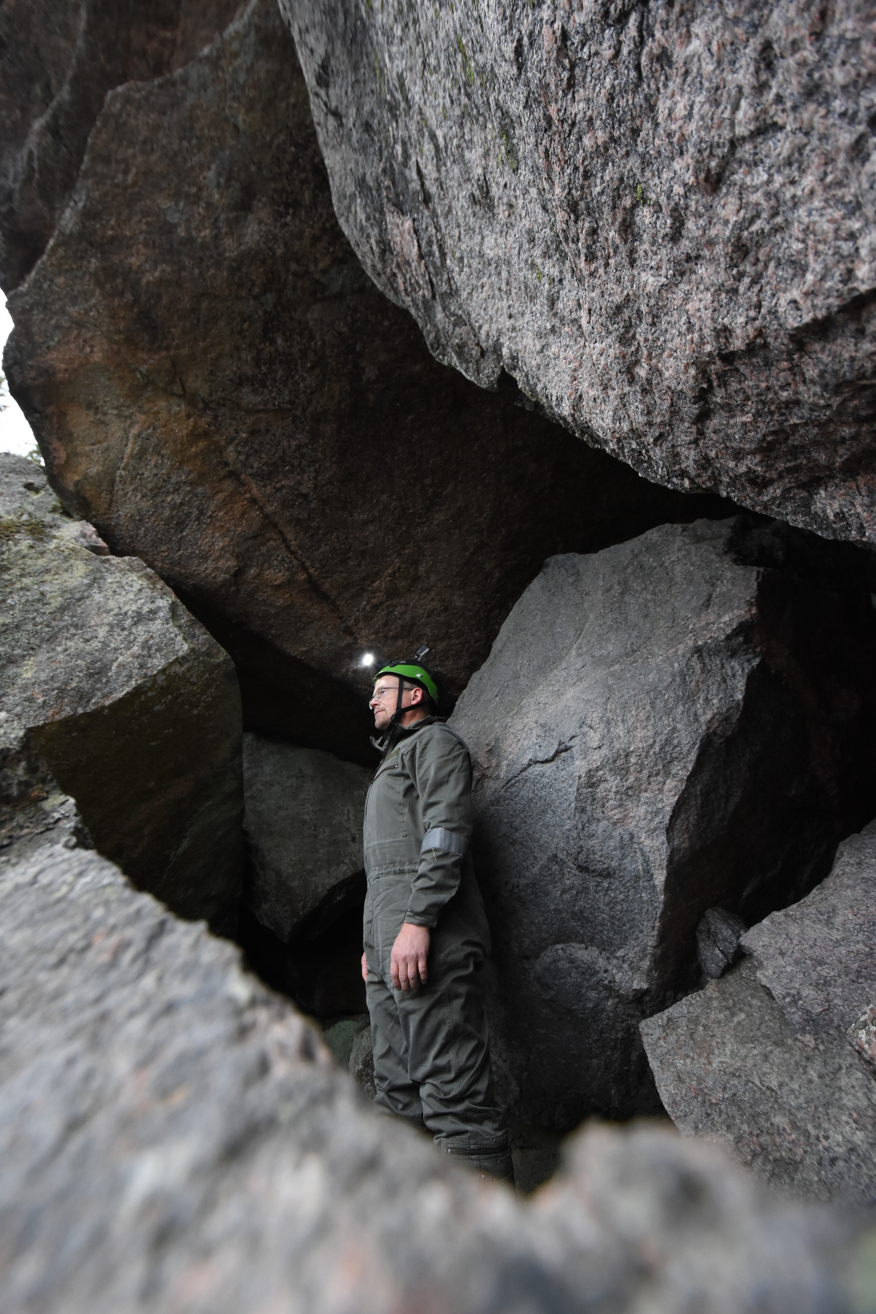 Korkberget cave consists of eight parts that we have named (perhaps slightly boringly) as Pääluola (main cave), Kirjastoluola (library cave), Yläluola (upper cave), Sivuluola (side cave), Onnenlohkareluola (lucky boulder cave), Vasuriluola (leftie cave), Takalippaluola (back lid cave), and Nenieteluola (this is the last part and the English translation would be "ecnartne" or the reverse of "entrance").
