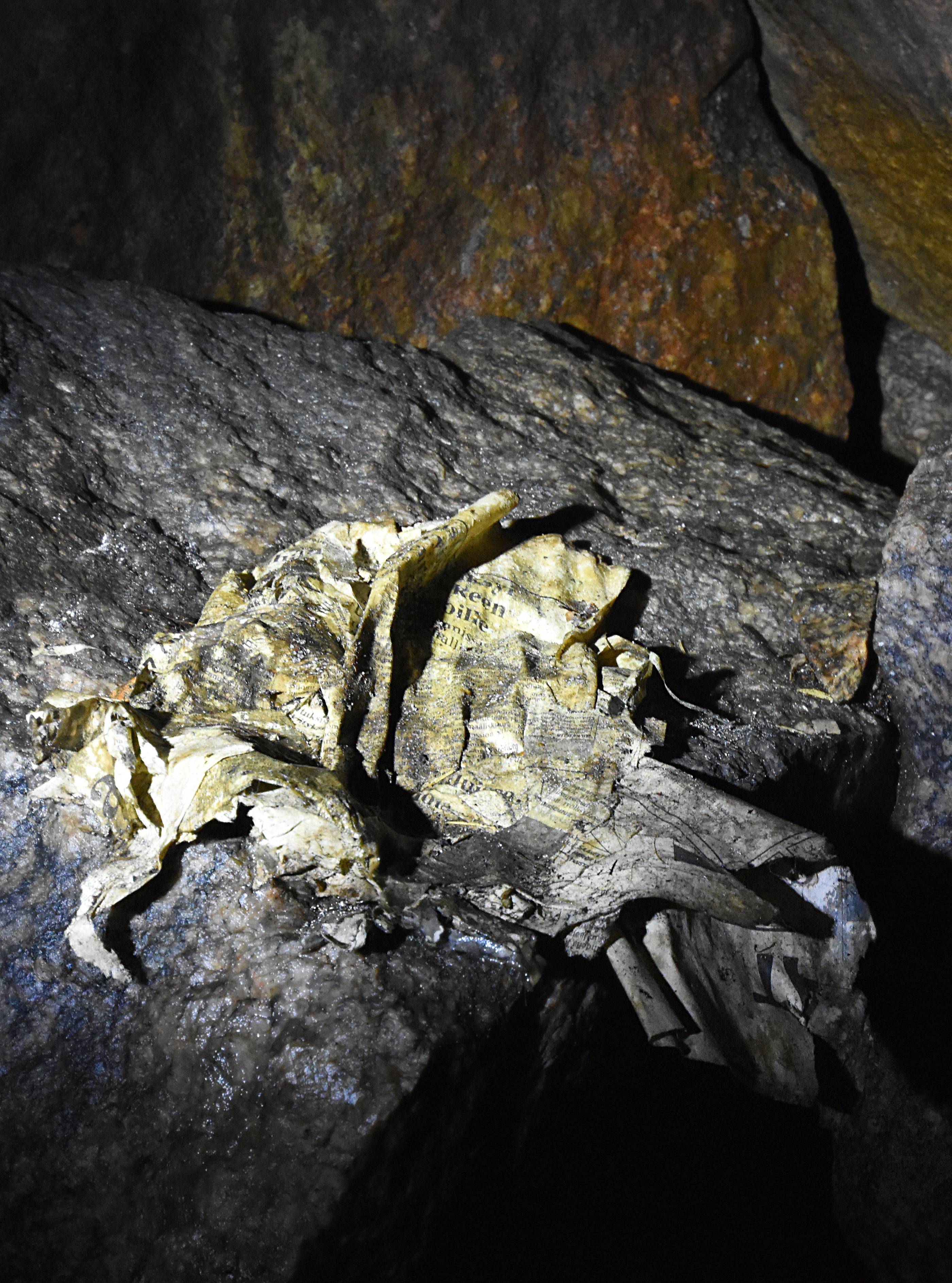 The various halls and passages have names as well. Like the imaginatively named Sivuhaaran Alahaara (lower passage of the side passage). But for instance, in the library cave there's a Lehtisali (magazine reading room) hall with somebody's newspaper from 1994 on the floor. To exit the library cave you'll take Lohkareliukumäki (sharp boulder slide), where the name is an indication that the path is not easy. The entrance from the lake is via the Venevaja (boat house) passage. The path that we found from the main cave towards the boat house is called Tie Tuonpuoleiseen (road to the afterlife). And the wet, smelly and boringly named Allas 2 (pool two) passage leads to drier and more interesting Salaisuus (secret) hall. And there's also Luolaseuran Reikä (Cave Society's hole), named after visiting friends from the caving society promptly went through this very narrow crack that Janne and I still today have not dare to enter.