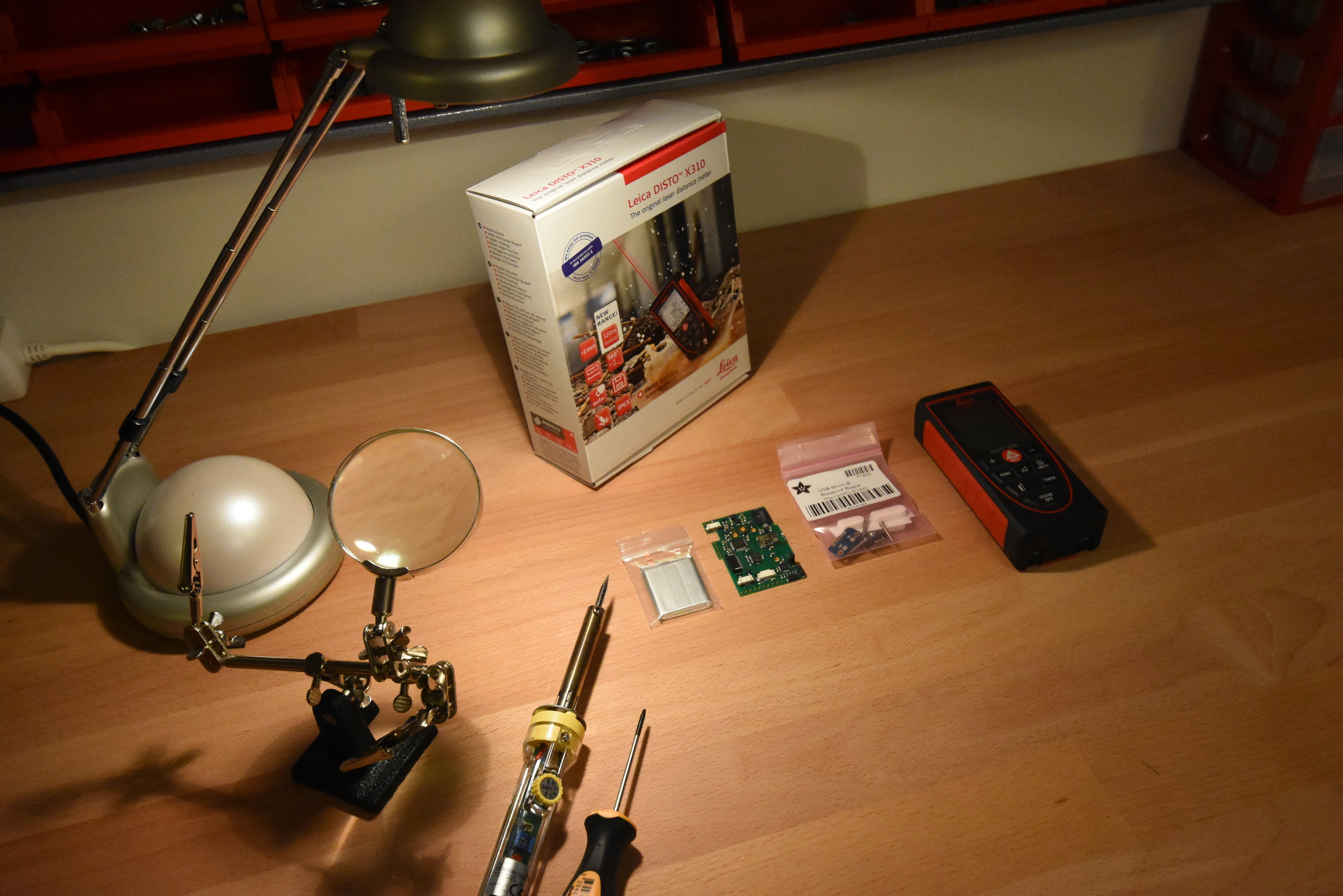 The base for the hacked device is a Leica Disto X310 laser measurement tool. In addition you'll need a new non-ferromagnetic battery, a new motherboard, and replacement parts for all other metallic parts (screws etc). The costs for the device without shipping is around 500€. More information about this tool can be found from http://paperless.bheeb.ch.