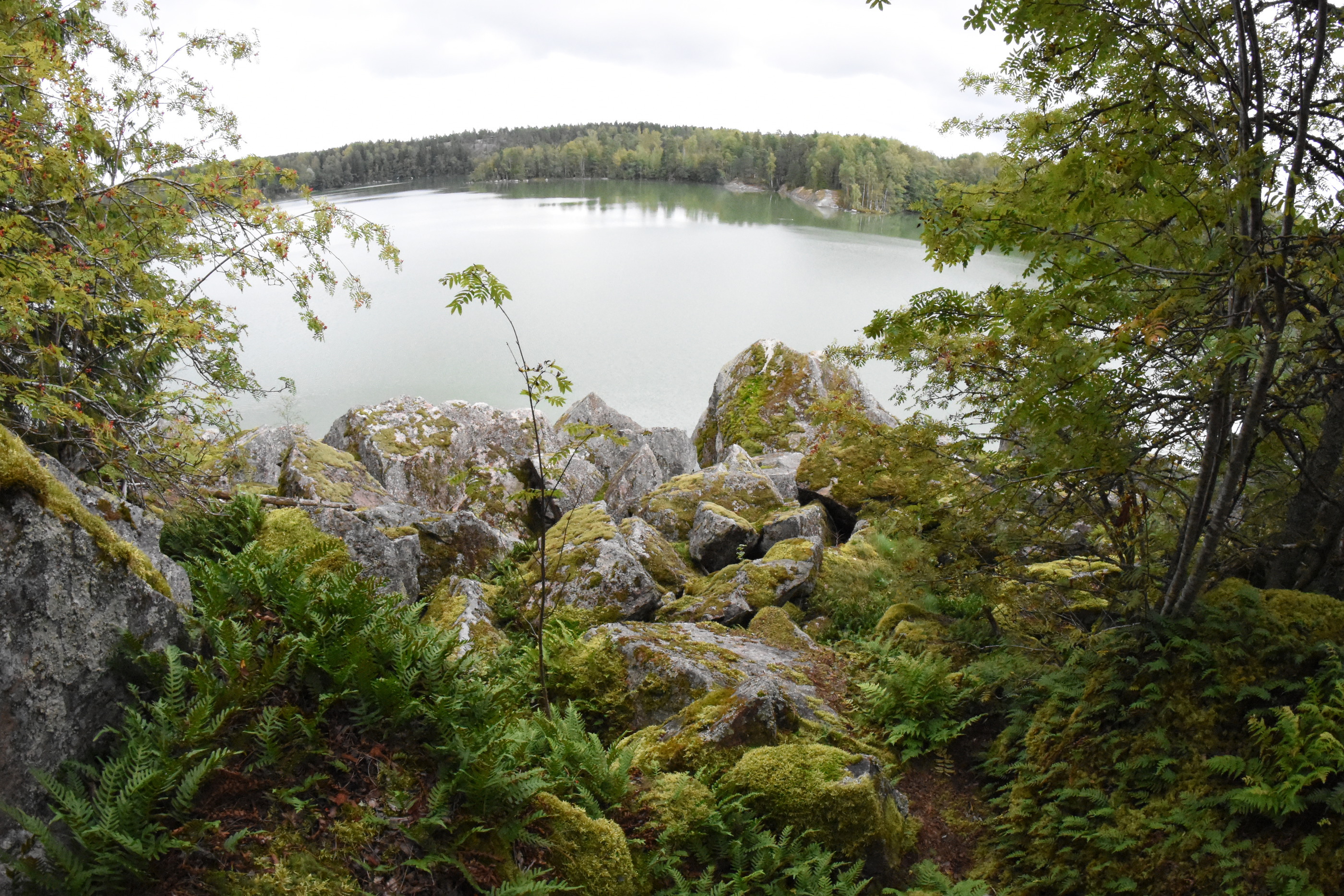 A view from the top of the Korkbergetin cliff towards the lake and the cave: