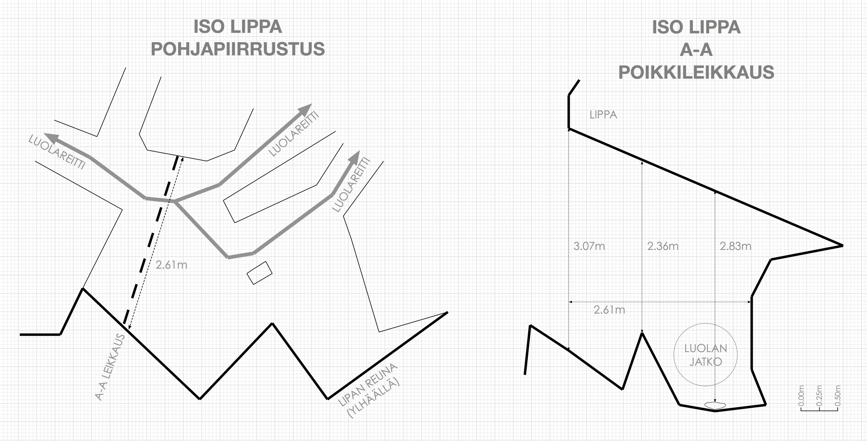 The Vasuriluola and Nenieteluola are connected by a huge boulder roof, covering the area where one goes from the Halkaisu- (split) or Jumi- (stuck) passages to the Rako- (slit) passage. The whole area is clearly under the big roof, for several meters, but the roof is slanted upwards and high up, so the area is spacious and open. The roof is called Iso Lippa (big lid):