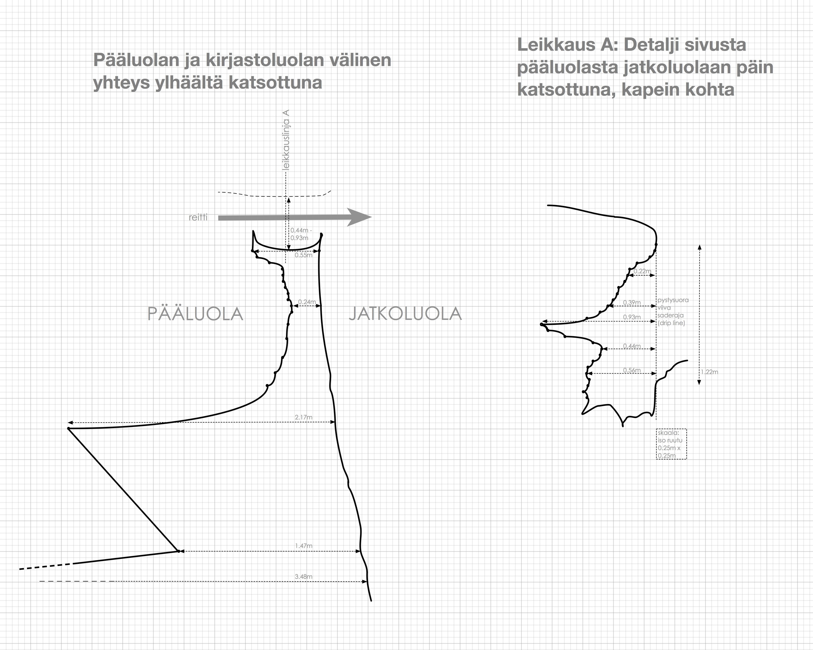 The seven parts are all clear caves, but the connections between them are a question mark. Some of the connections are under a roof but open to the side. For instance, the Pääluola is covered by a huge rock roof and is clearly a cave, but when it connects to the Kirjastoluola the roof narrows. You can pass through under the roof, but the roof covers only 44 cm from the wall. After the 44 cm there's a narrow crack open to the sky between the two caves. In any case, even here you are under the dripline, if you fit in 44 cm. Here's a drawing of the place as seen from above: