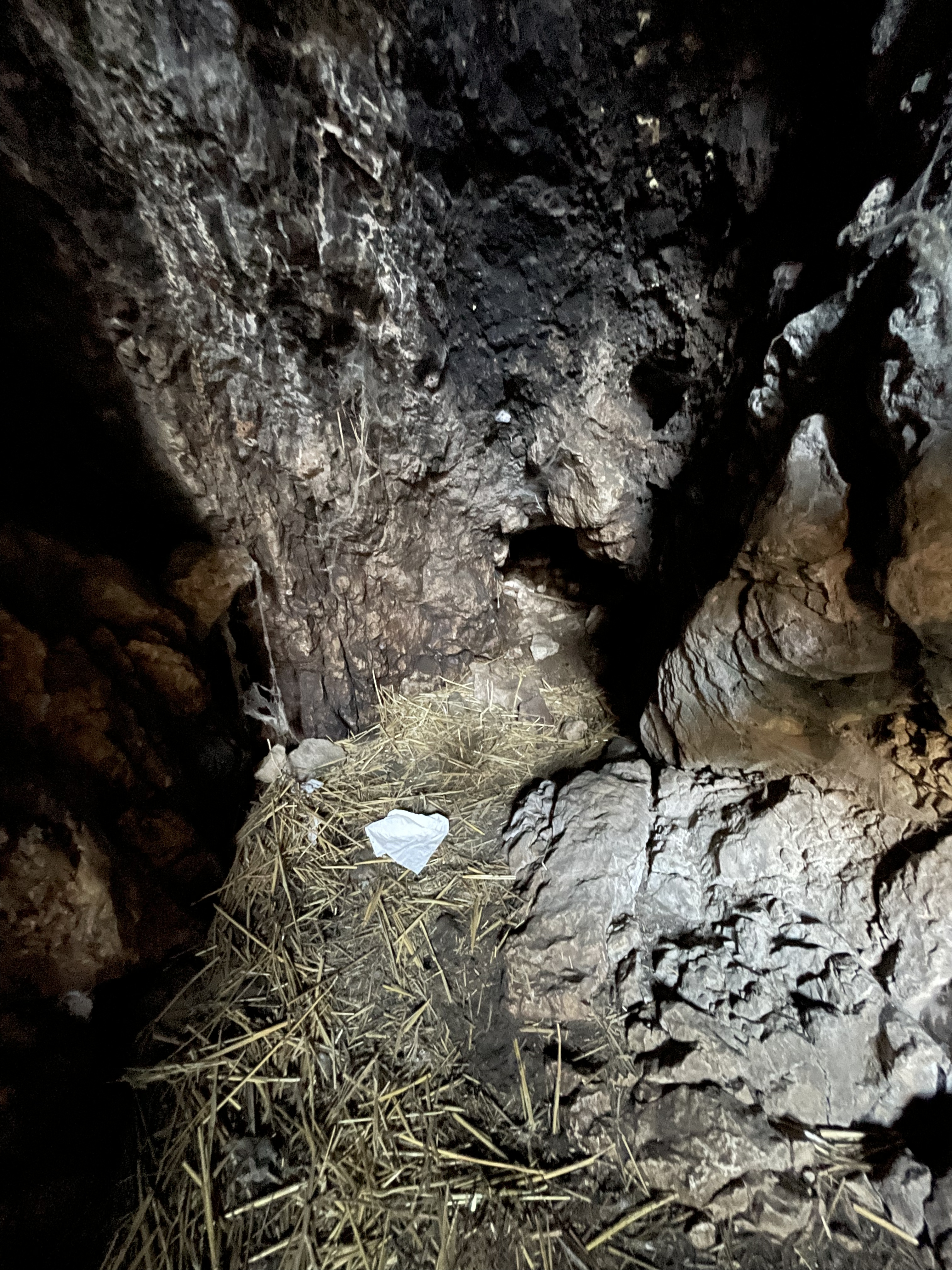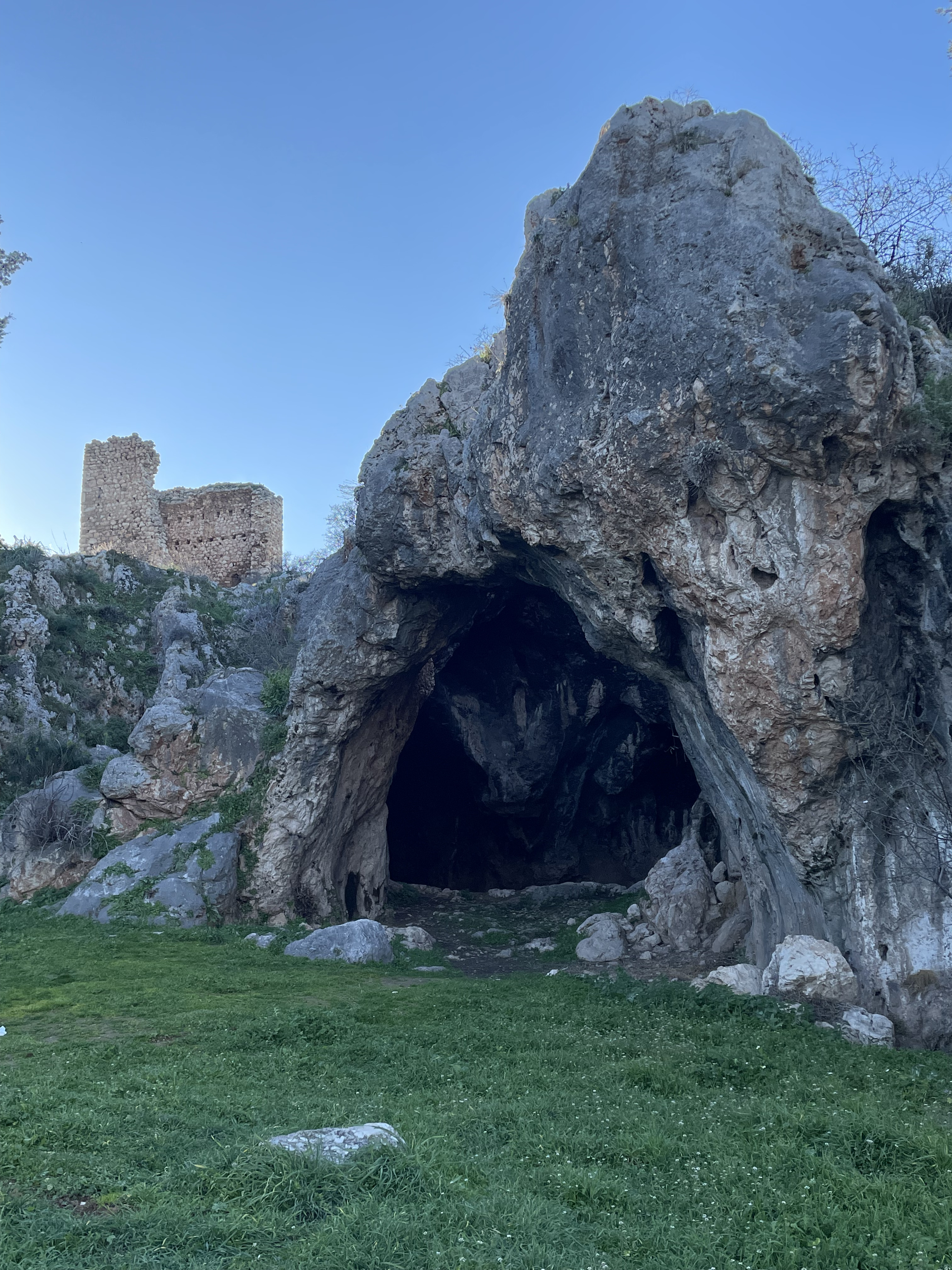 There are several caves in the rocky hill that the tower sits on. The largest one is by the road, with a large entrance opening, a large hole in the roof as well, and a smaller "window" to the side. The cave is about 25 meters. At the end it narrows down to a small crawlspace, which I did not crawl, but I'm not sure if it ended or led to the next door small cave hole in the hill face.