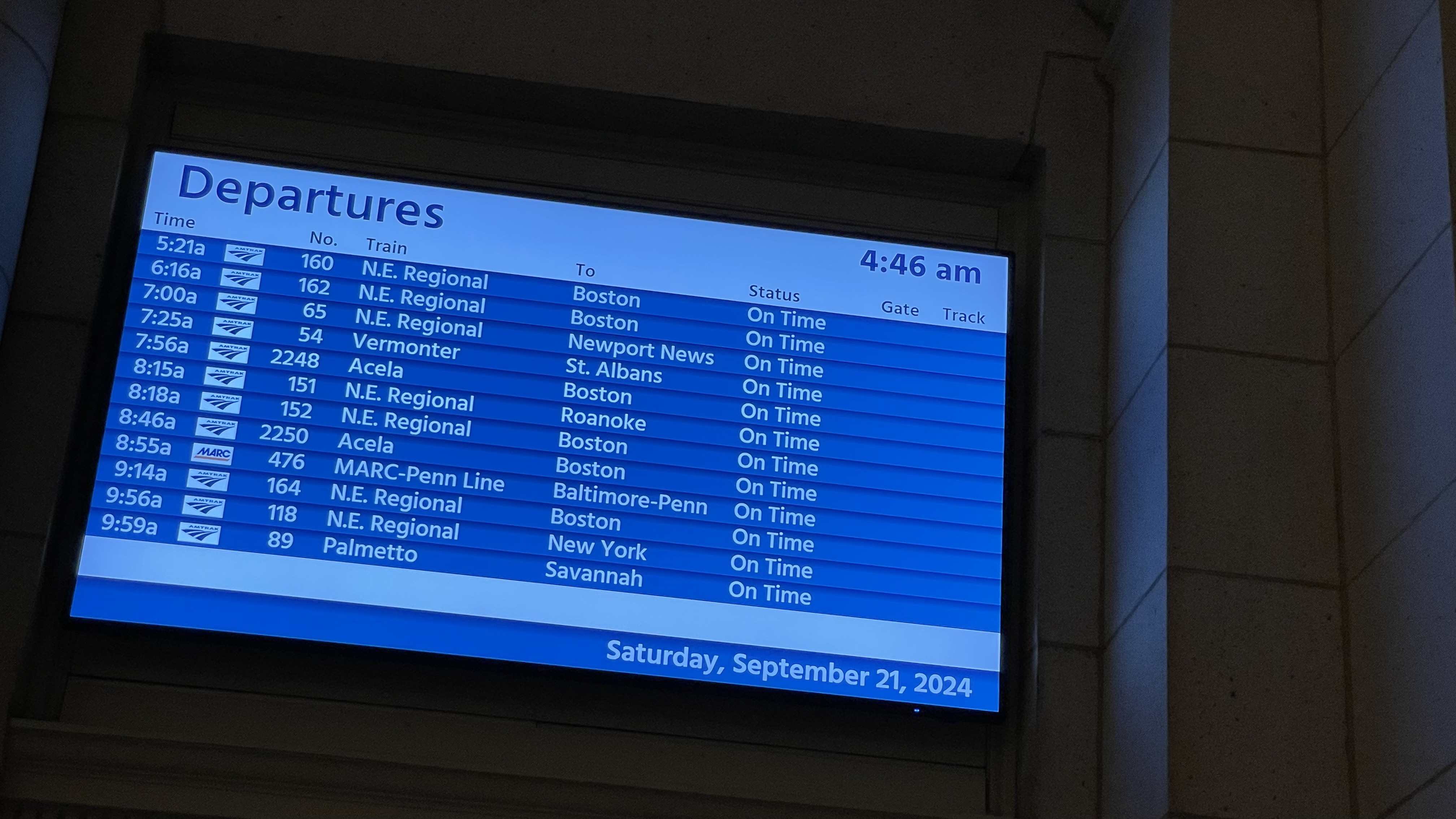 But two things are preventing me from enjoying this too much, just one run ... well a couple of additional ones. But I'm recovering from a major medical operation, and shouldn't exercise too much. And I'm also now starting to dream about this return train taking me back in time for my flights home … so I return the gear, change clothes and jump to another Uber back to the station, just in time for the last train that will take me back to DC in time: