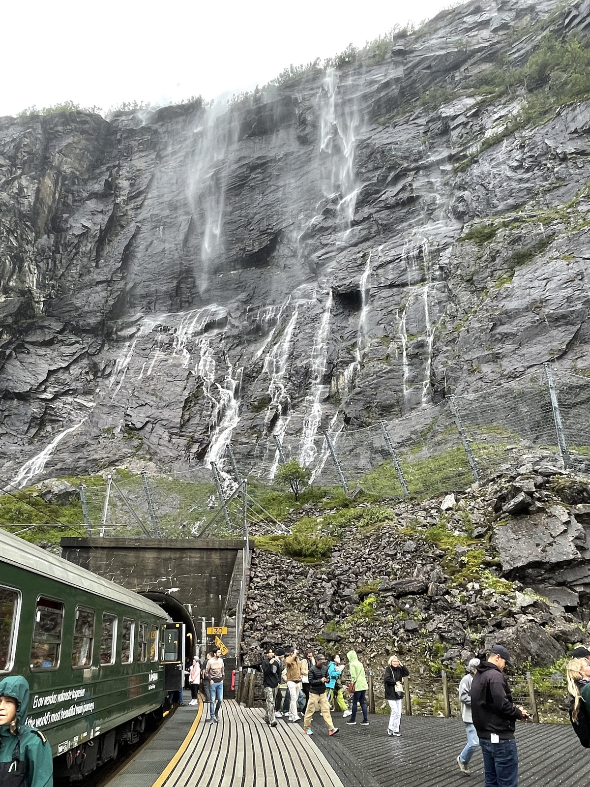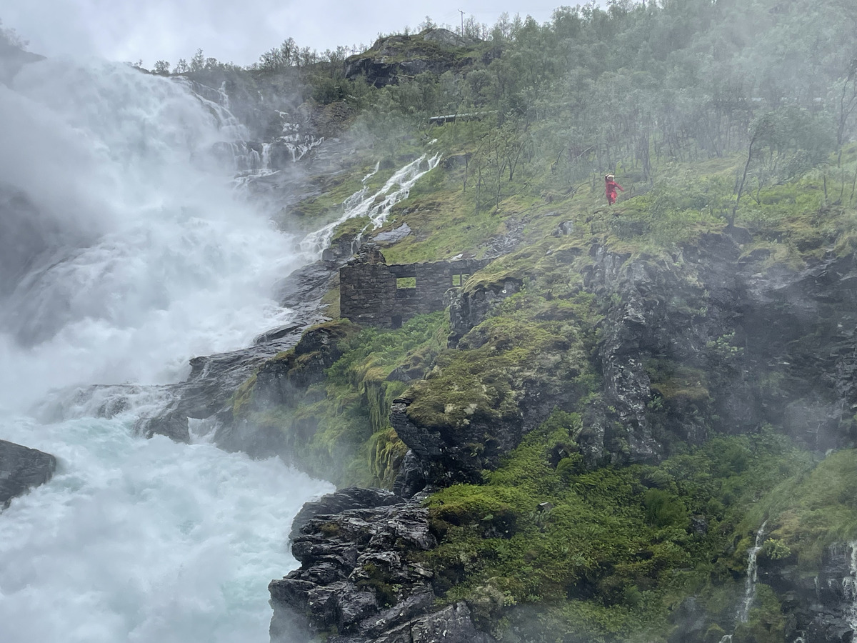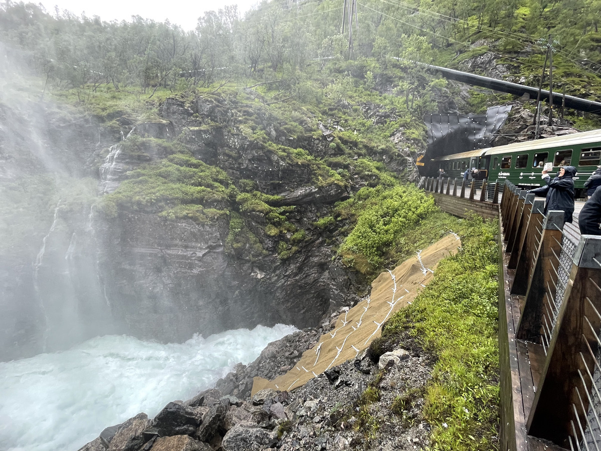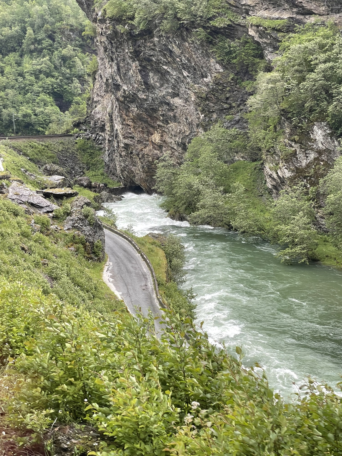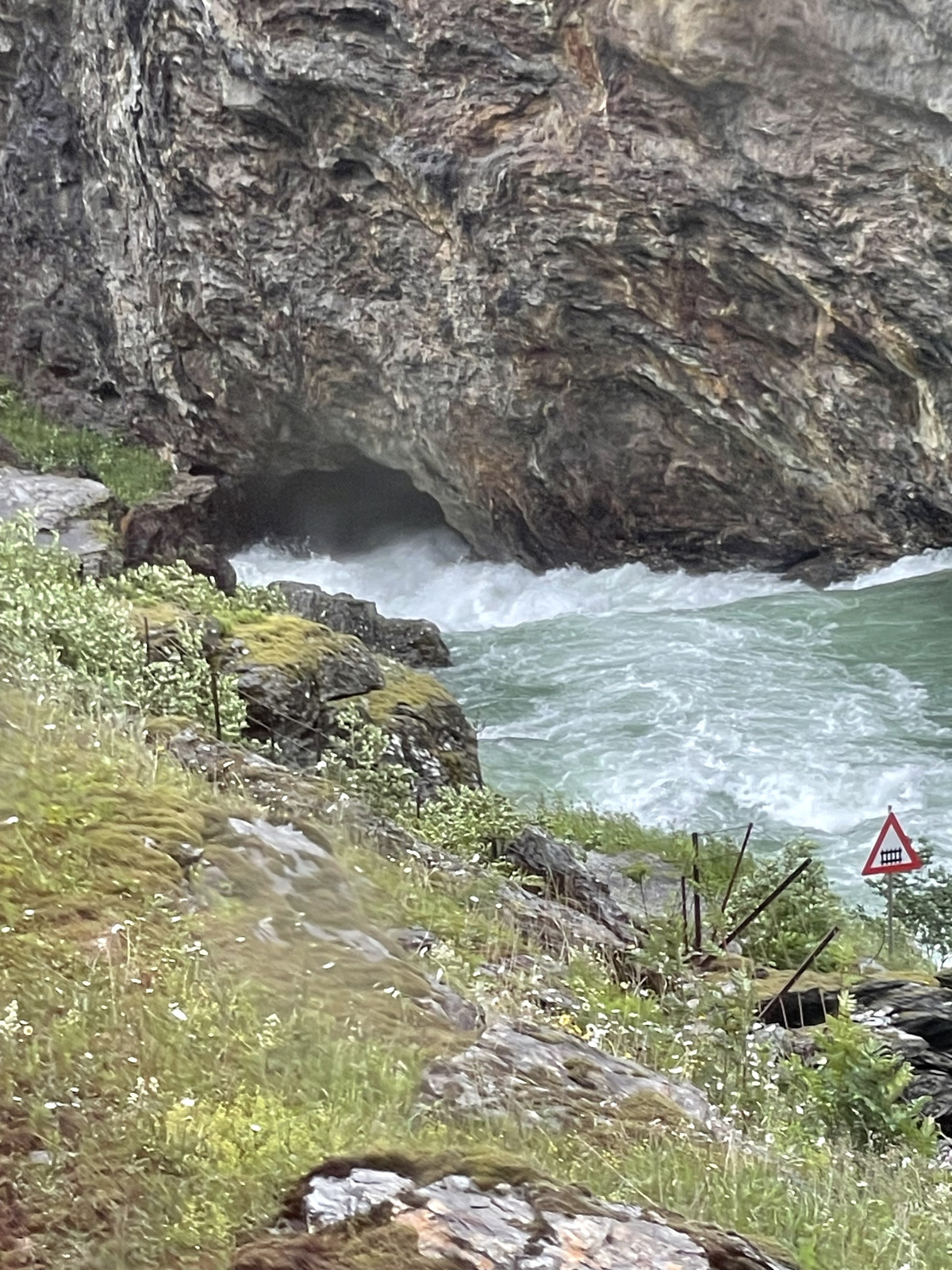 While going on the Flåm railway (see the other article), I noticed that on Google Maps there was a marking for a "cave waterfall", Grottefossen-Høgabru. I saw it briefly when the train drove by, the river entered the mountain and came out shortly thereafter on the other side. And there was an additional similar underground water flow after the Kjosfossen waterfall, under the station. These seem man-made, however, as in both cases the water is taking a different direction to bypass the station or the bank that the rails were on.