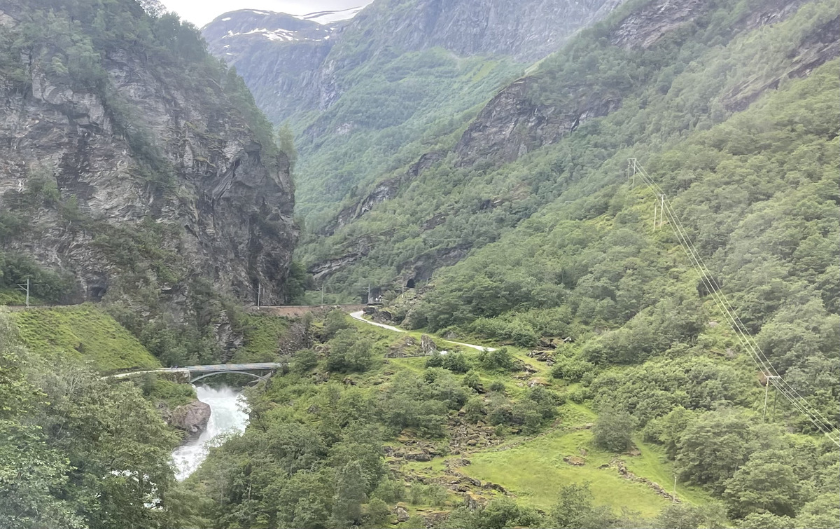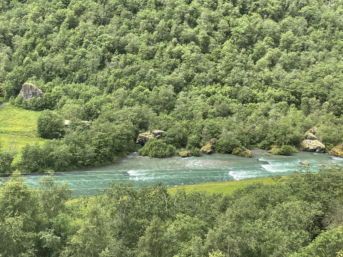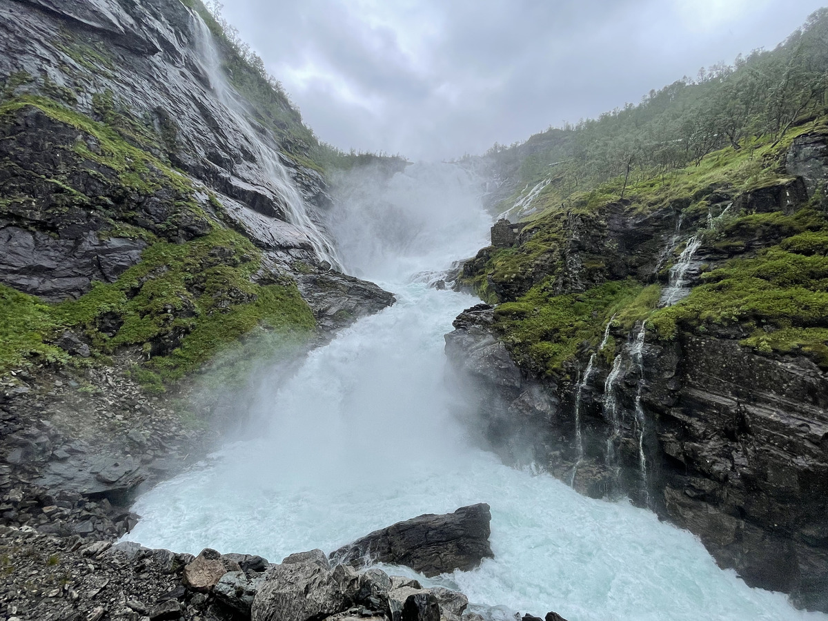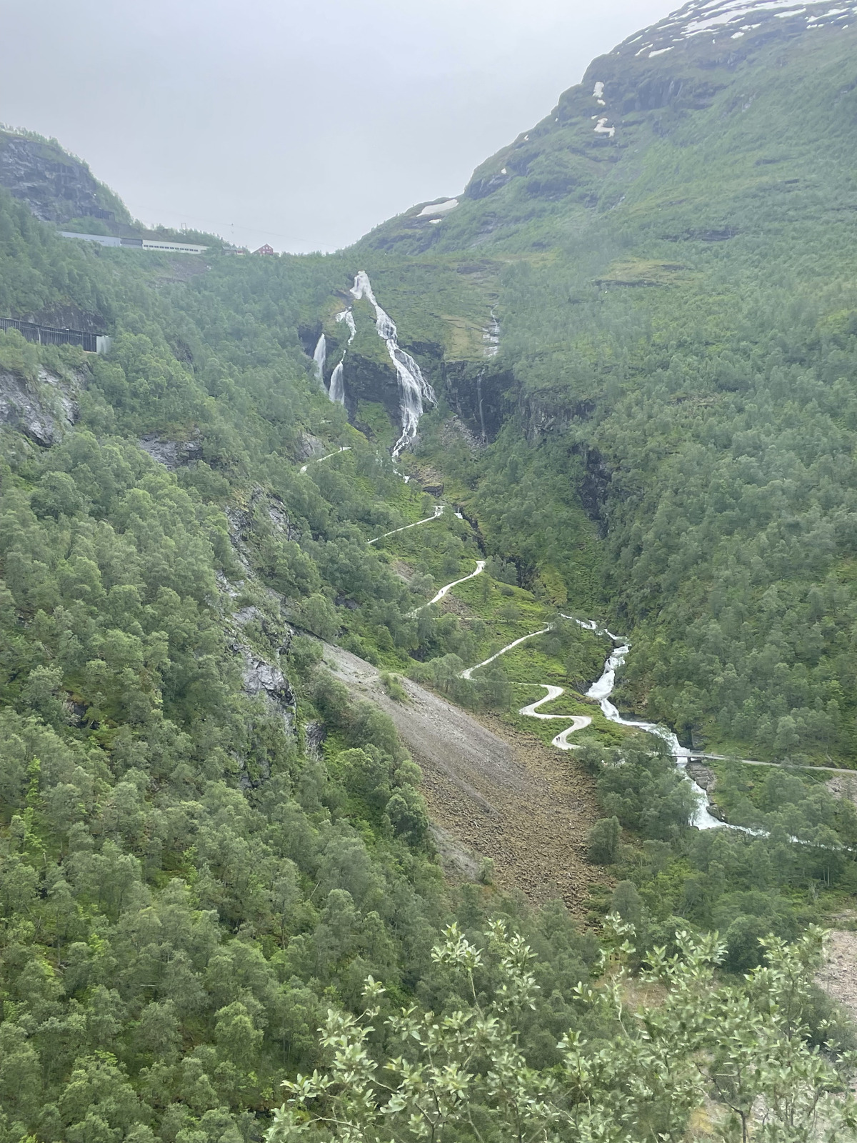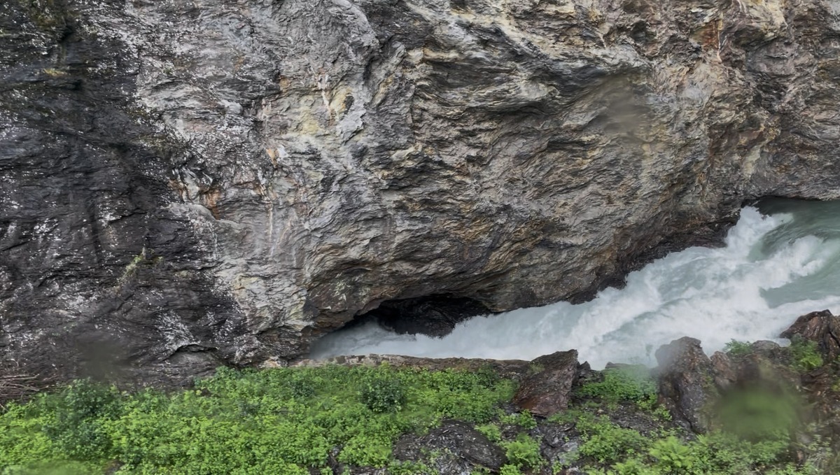 While going on the Flåm railway (see the other article), I noticed that on Google Maps there was a marking for a "cave waterfall", Grottefossen-Høgabru. I saw it briefly when the train drove by, the river entered the mountain and came out shortly thereafter on the other side. And there was an additional similar underground water flow after the Kjosfossen waterfall, under the station. These seem man-made, however, as in both cases the water is taking a different direction to bypass the station or the bank that the rails were on.