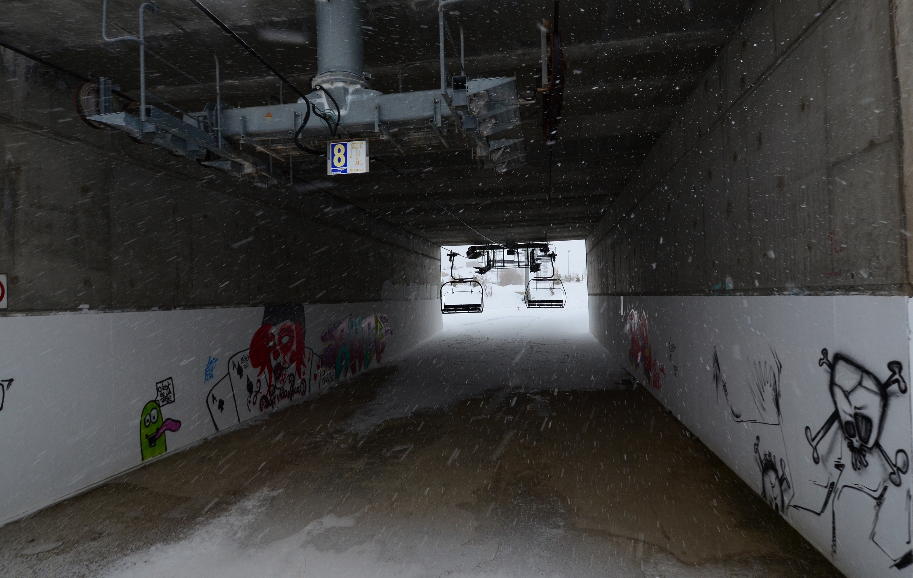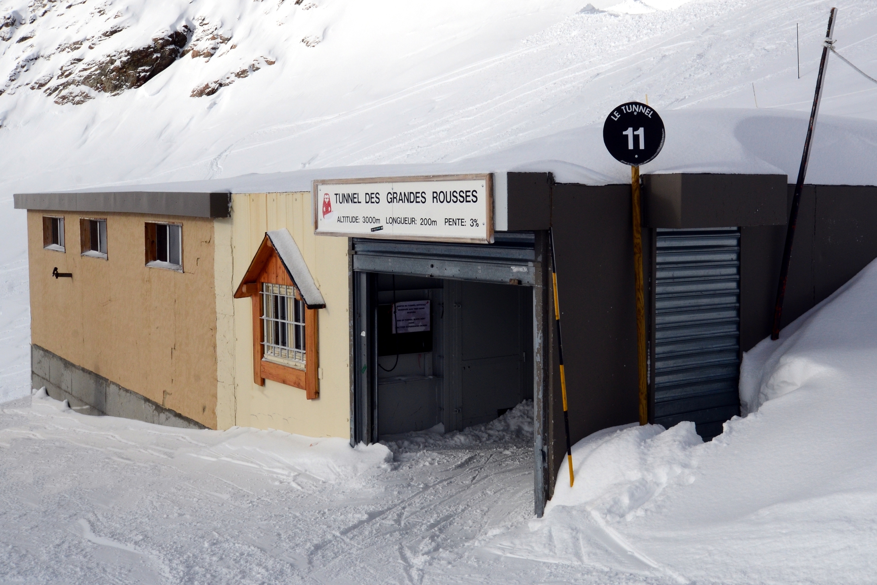 There are obviously plenty of tunnels to cross intersections or roads. Returning from the great after-ski at the Zoo Bar in Alpe d'Huez we spotted a skiable tunnel. (Hey! I had worked for twelve days straight before this weekend, so some after-ski was due.) It turned out that the tunnel is a route to allow the skiers on the Village ski run reach the lower parts of the village by going under a hotel.
